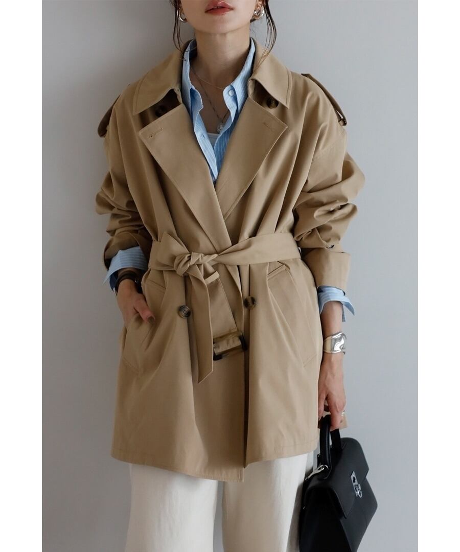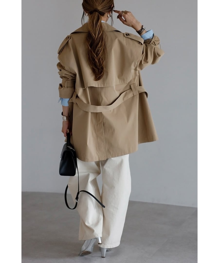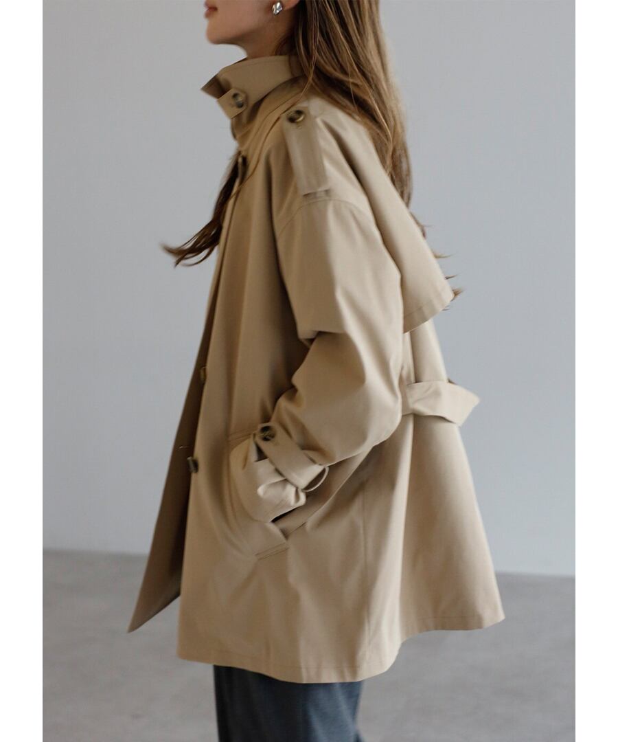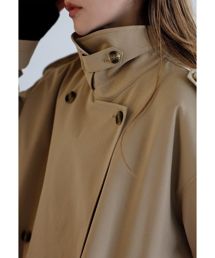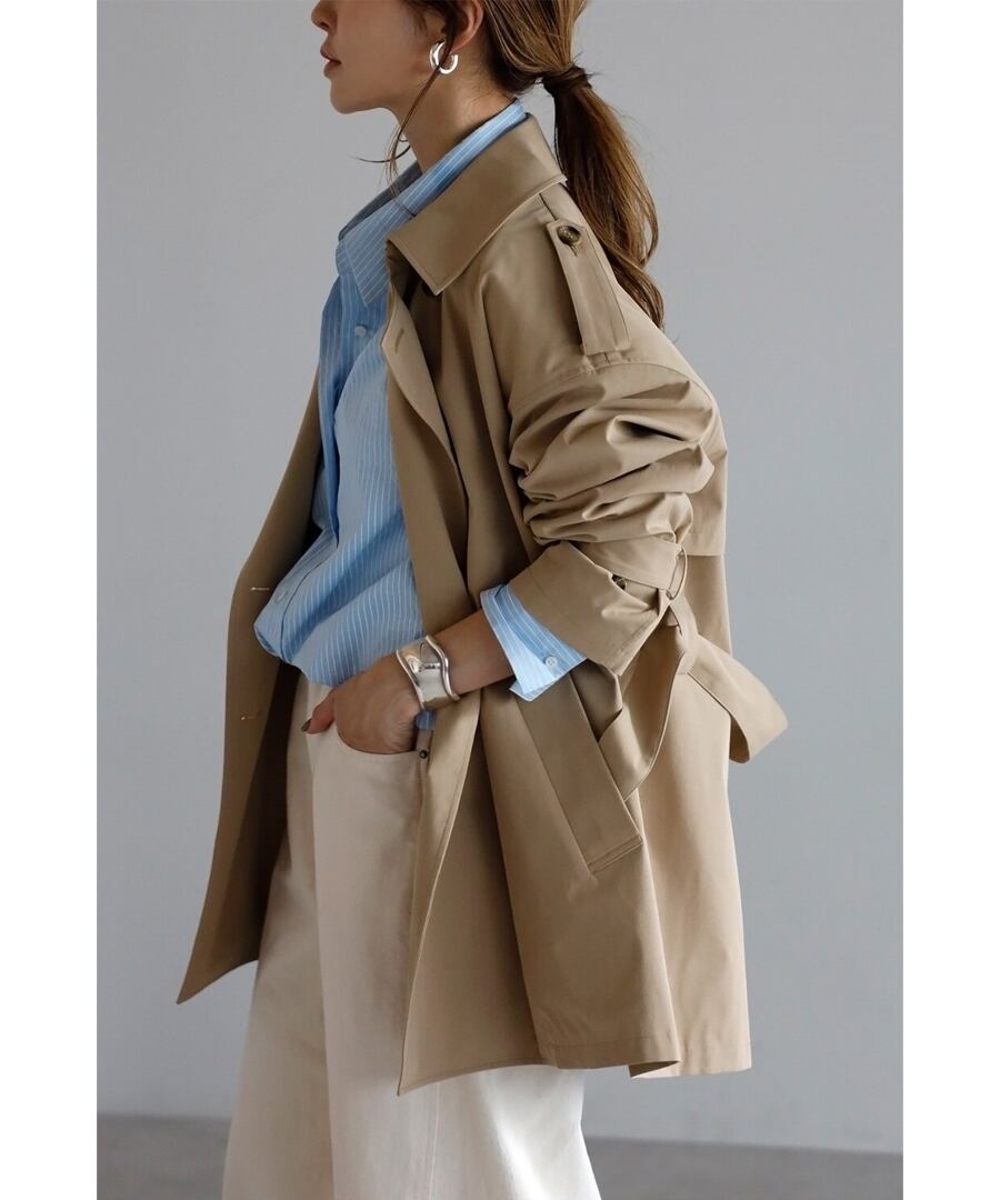 程よいハリを備えた素材が、美しい立体フォルムをキープするトレンチコート。