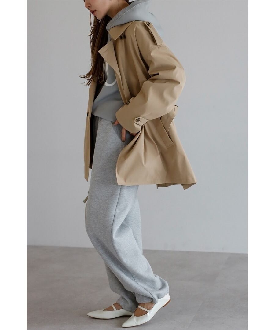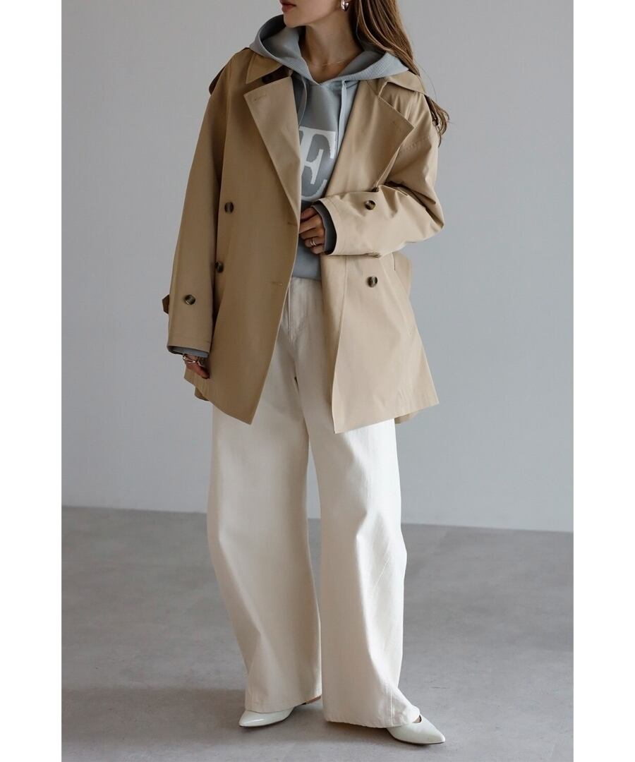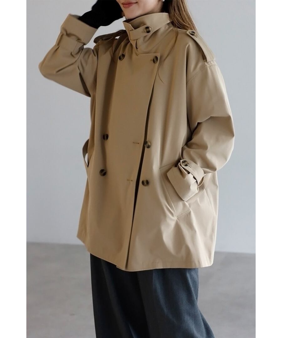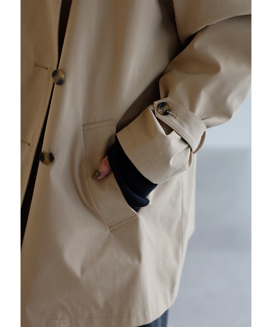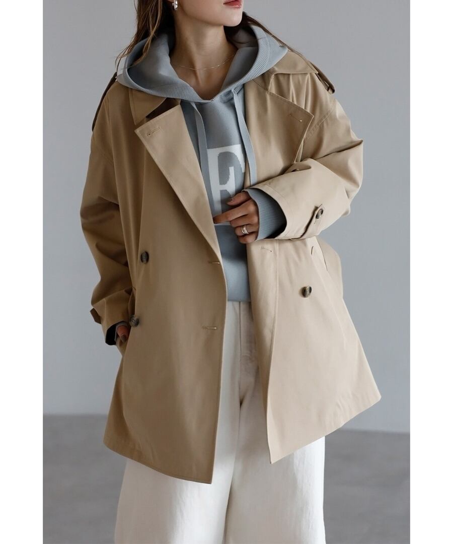 程よいハリを備えた素材が、美しい立体フォルムをキープするトレンチコート。