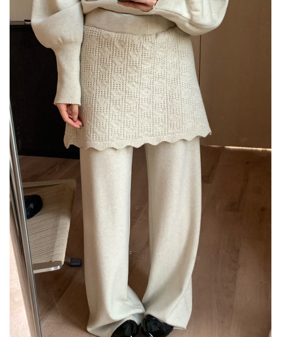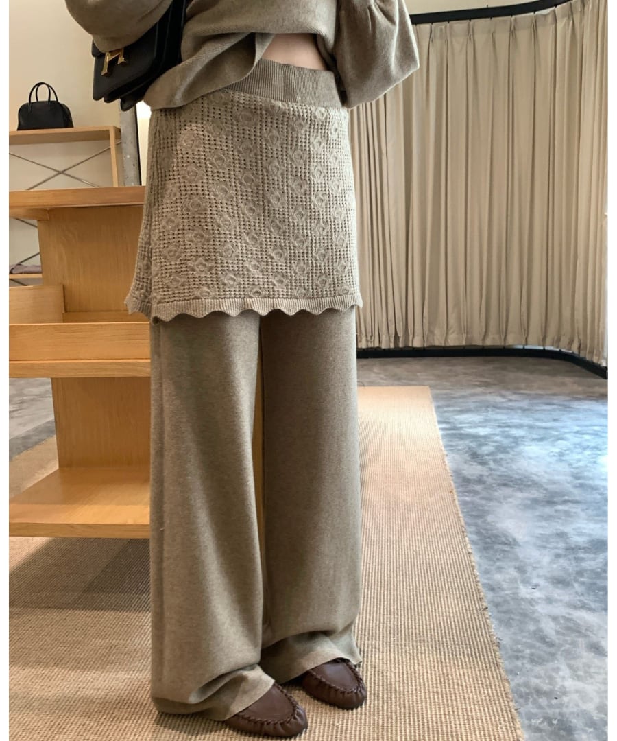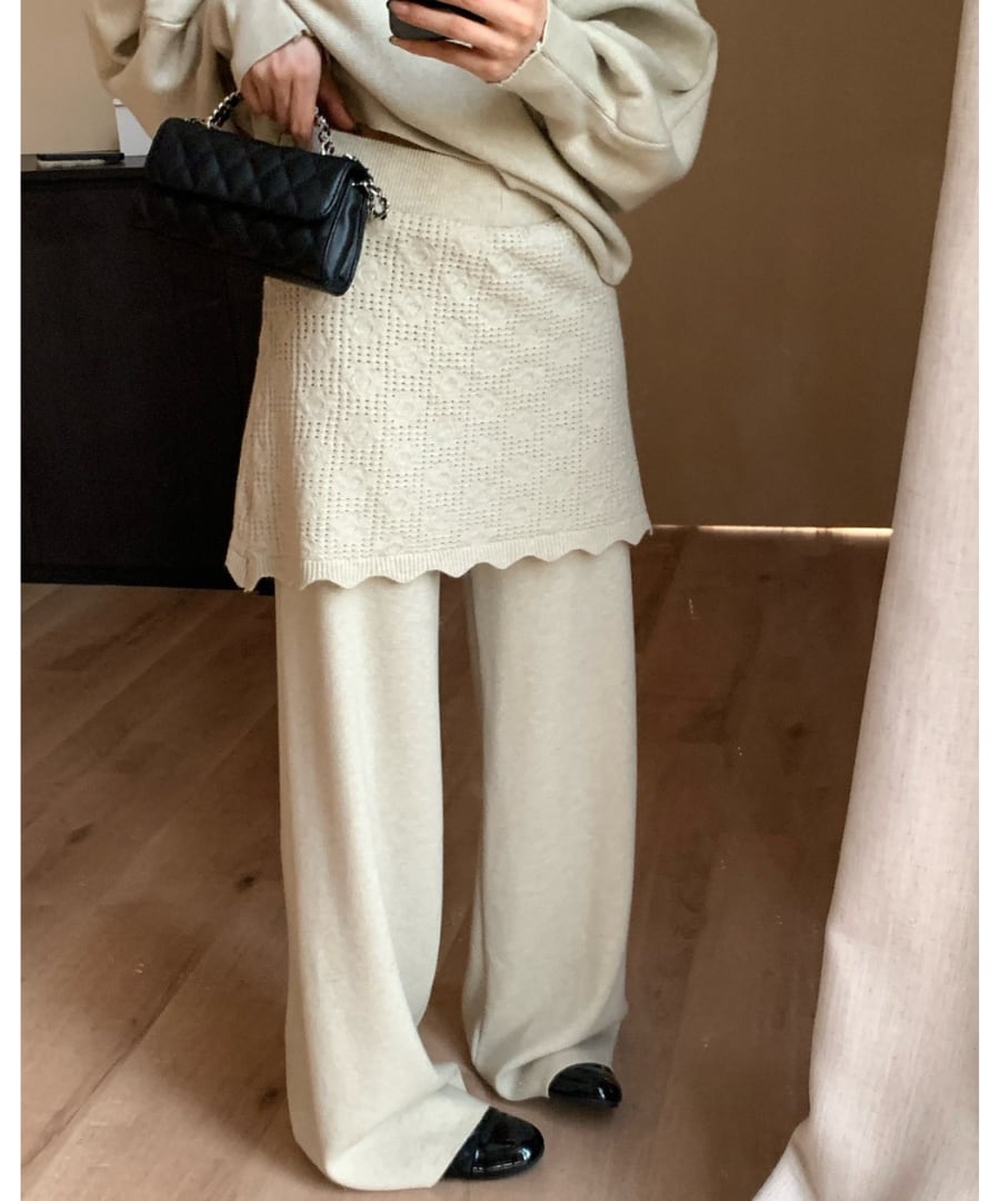 ウエストにラップスカートをドッキングさせた、ユニークなデザインのセミワイドパンツとトップスのセットアップ。