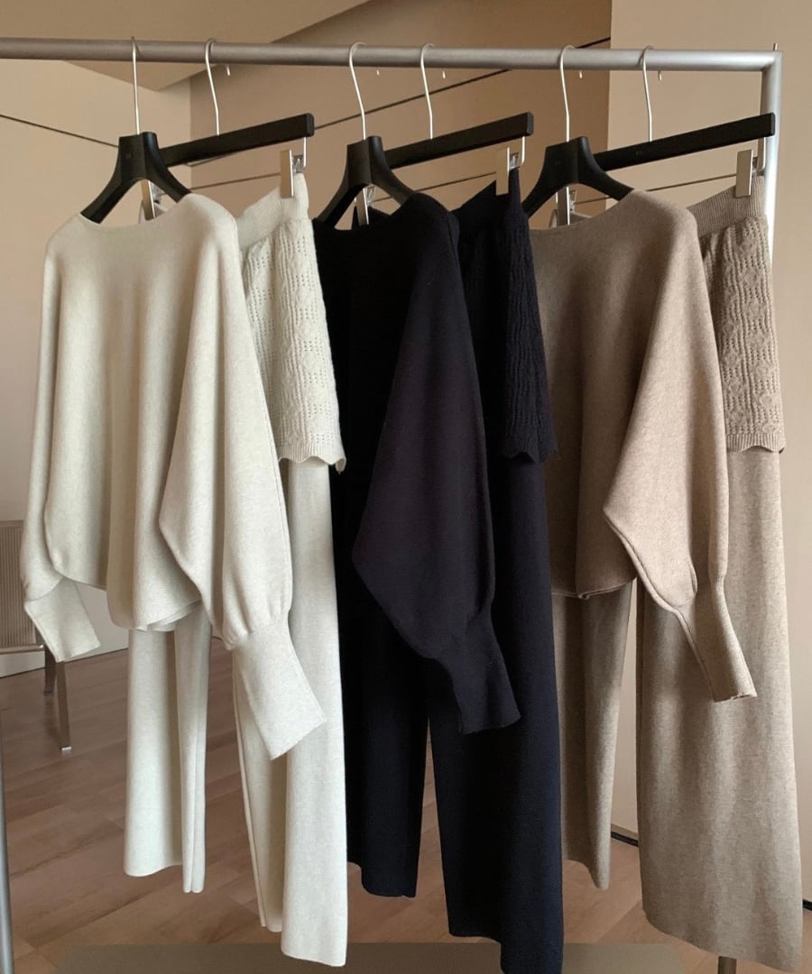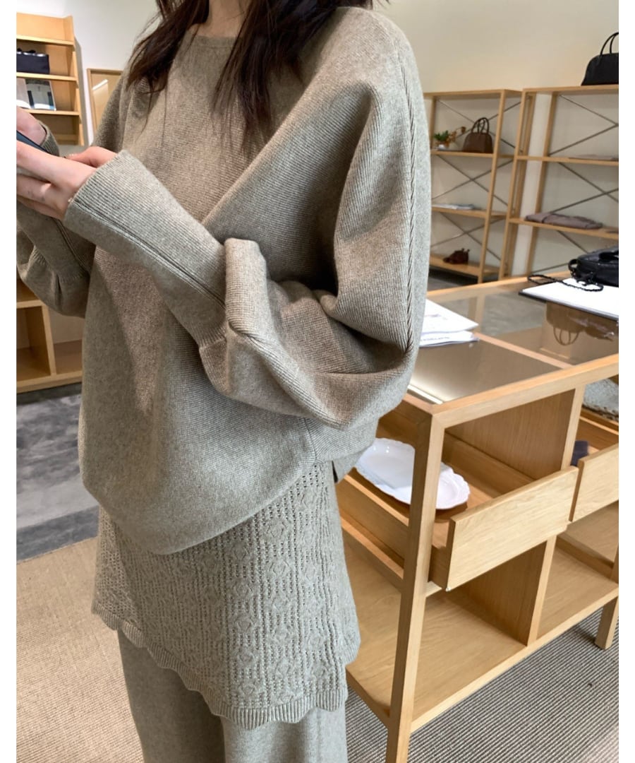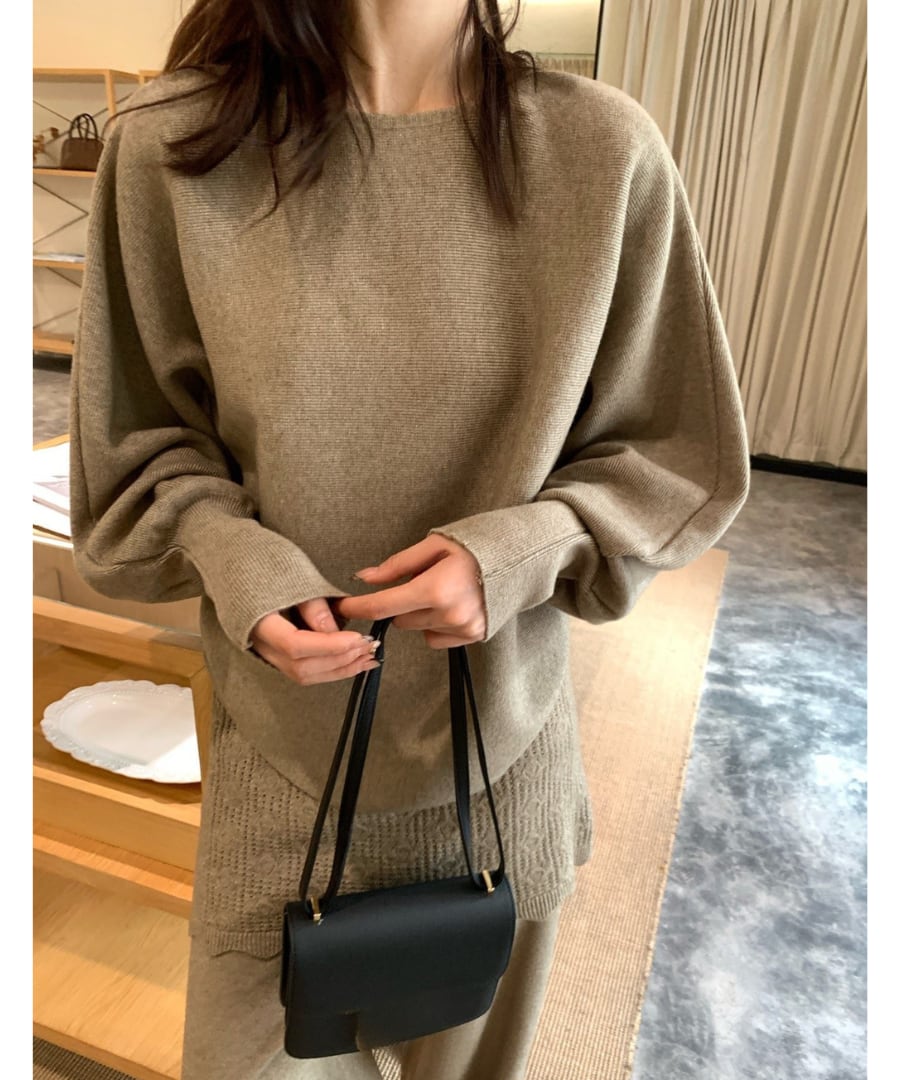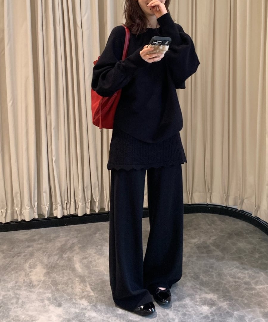 ウエストにラップスカートをドッキングさせた、ユニークなデザインのセミワイドパンツとトップスのセットアップ。