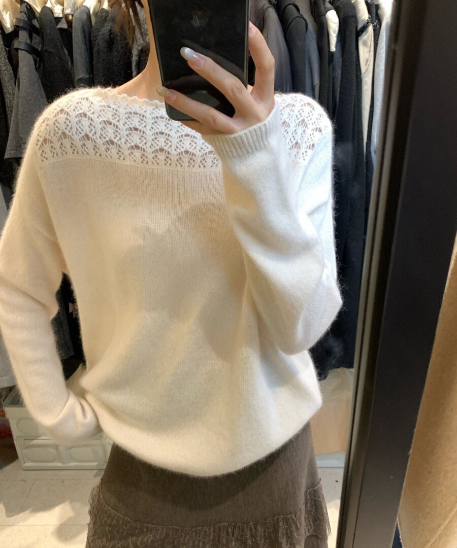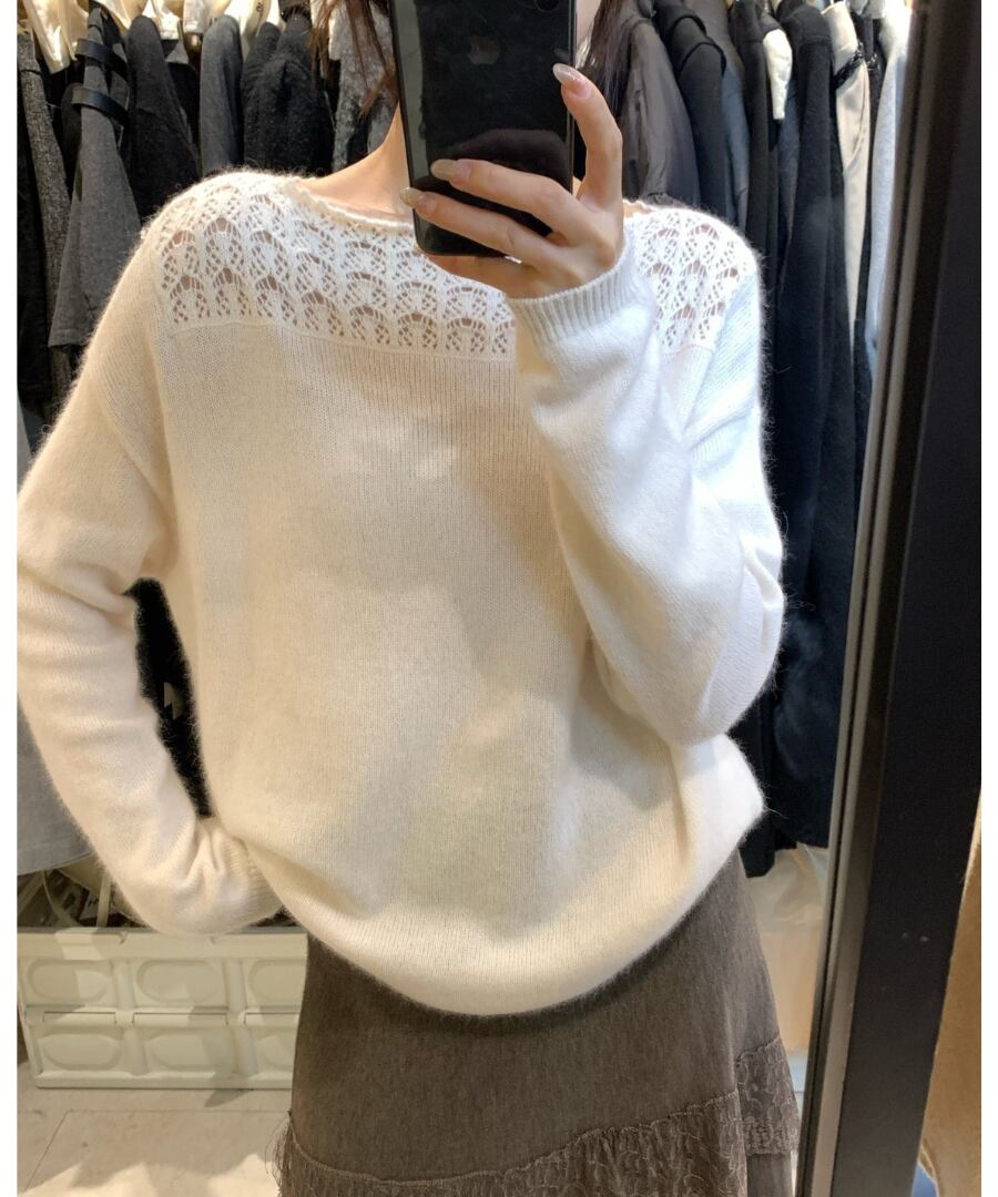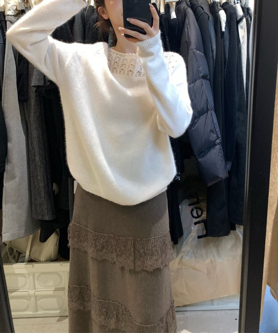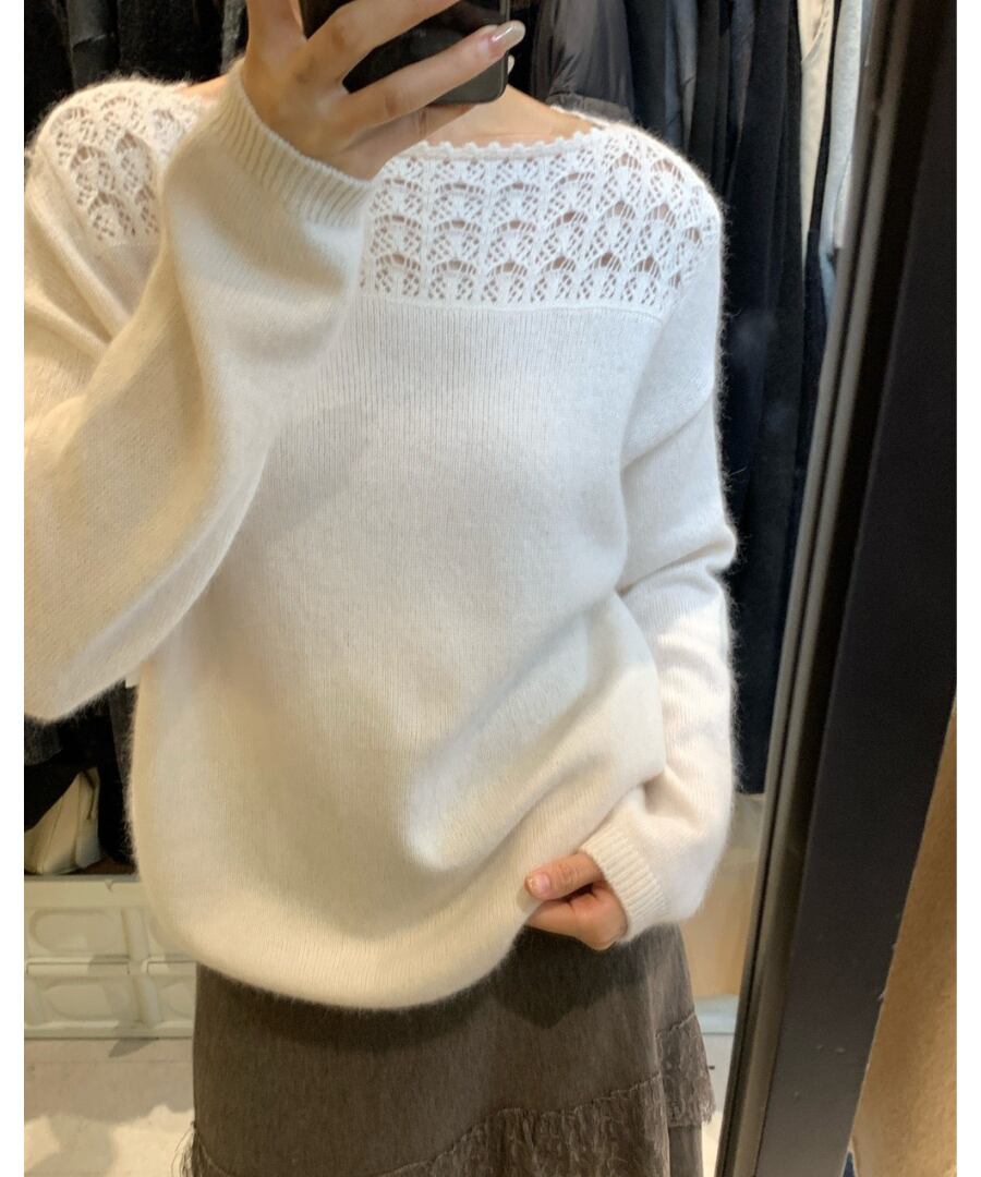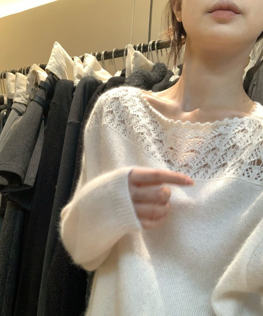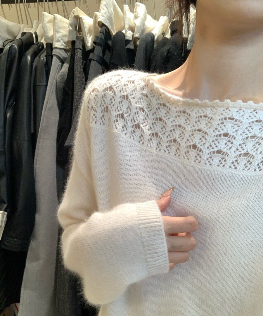 クロシェデザインが特徴的なニットトップス。