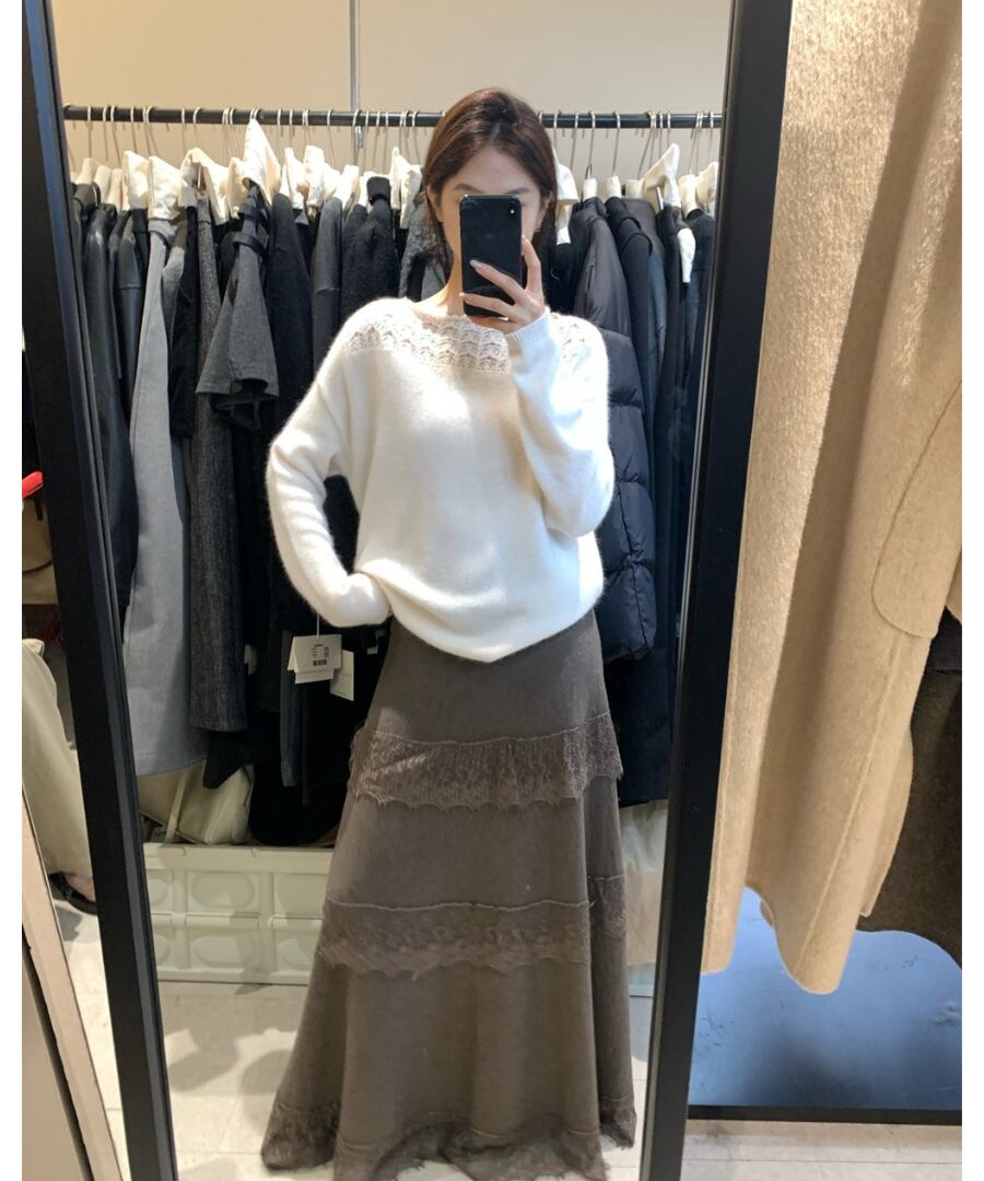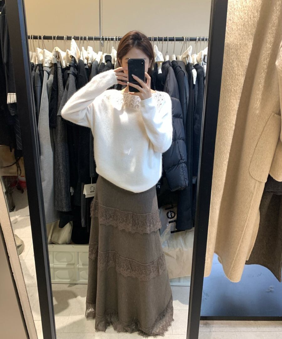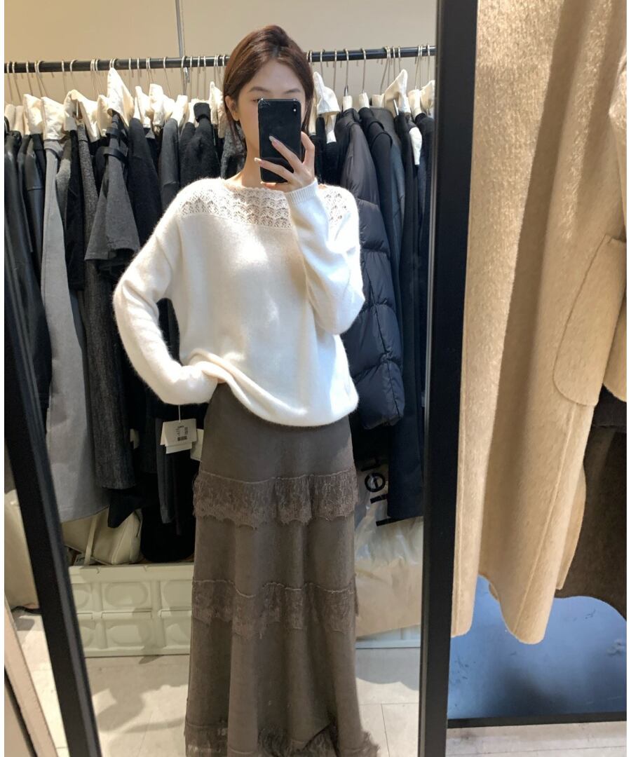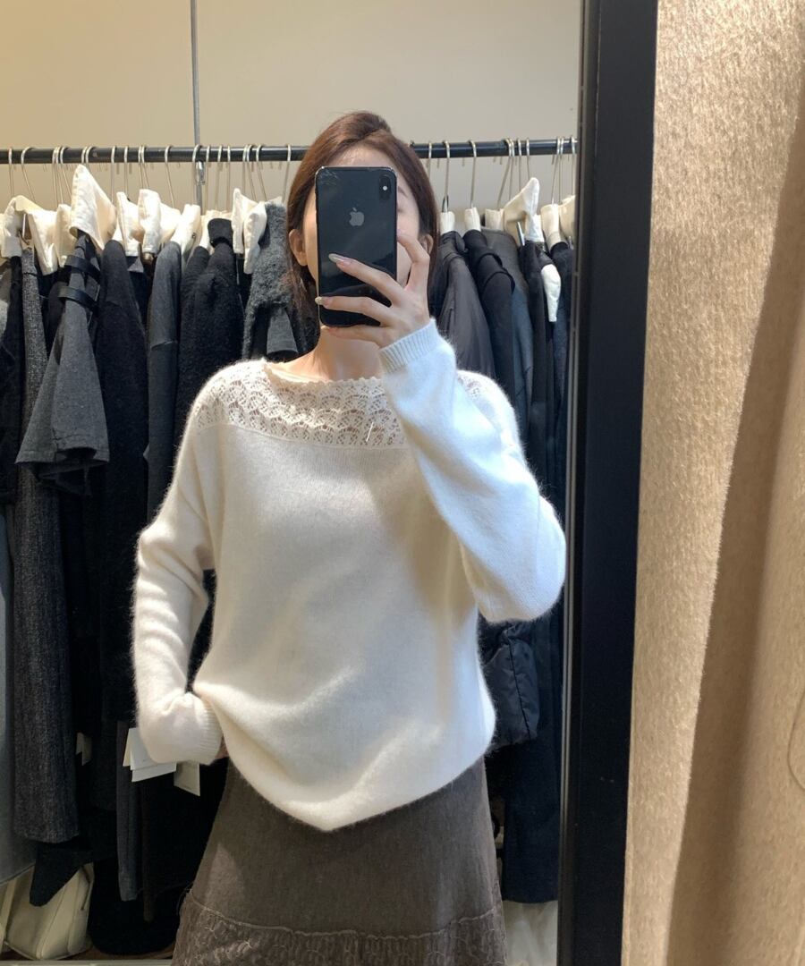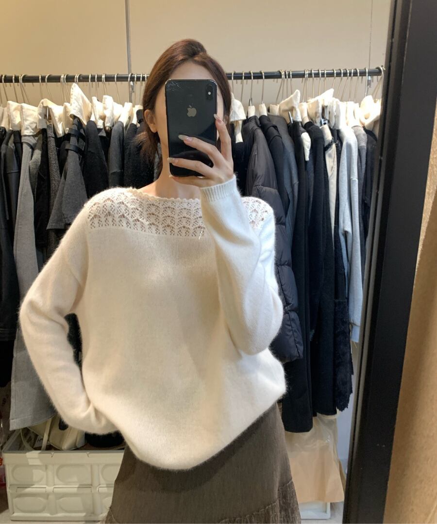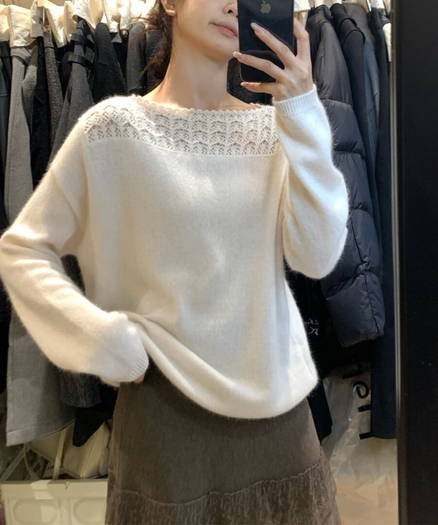 クロシェデザインが特徴的なニットトップス。