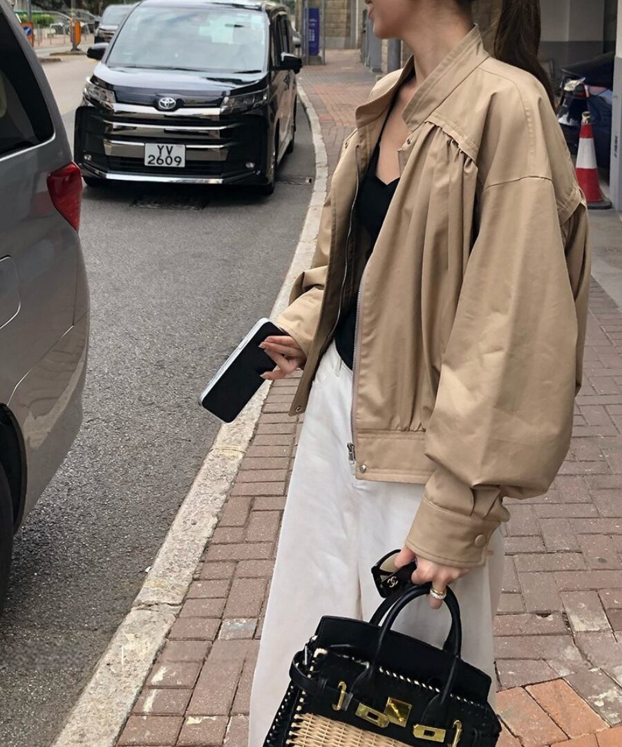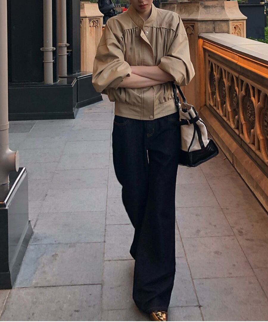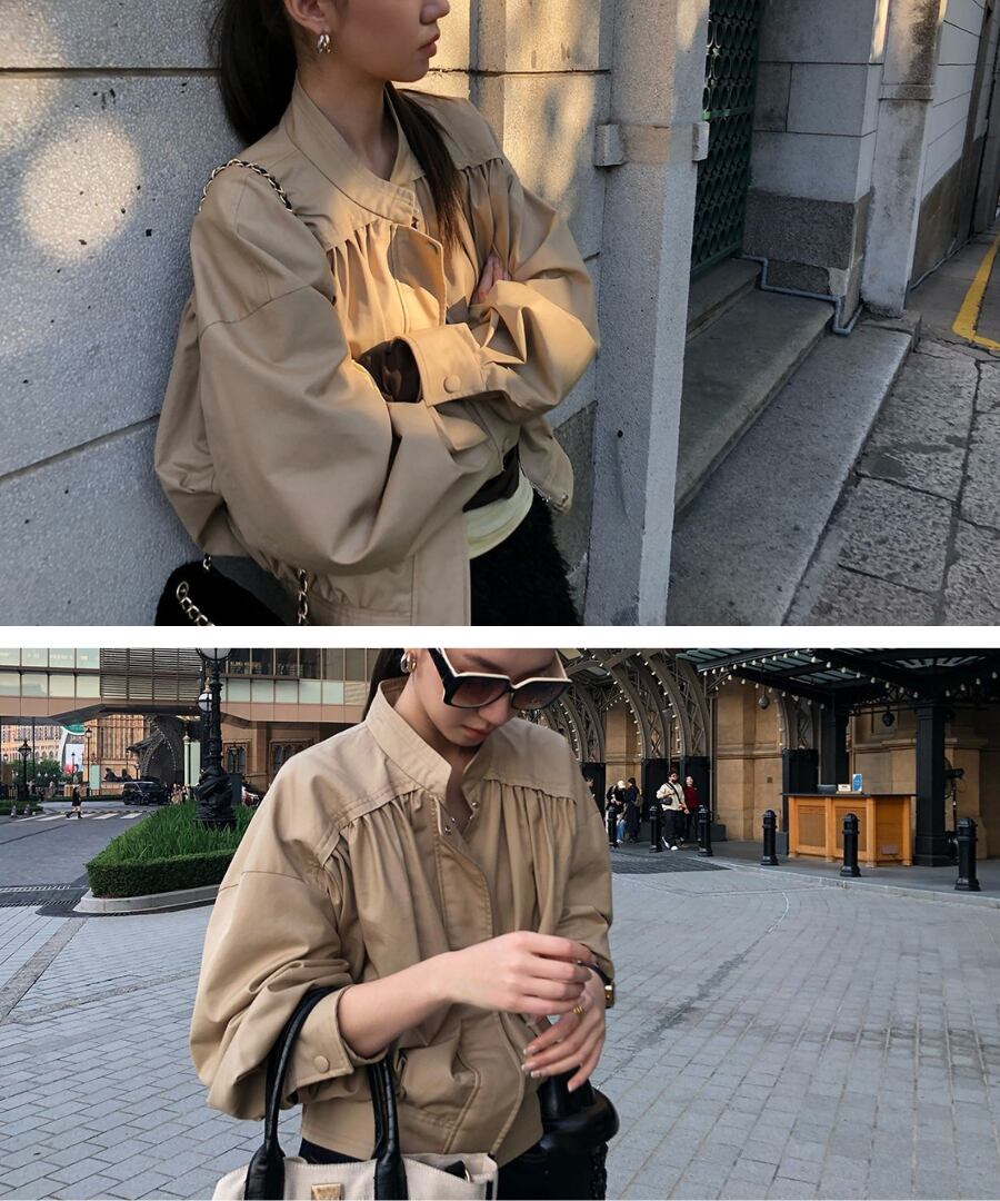 スタンドカラーとプリーツが印象的なブルゾン。