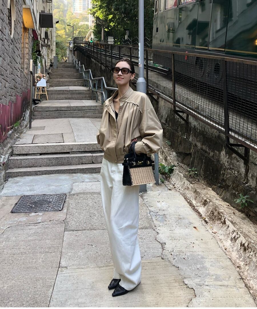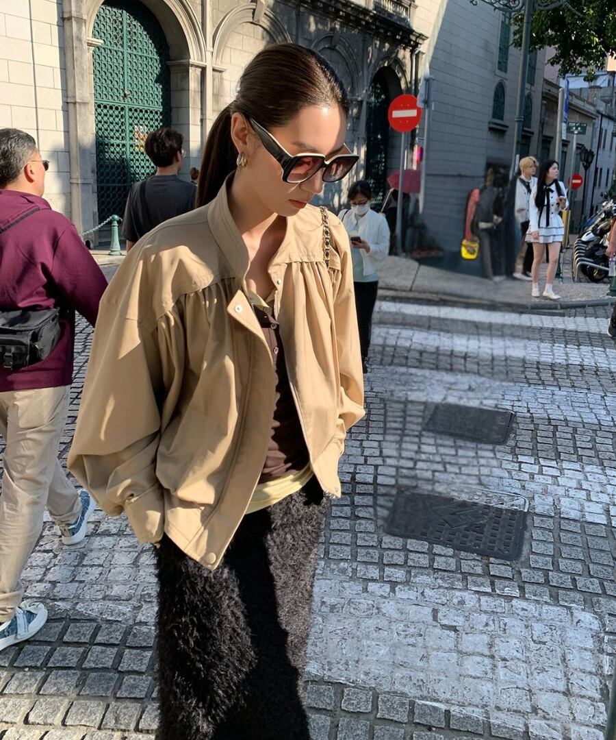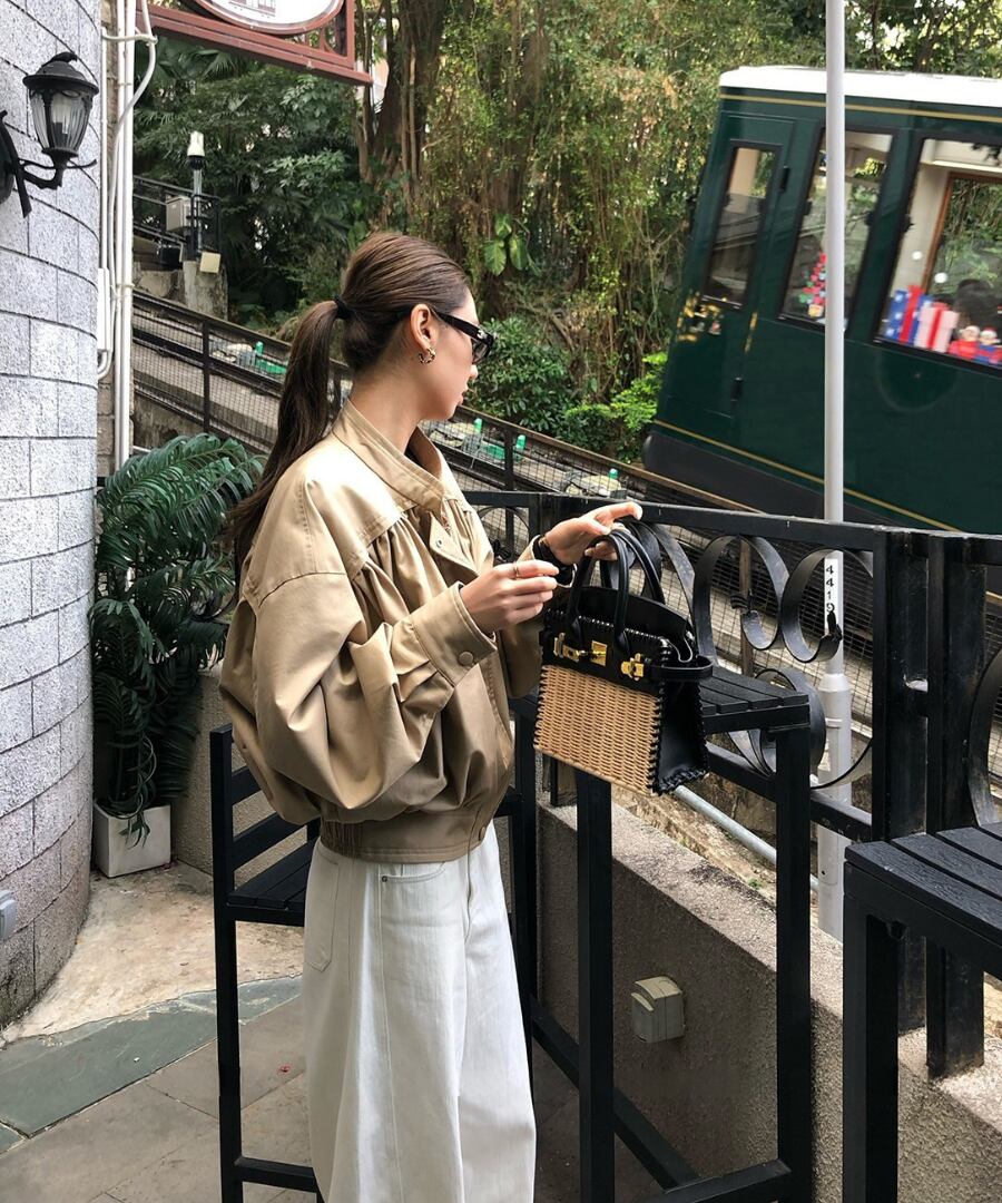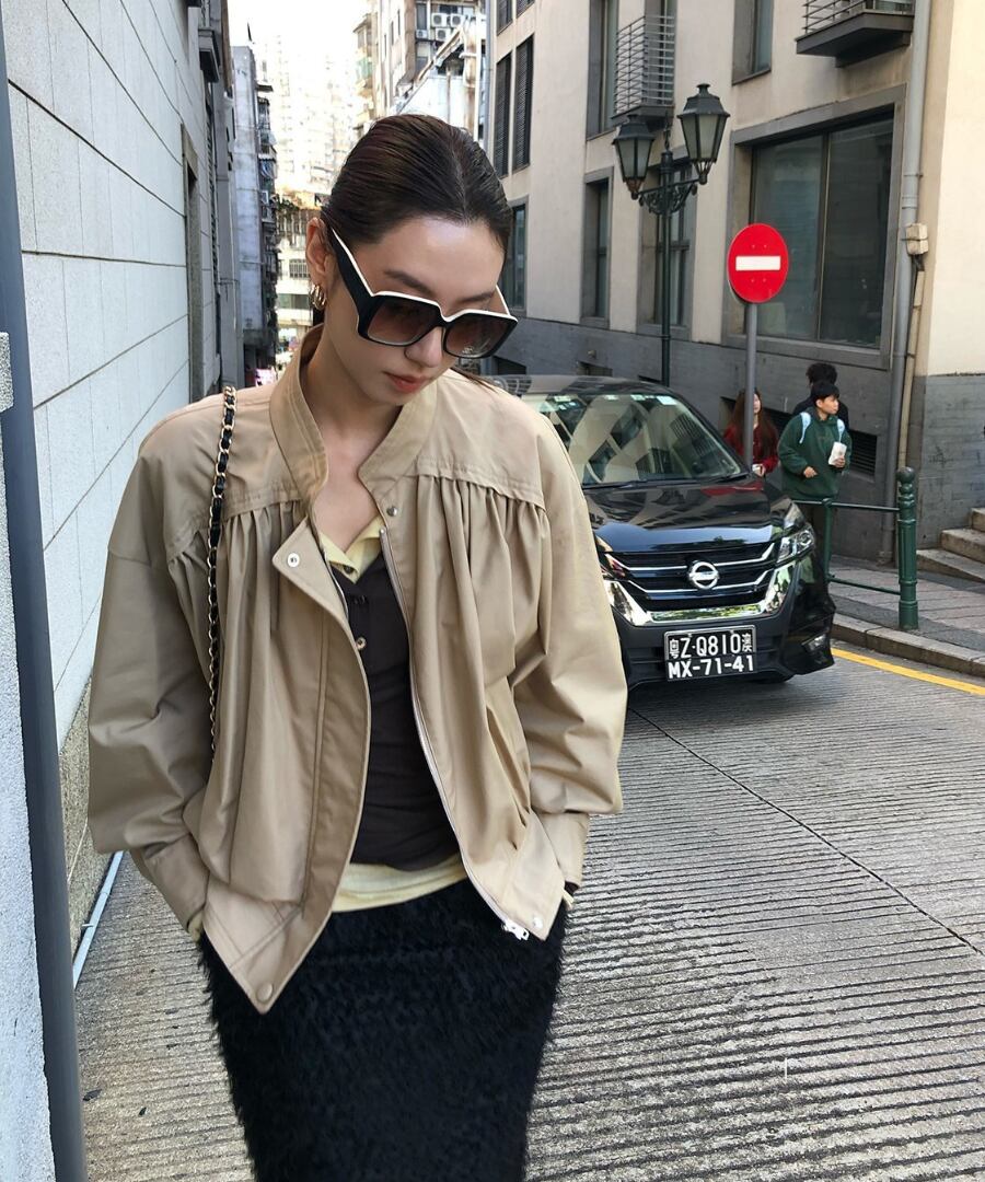 スタンドカラーとプリーツが印象的なブルゾン。