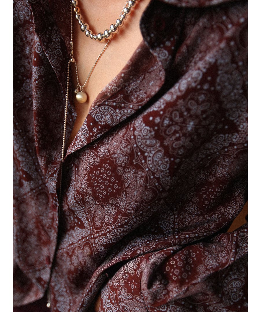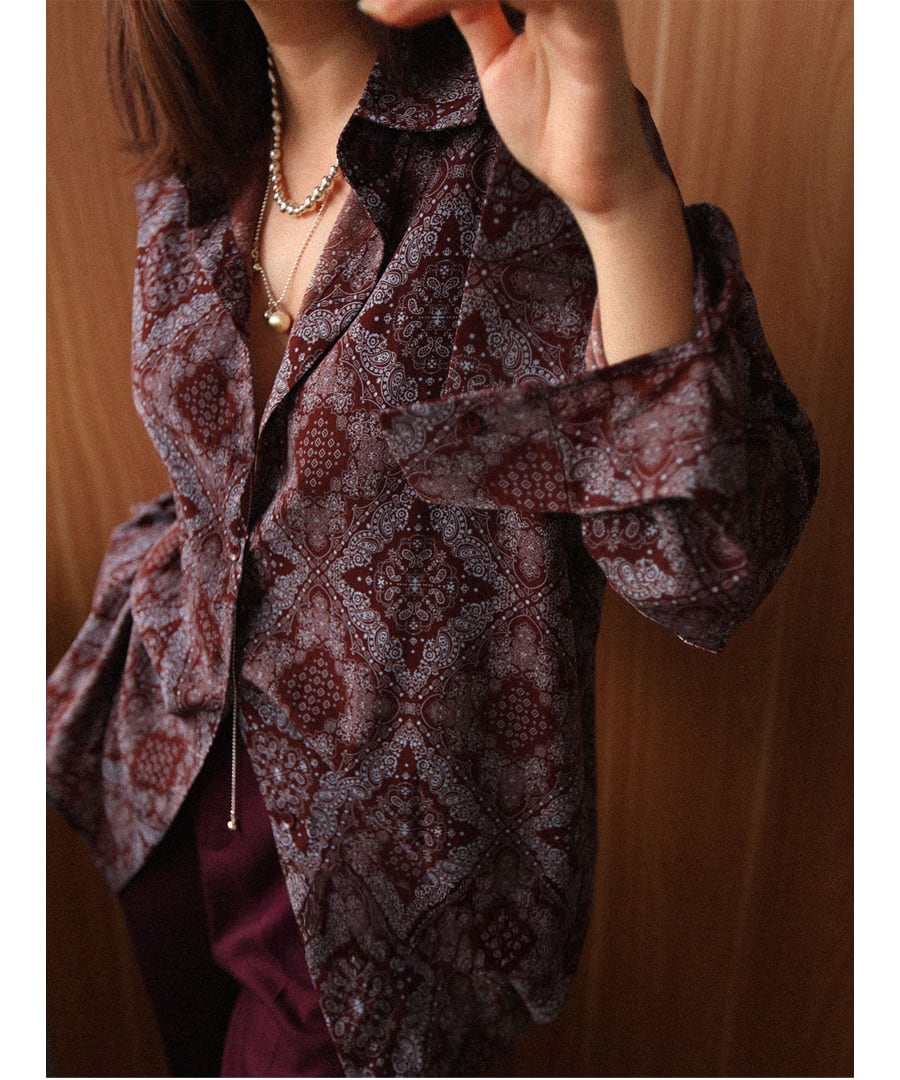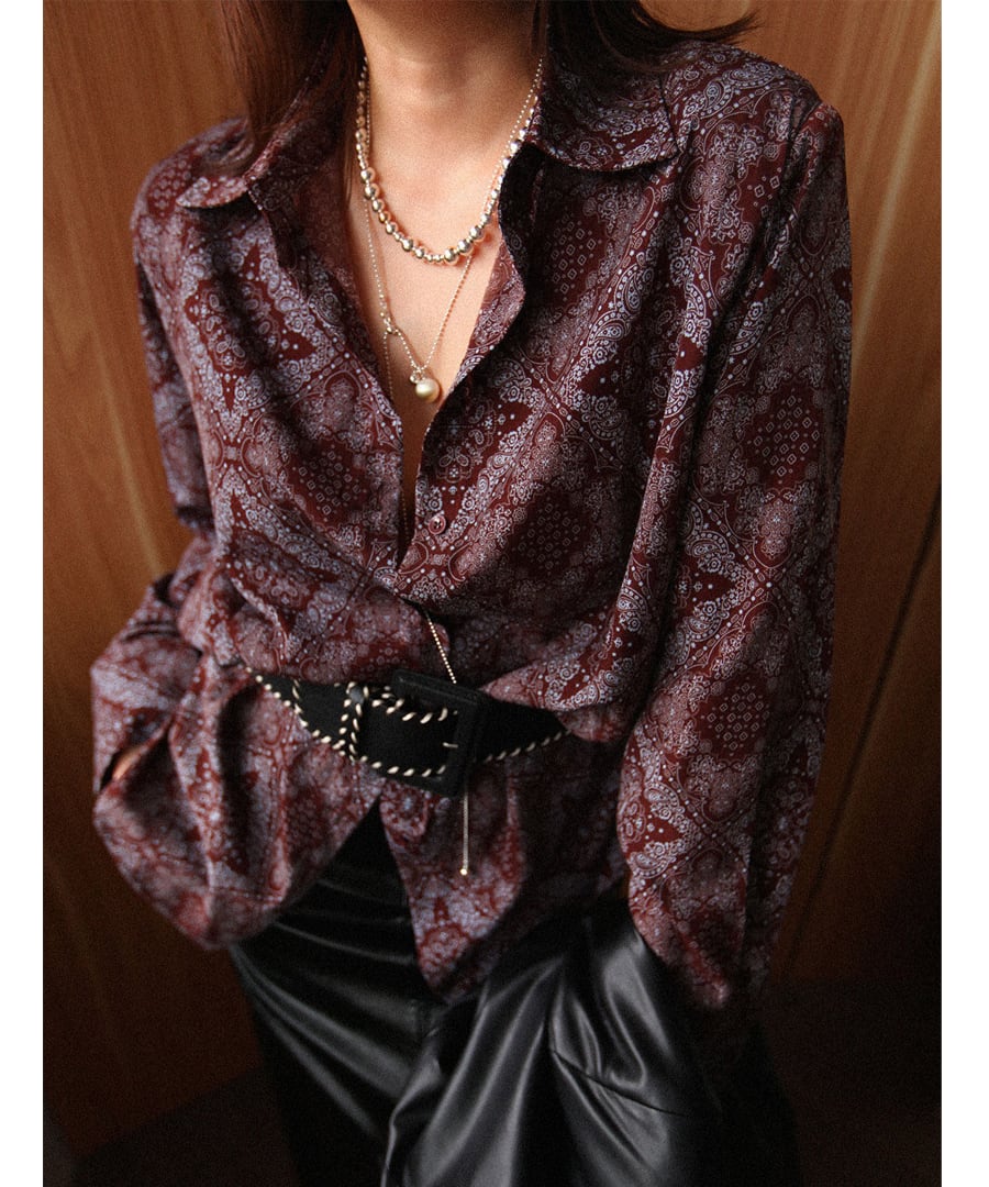 ブラウンを基調に、アートなプリントデザインが加わり、個性的でありながらも落ち着いた印象を与えます。
