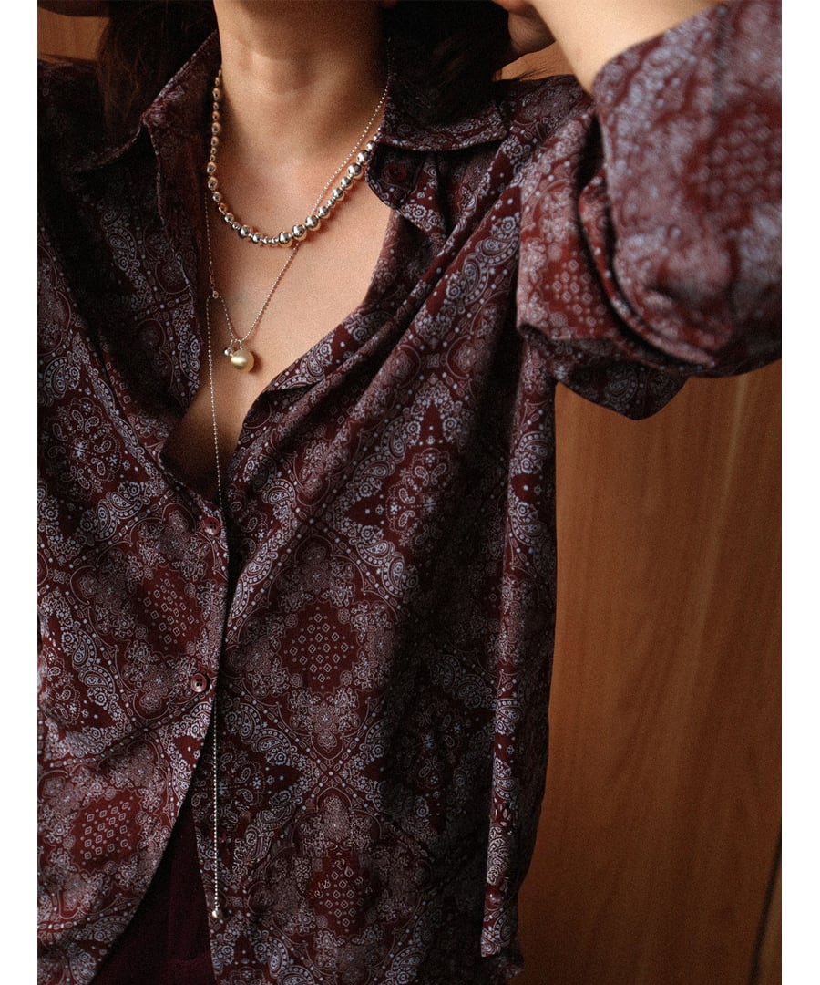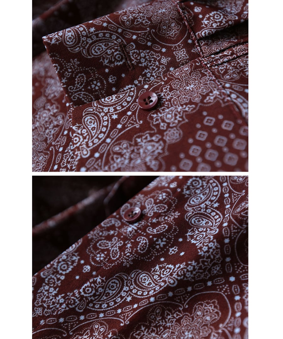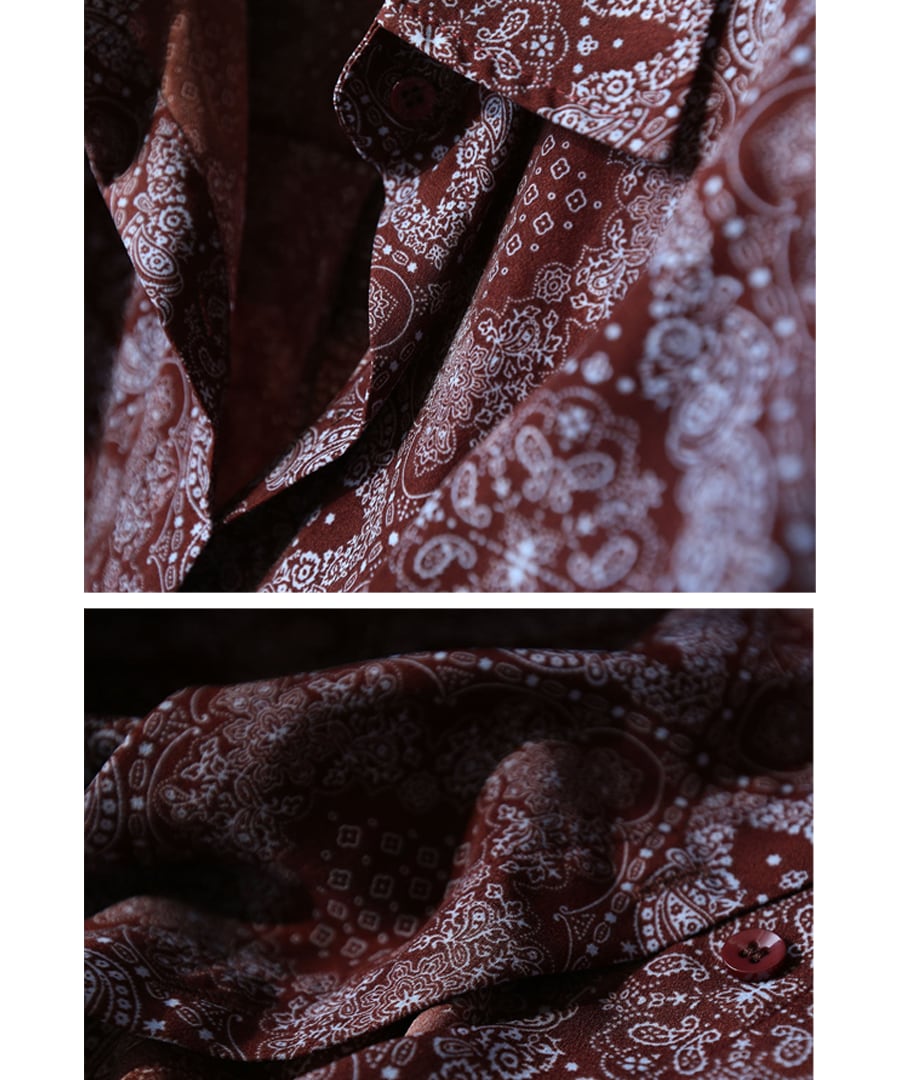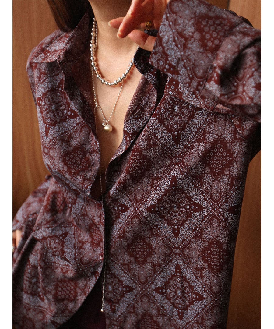 ブラウンを基調に、アートなプリントデザインが加わり、個性的でありながらも落ち着いた印象を与えます。