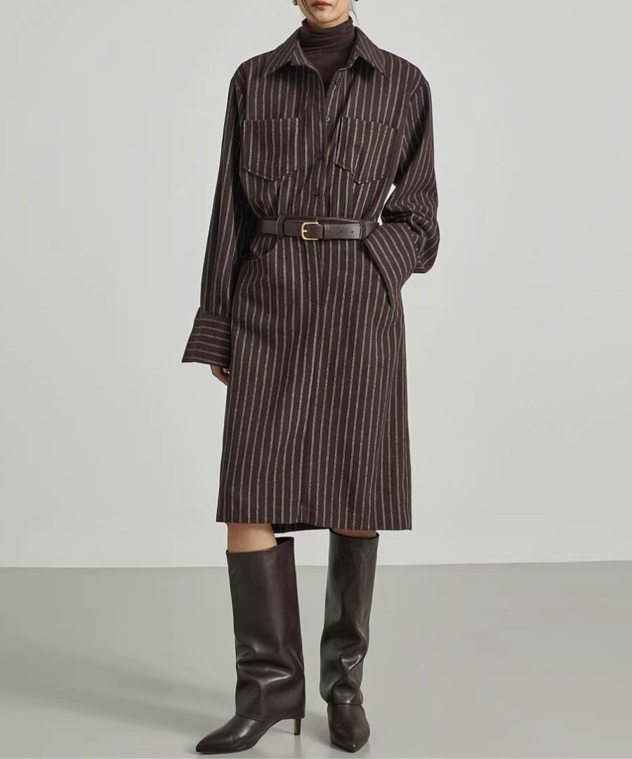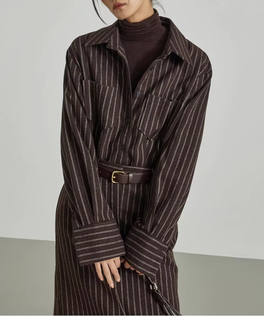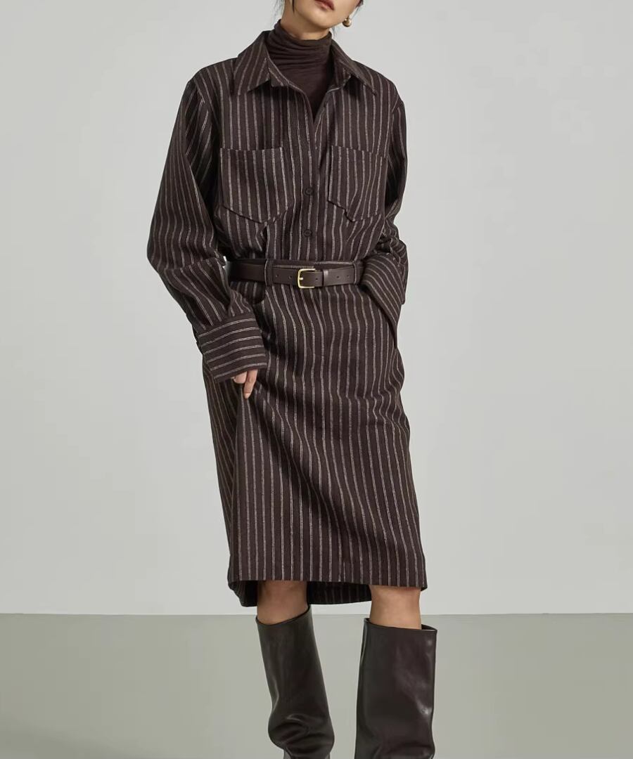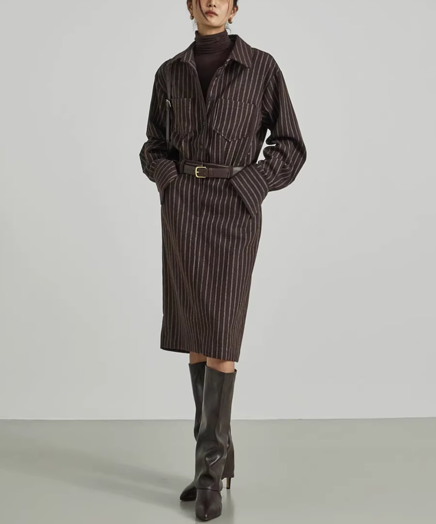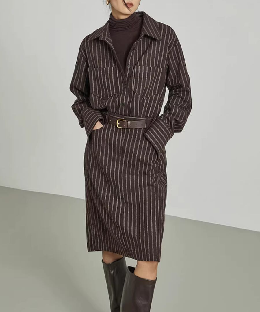 ストライプシャツワンピ◆ウール40%【w-30119】