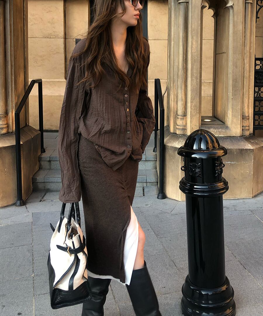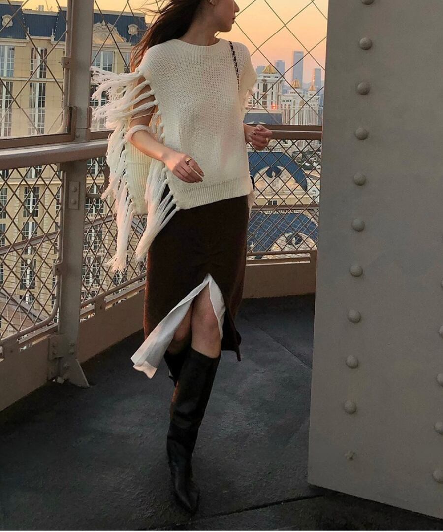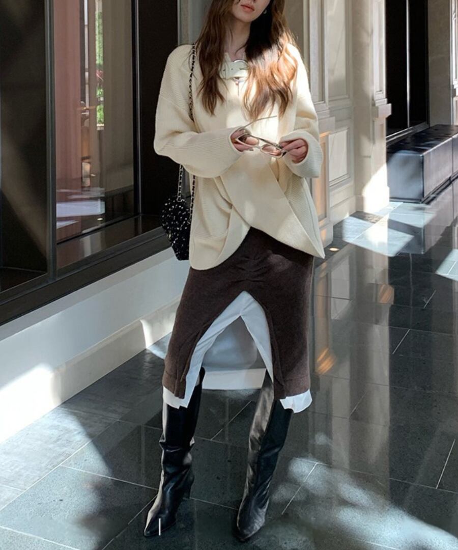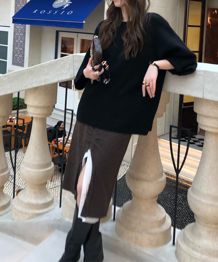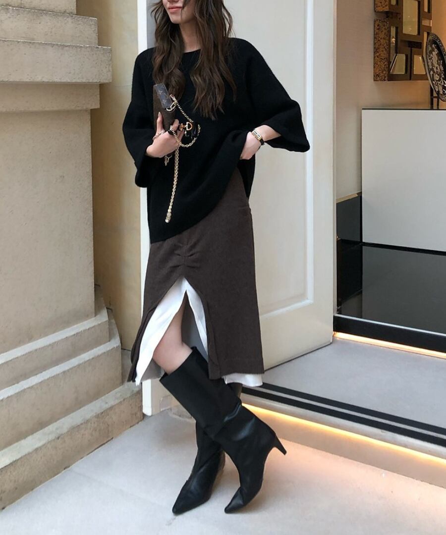 心地よい温もりを感じさせながら、フロントスリットで肌見せ感を演出。
