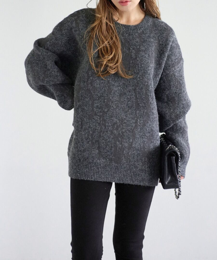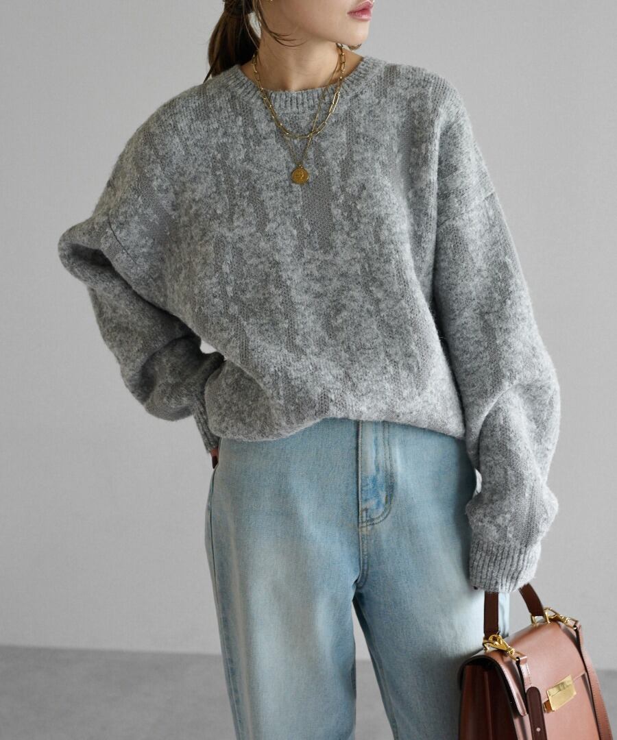 近くで見るとさりげない柄が浮き上がる、細かなジャカード編みを施した上品なニット。