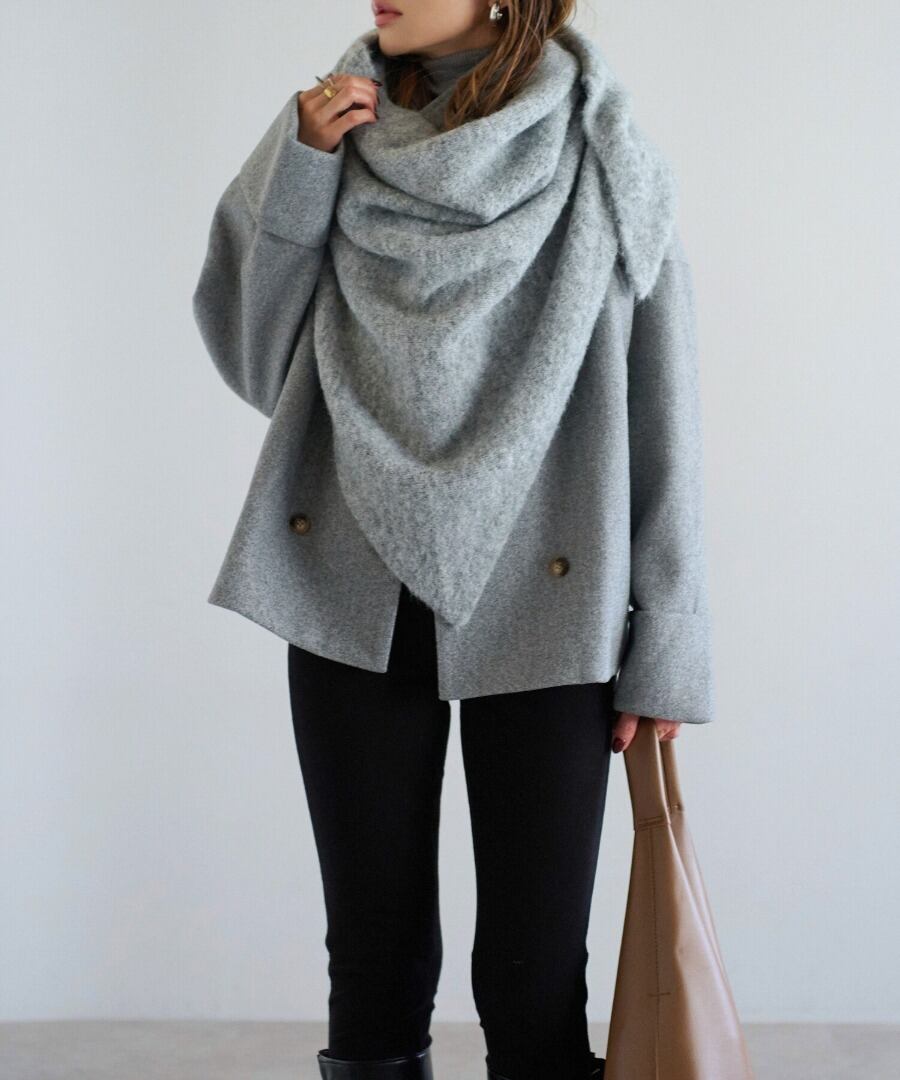 巻き方によって着こなしを楽しめる無地の大判ストールで、立体感やボリュームを調整できます。