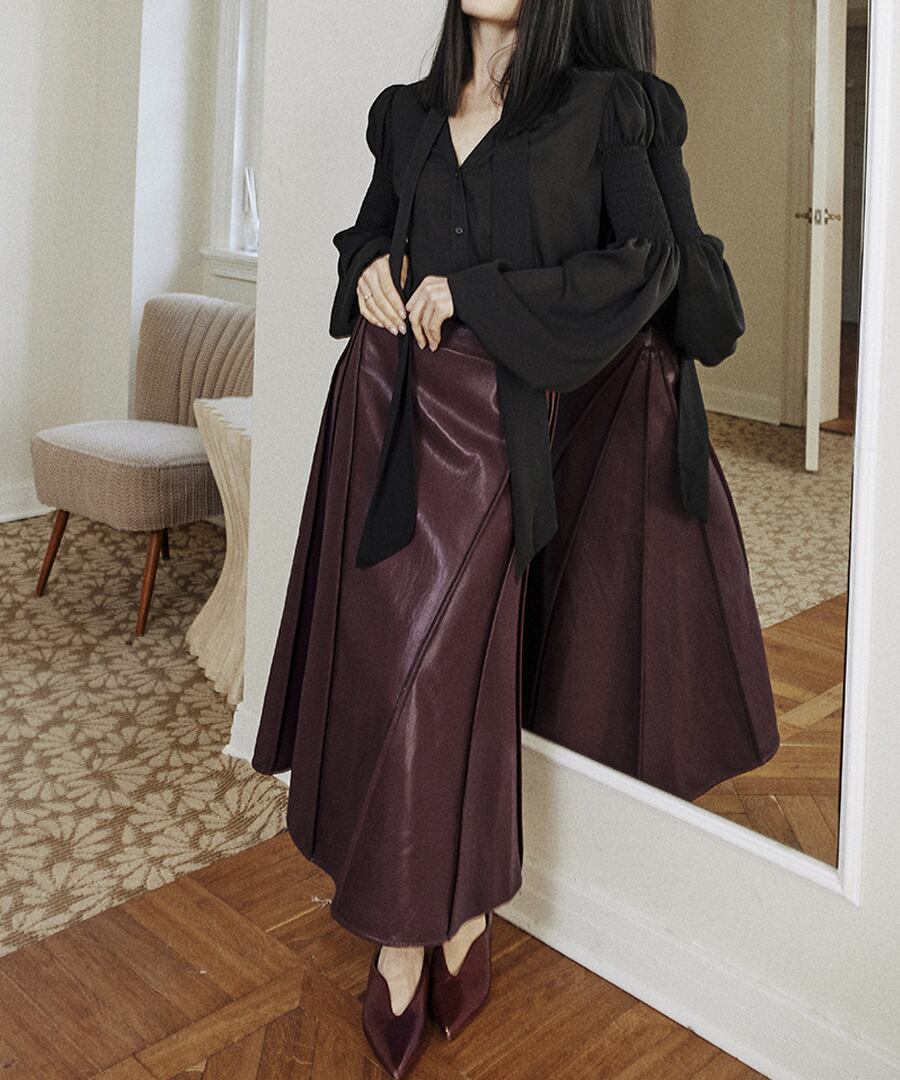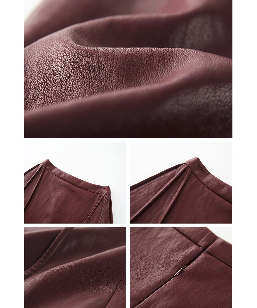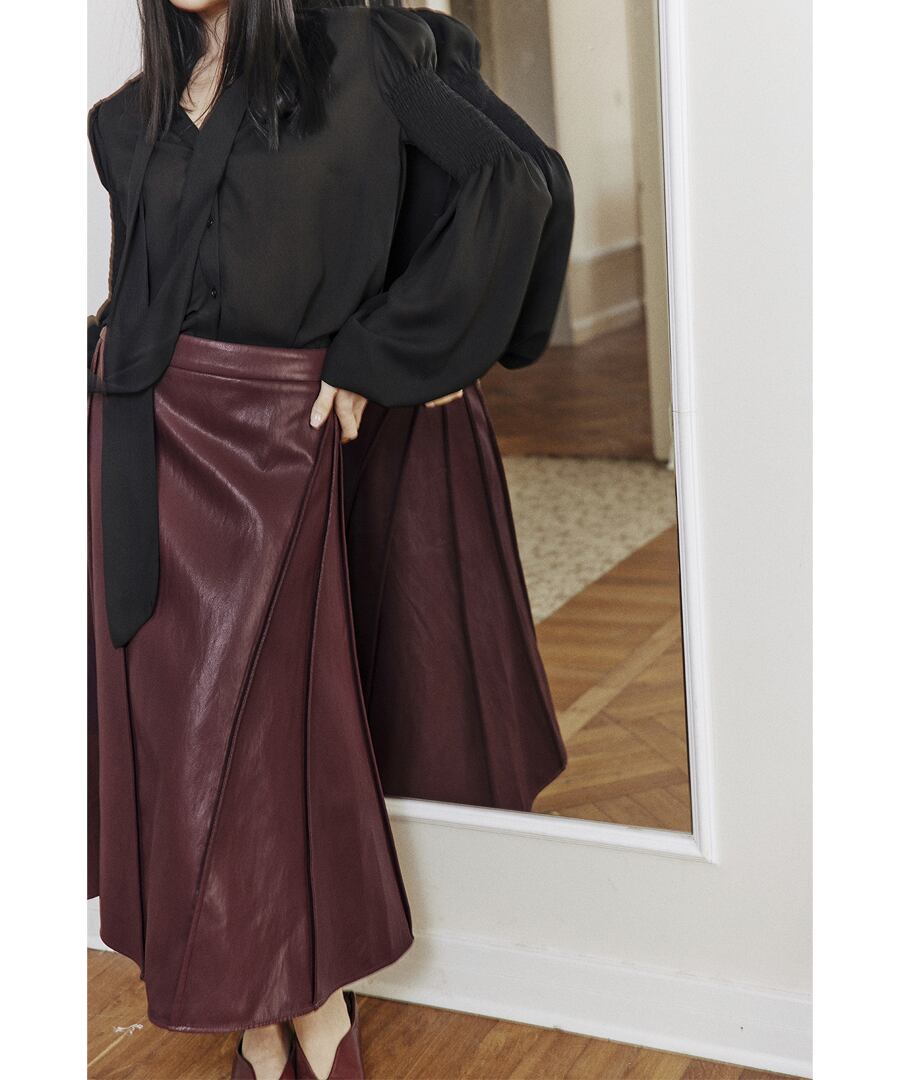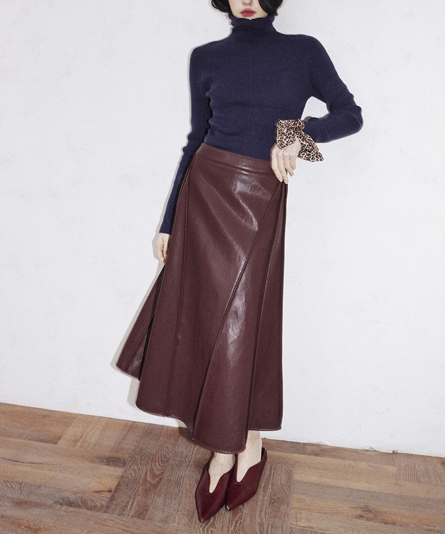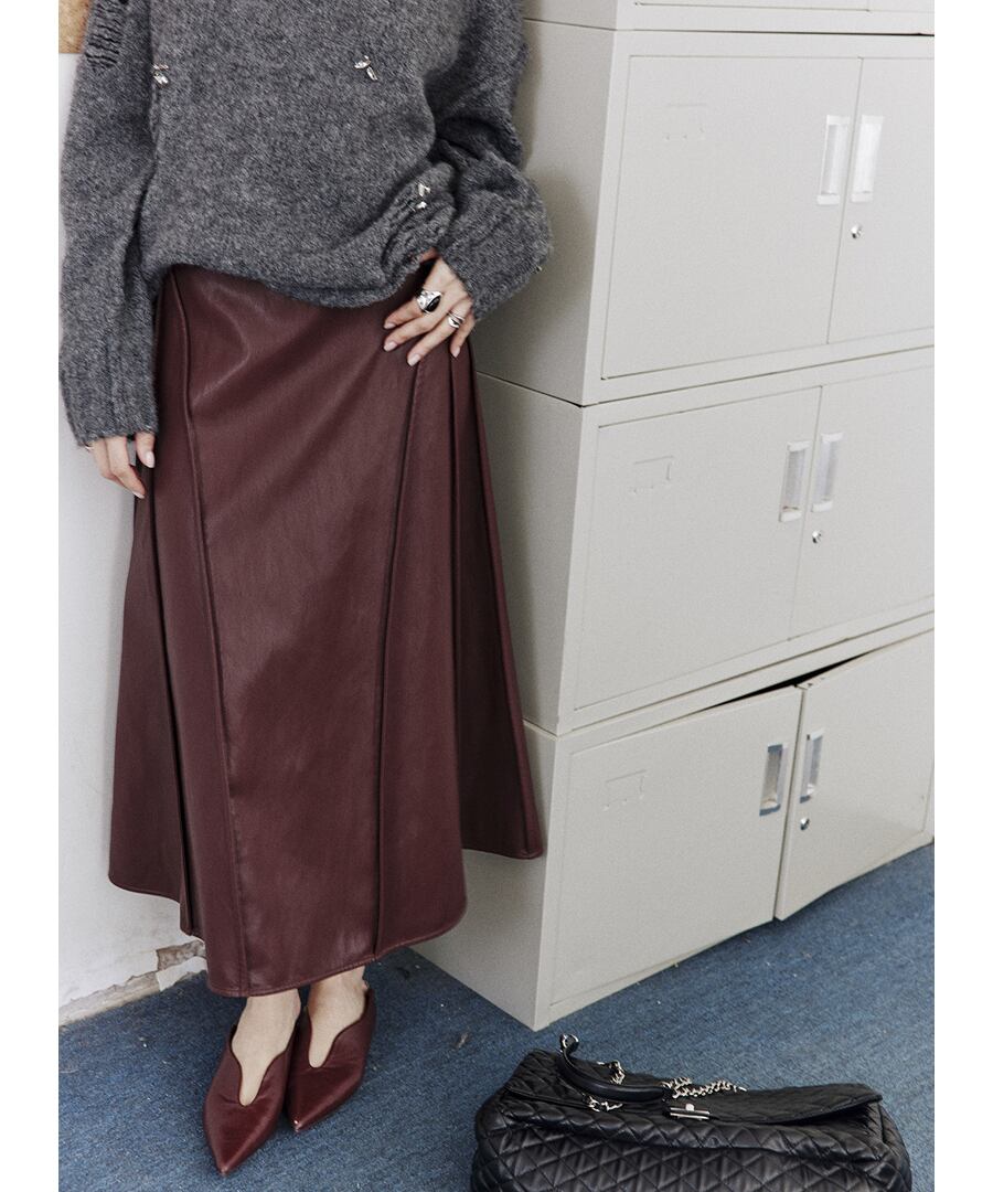 バーガンディの深い色合いが美しさを引き立てるPUレザーAラインスカートです。