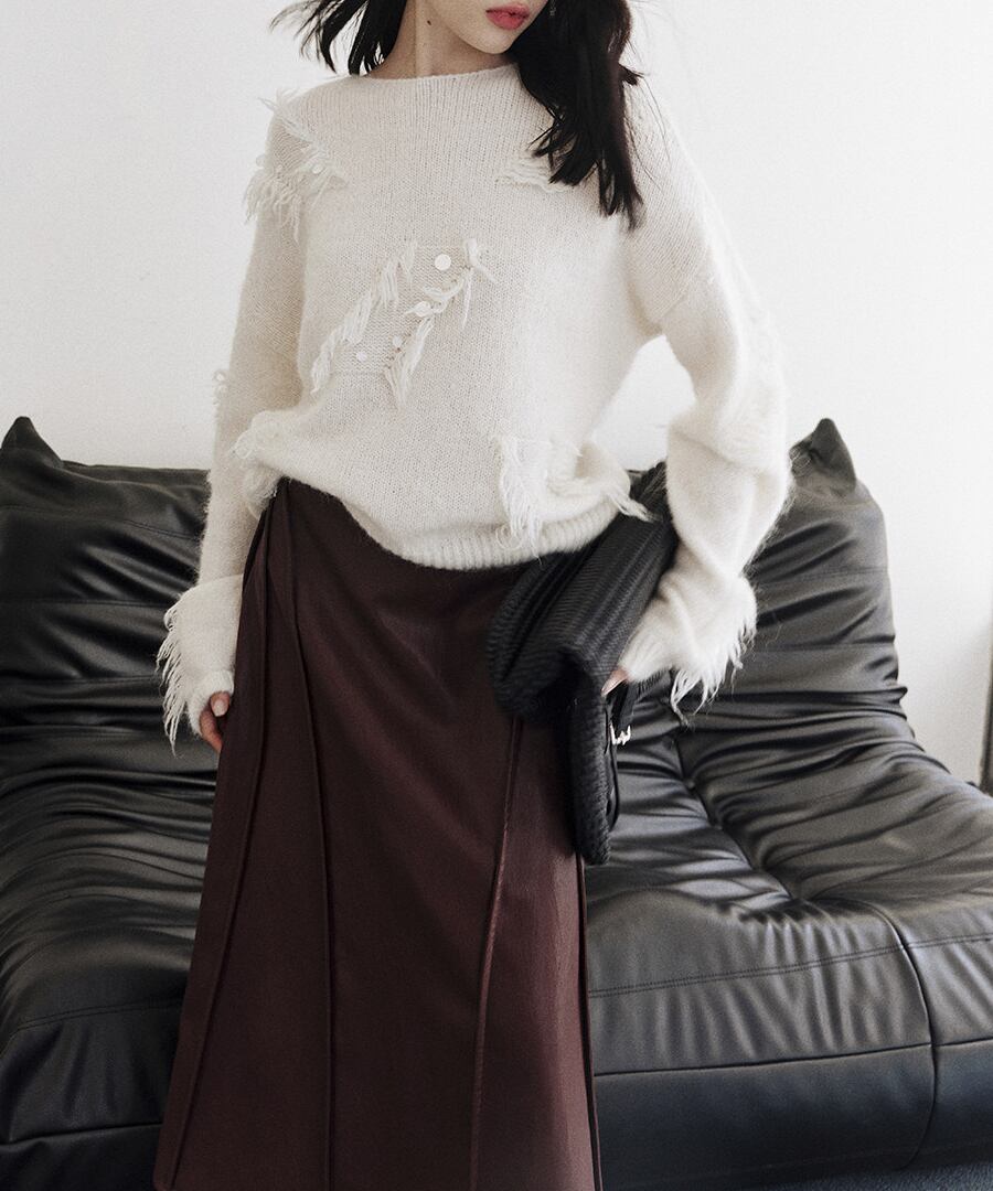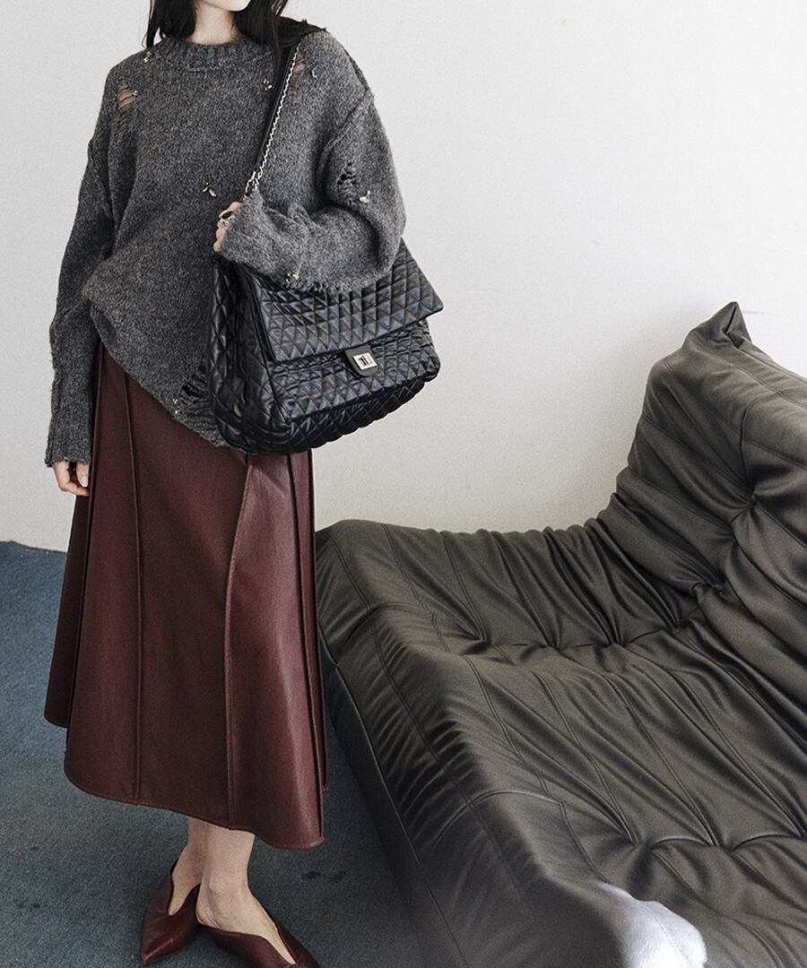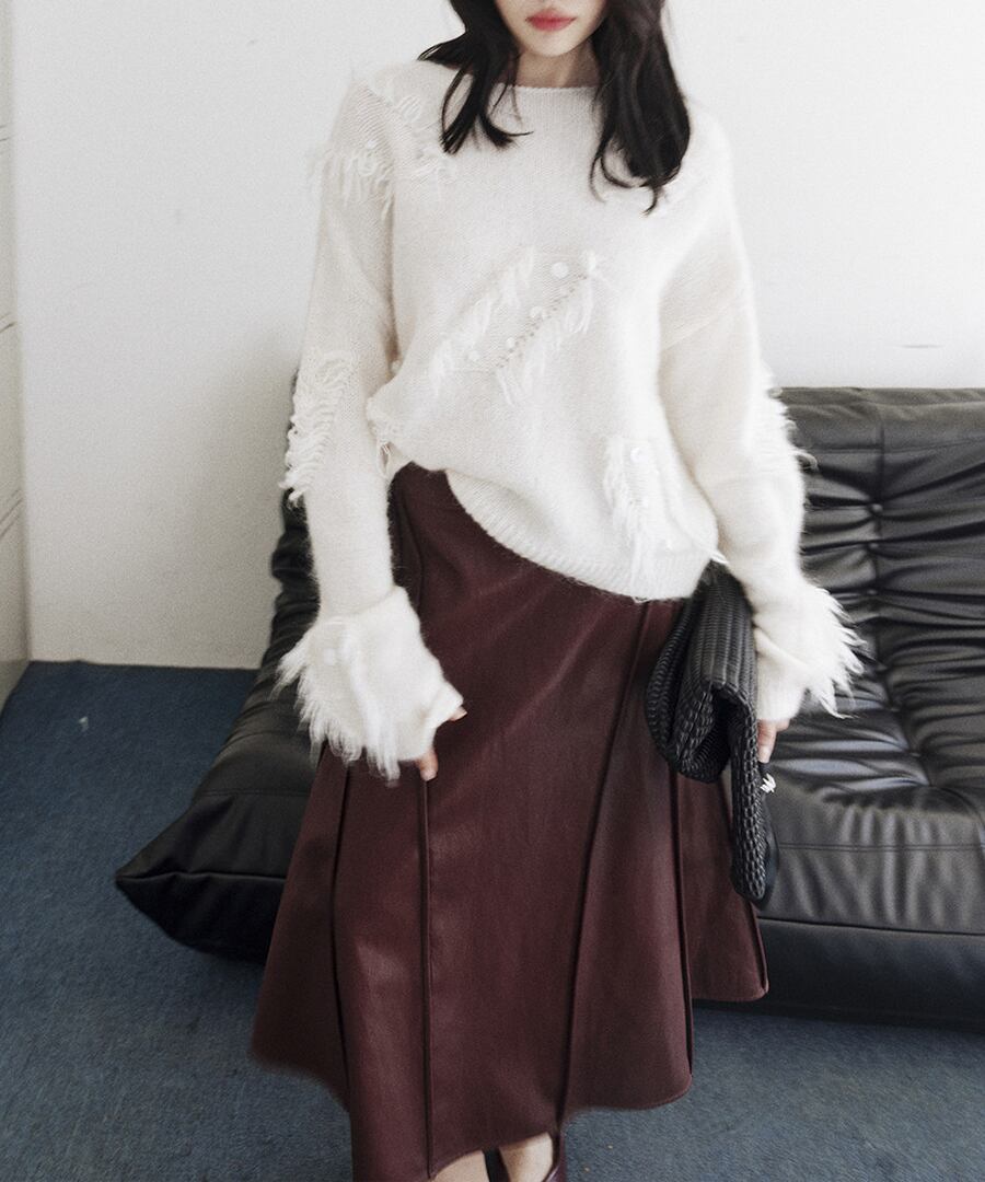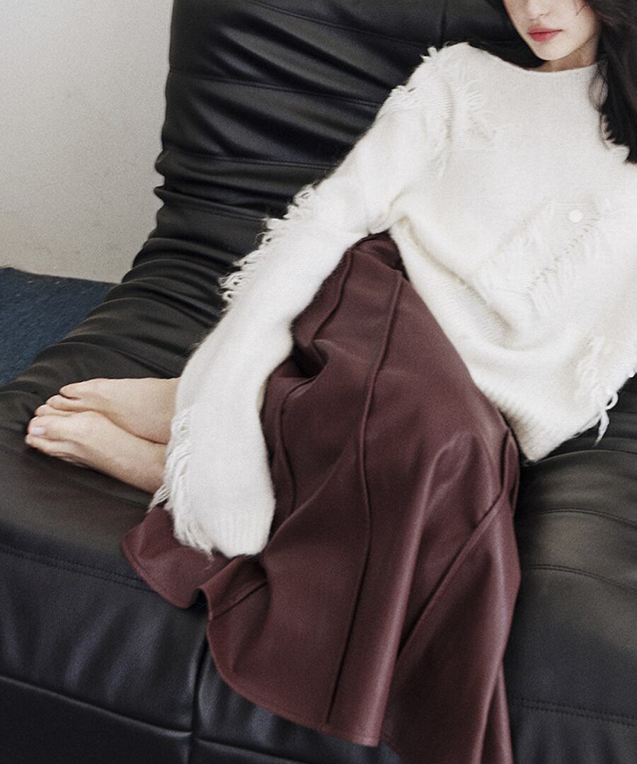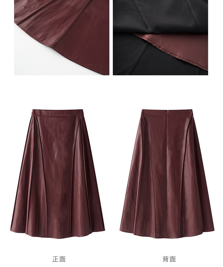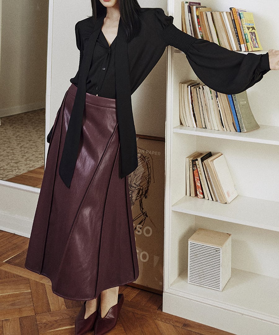 バーガンディの深い色合いが美しさを引き立てるPUレザーAラインスカートです。