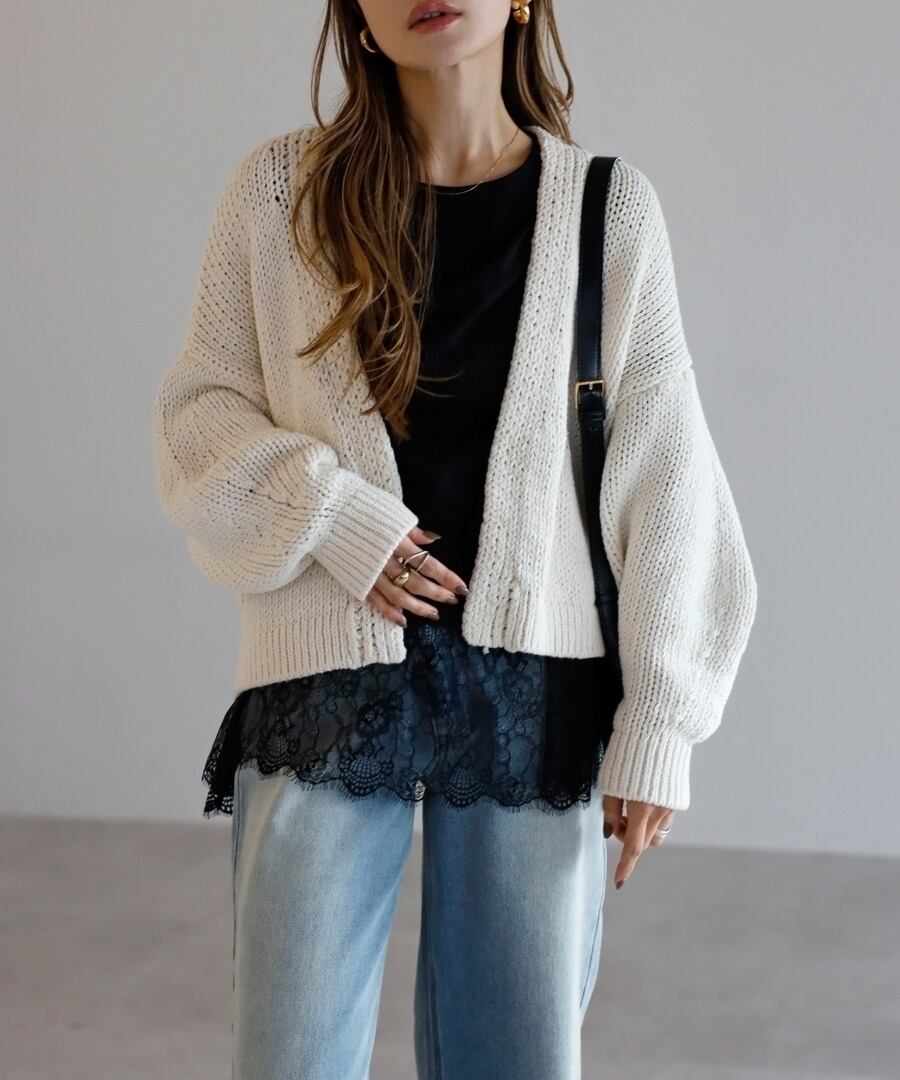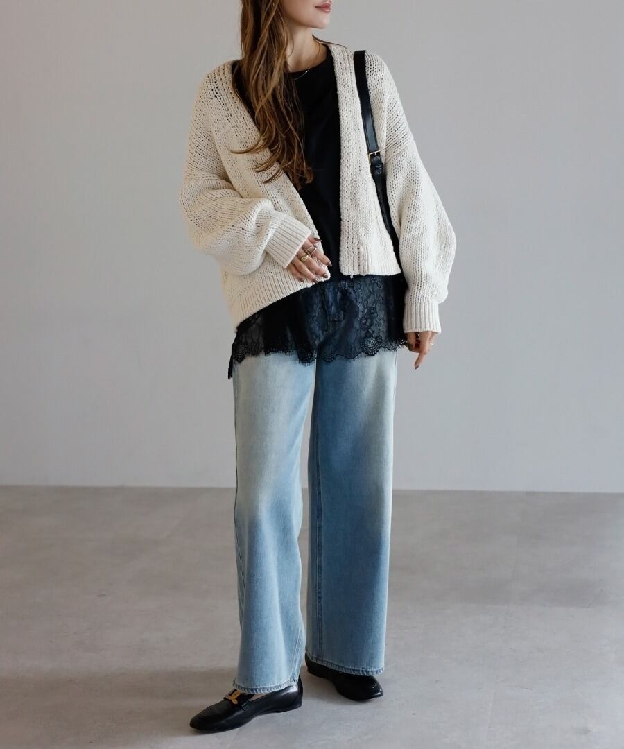 軽やかな透け感が、上品さと抜け感を両立した大人向けの一着です。
