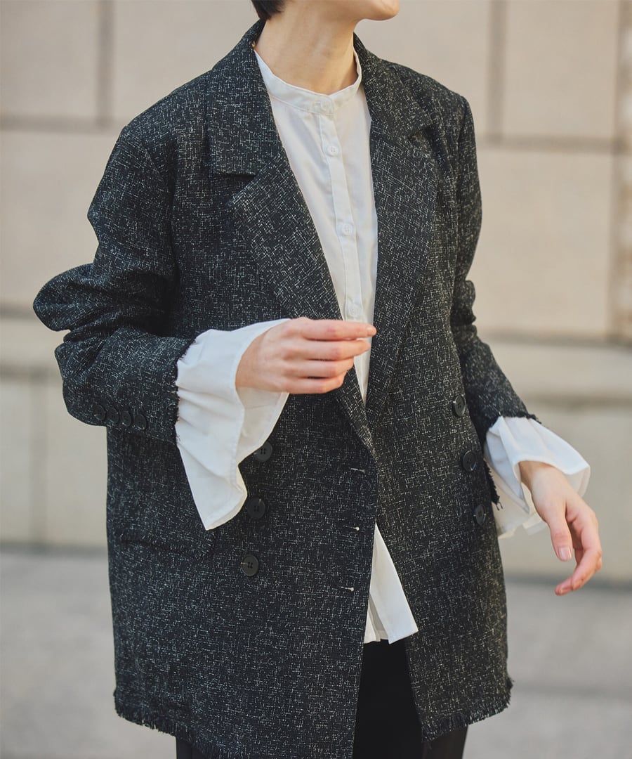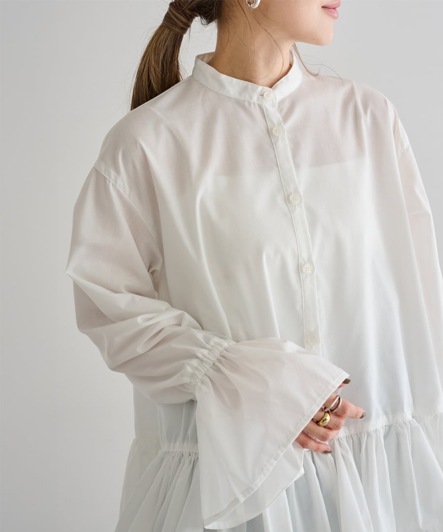 首元をすっきり見せるバンドカラーは、顔まわりを上品にまとめます。
