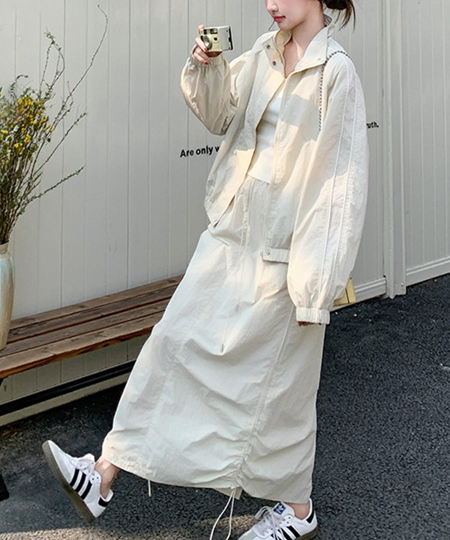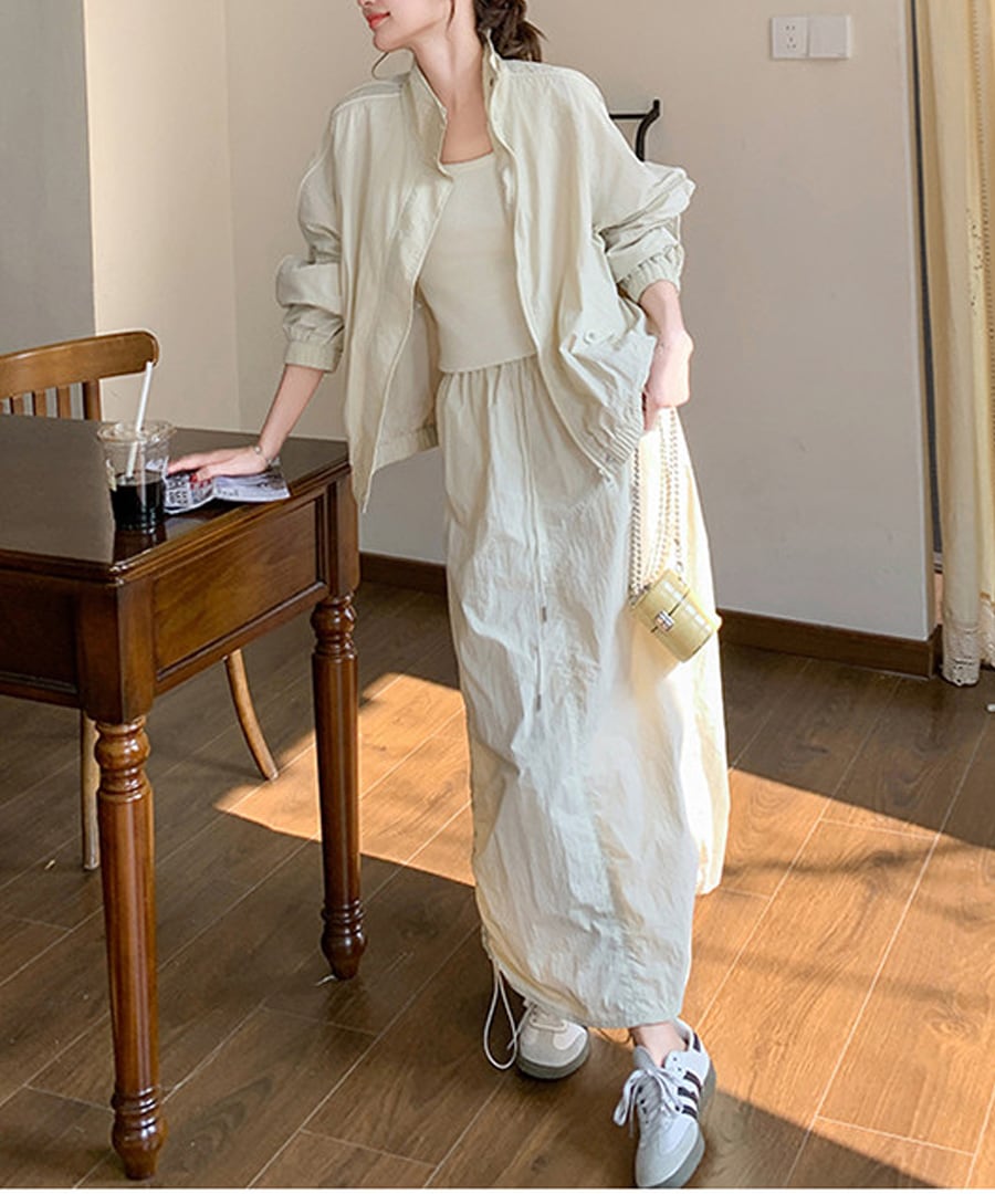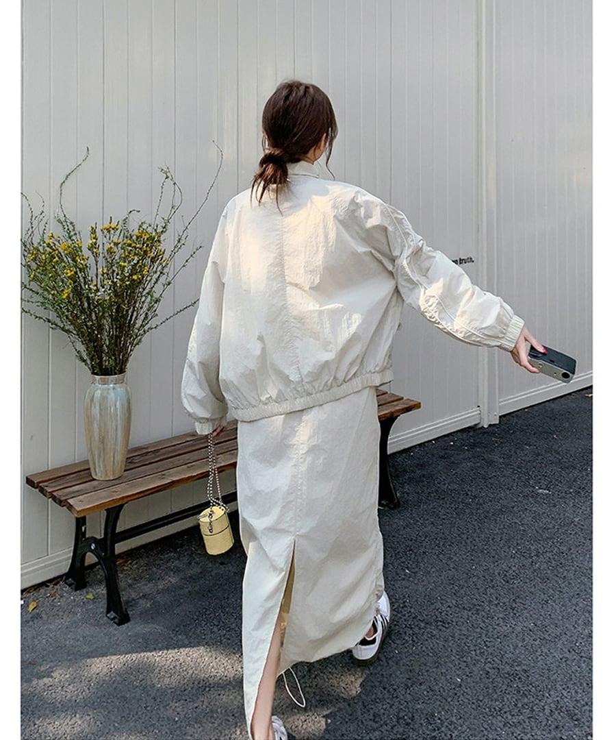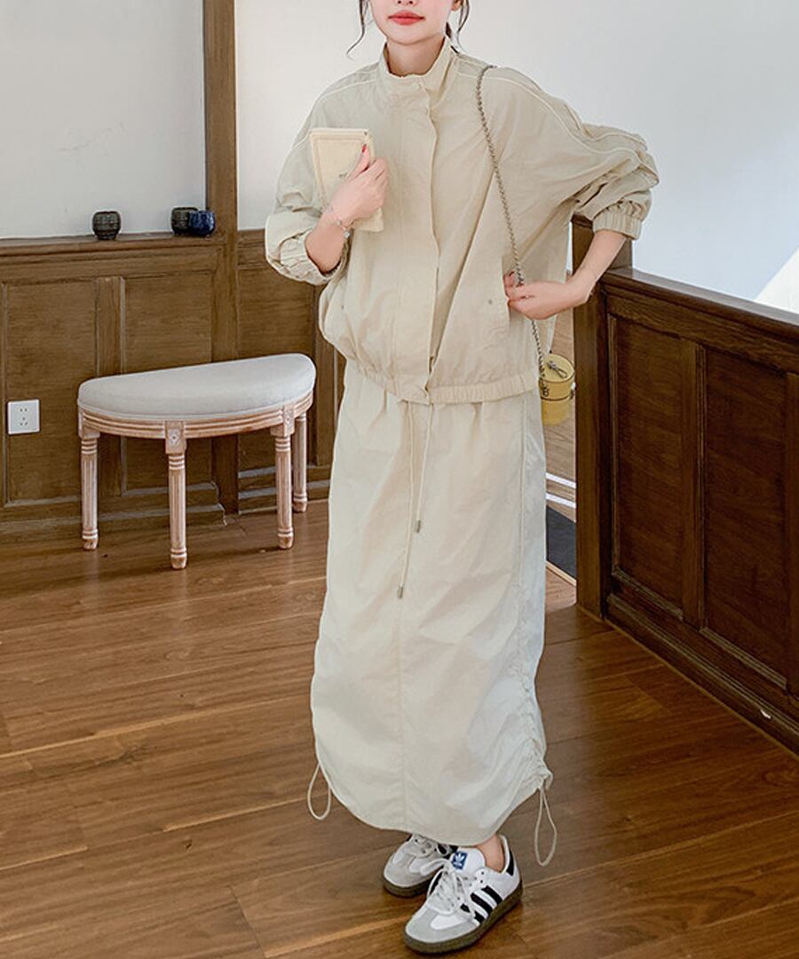 スポーティなデザインが魅力のワークウェアジャケットとスカートのツーピースセット。