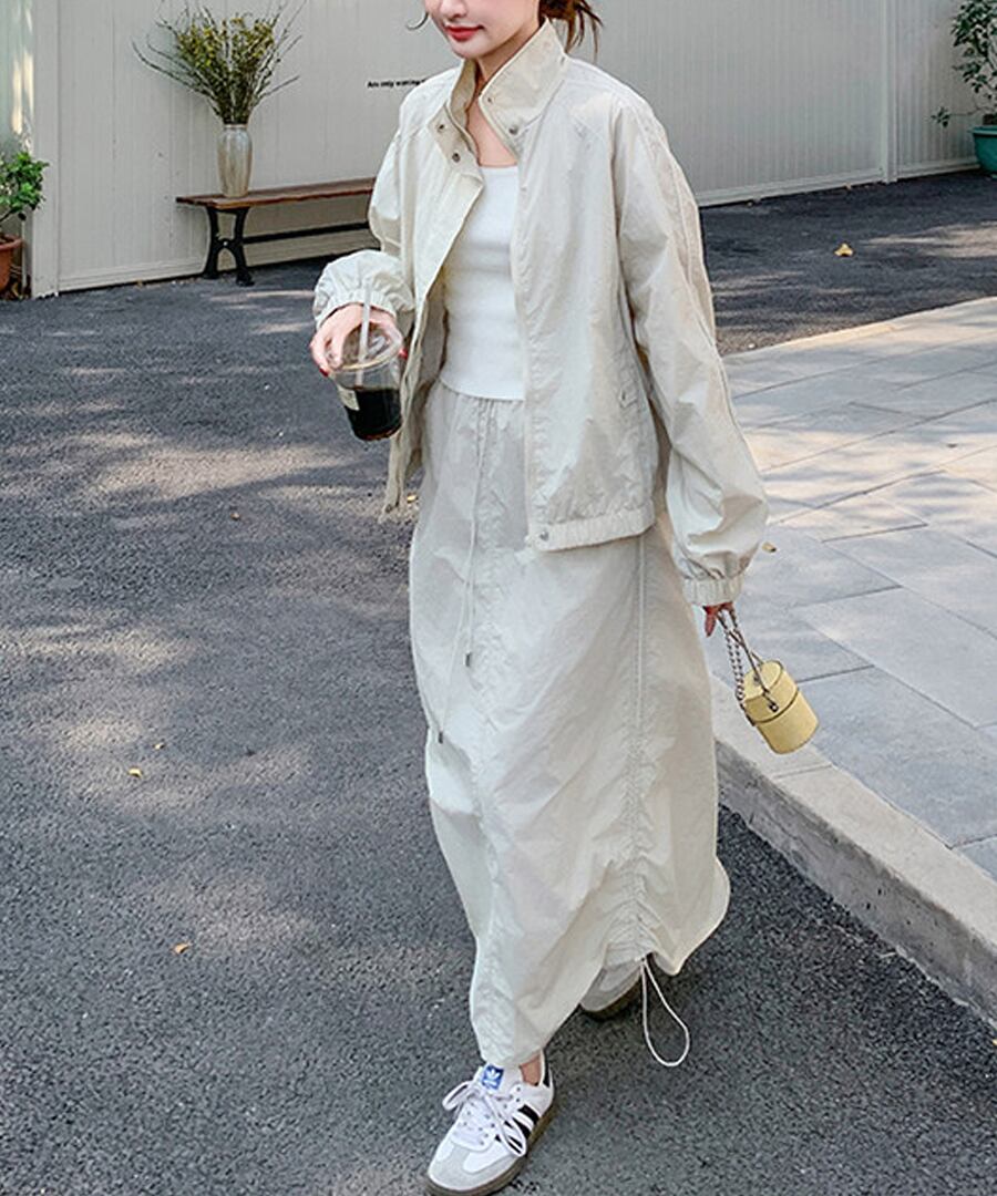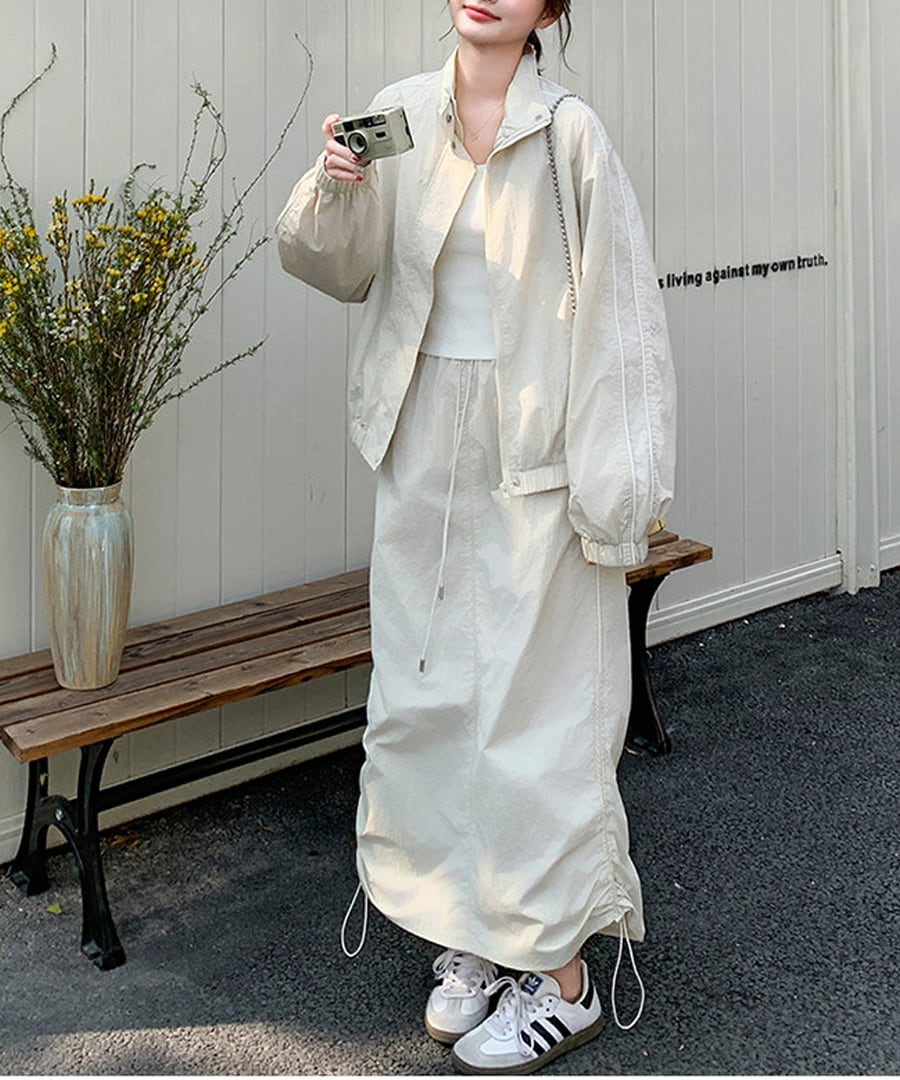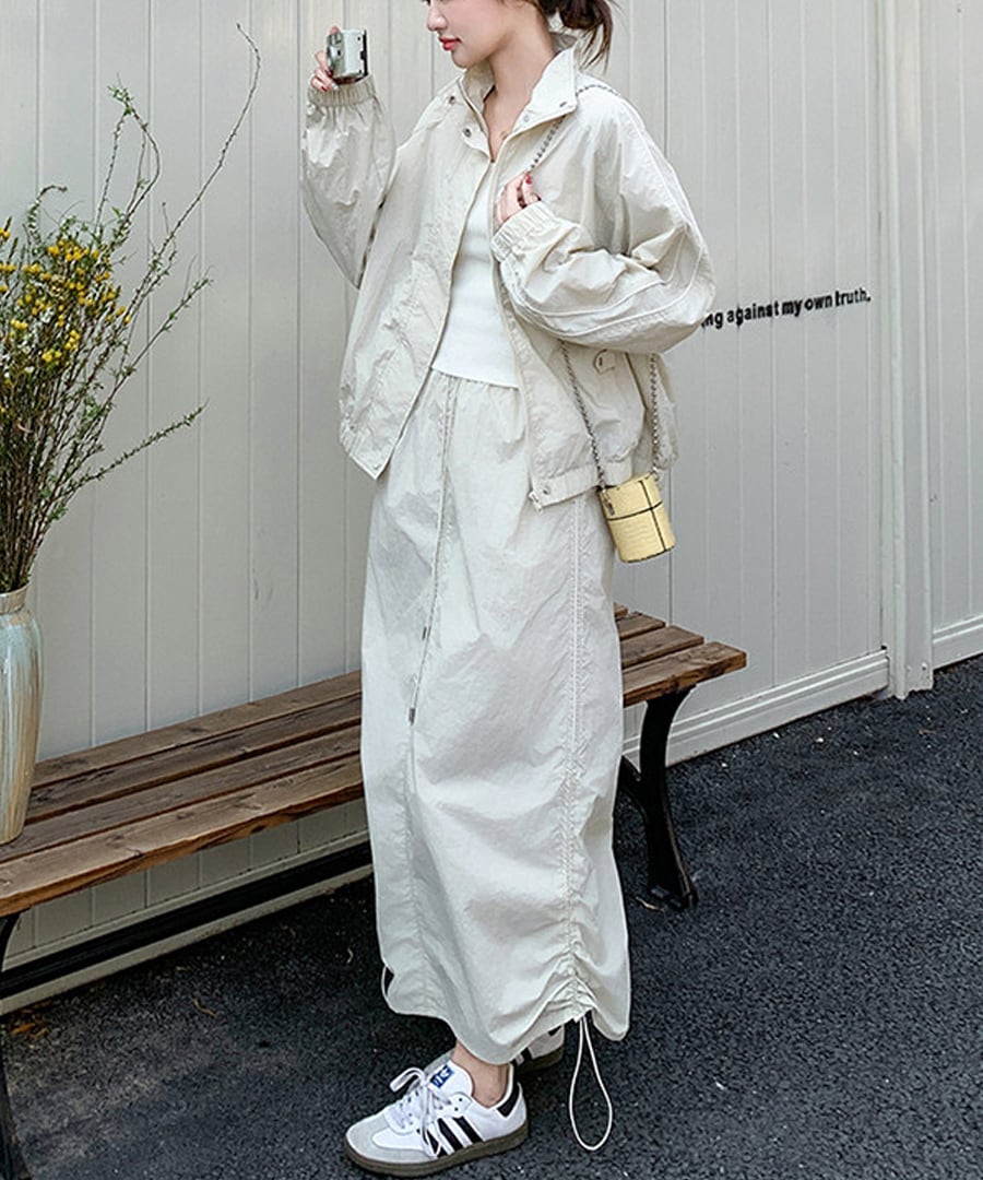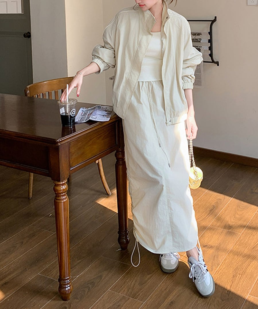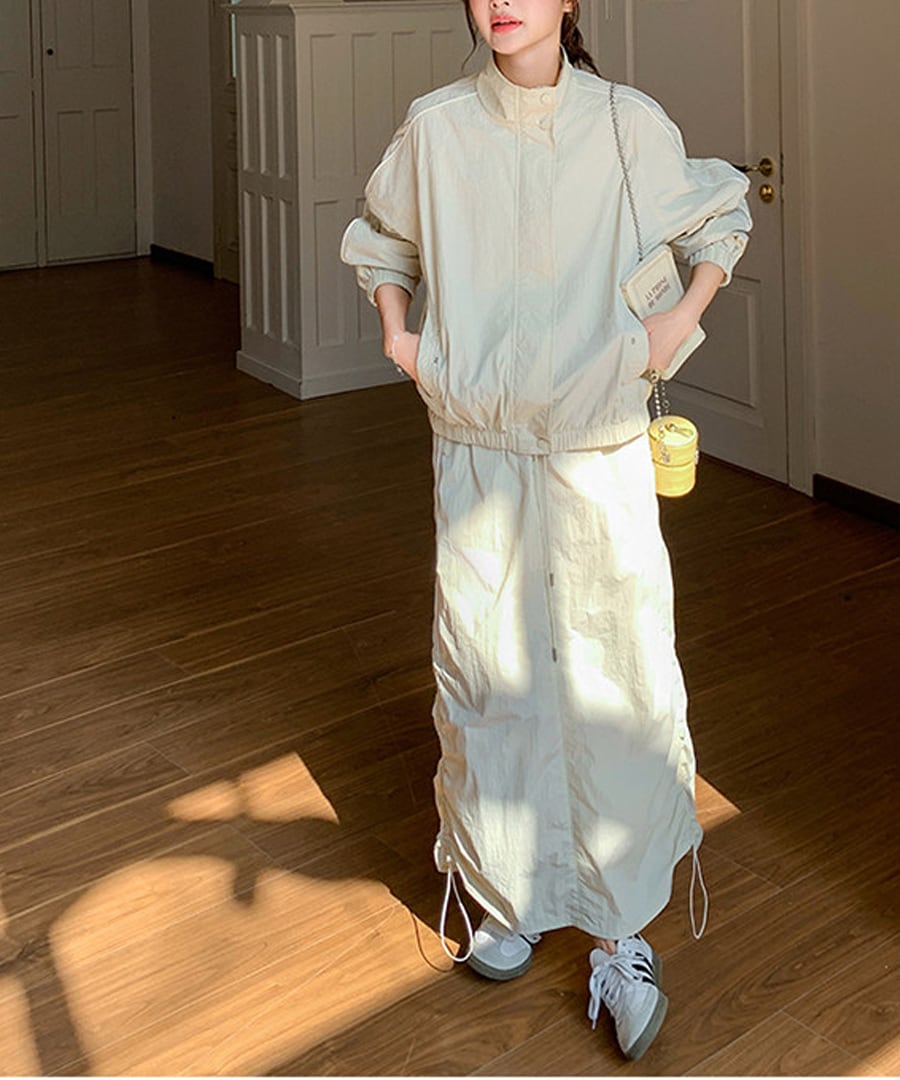 スポーティなデザインが魅力のワークウェアジャケットとスカートのツーピースセット。
