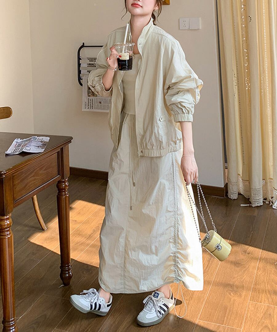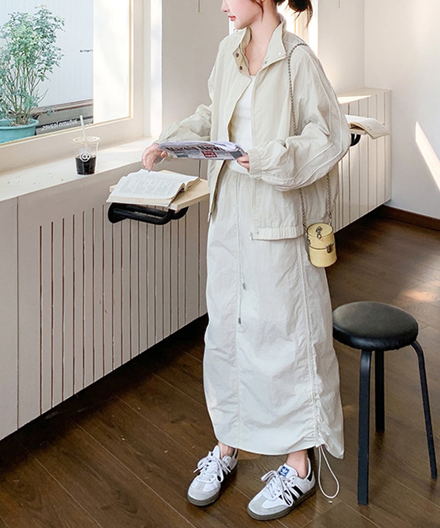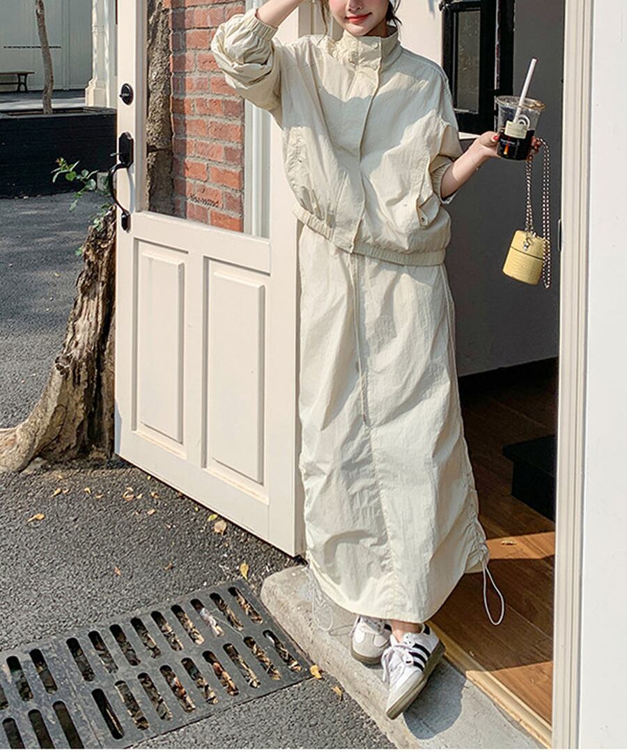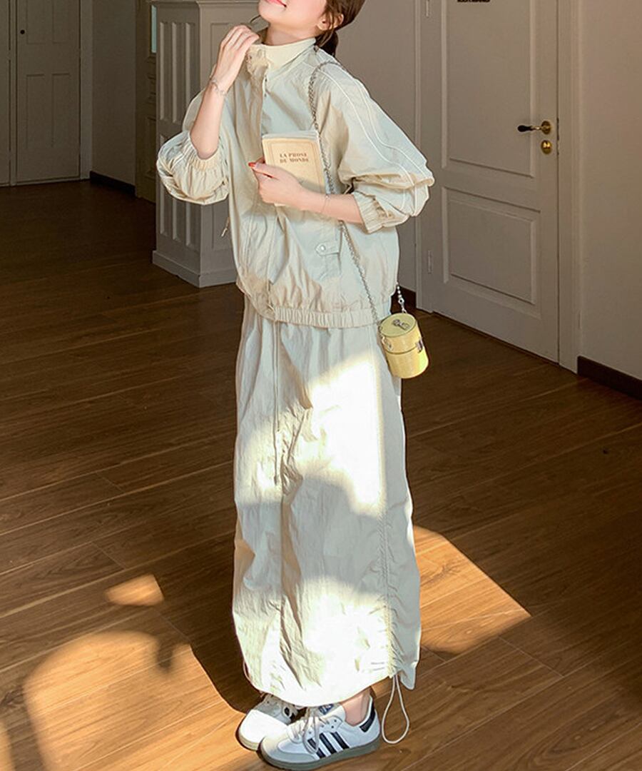 スポーティなデザインが魅力のワークウェアジャケットとスカートのツーピースセット。