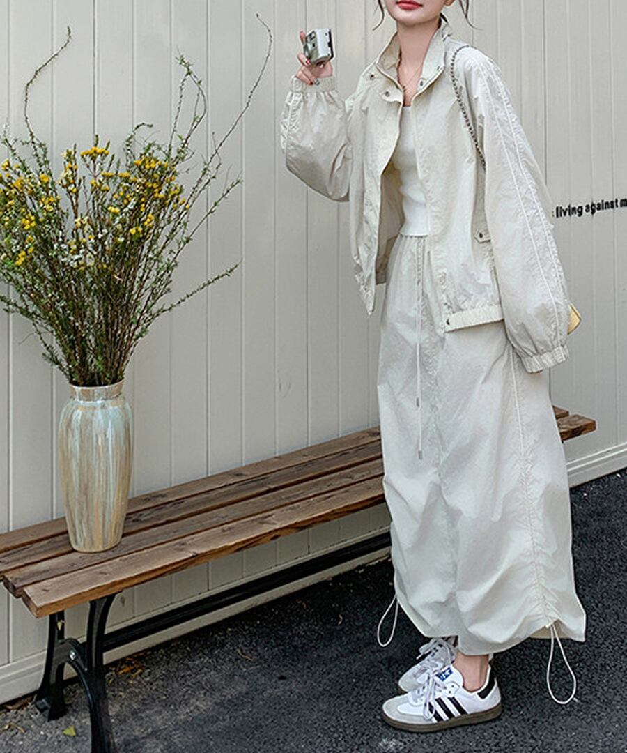 軽やかなスカートとのコンビネーションで、動きやすさを求めながらもスタイリッシュな印象を与えます。