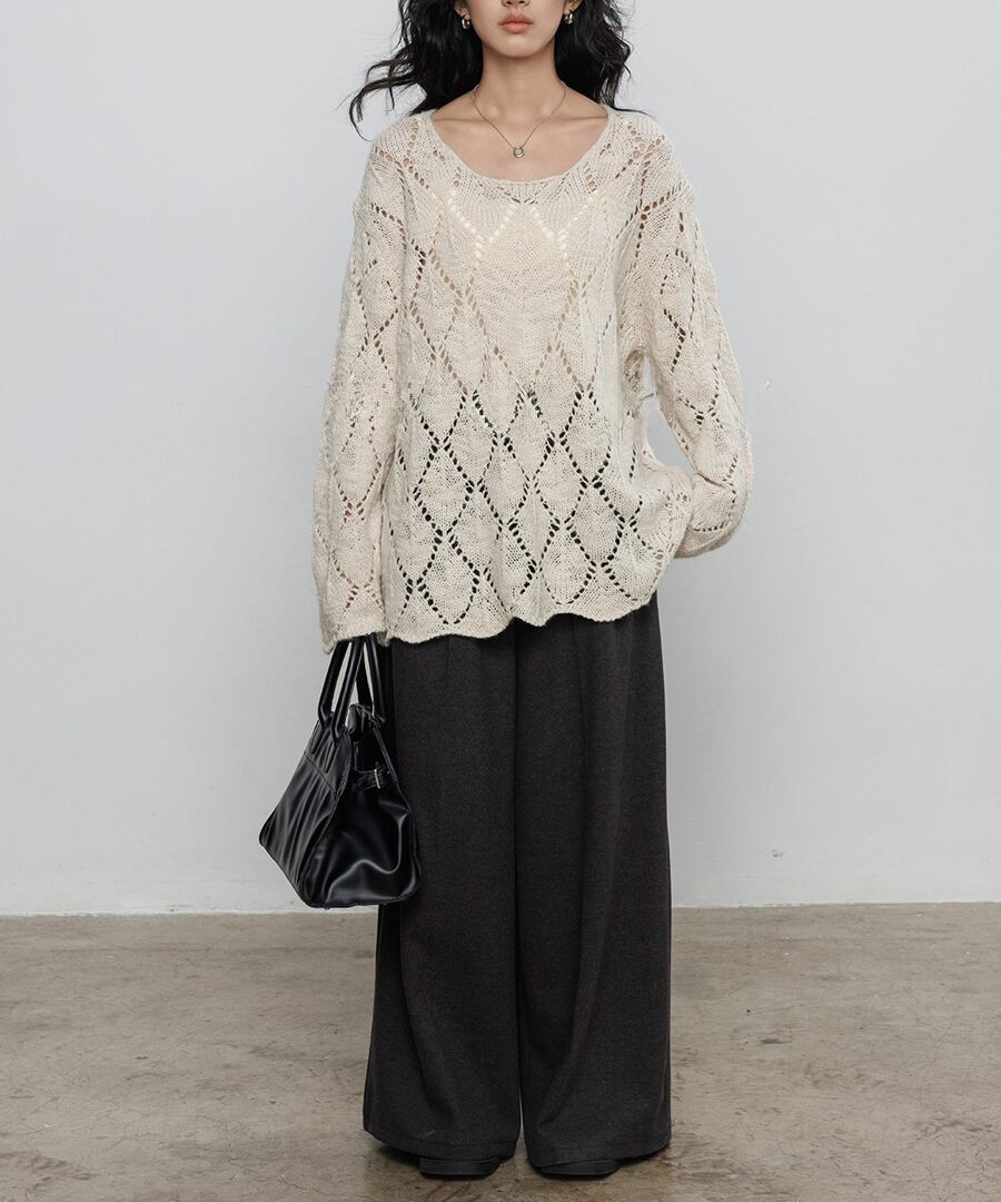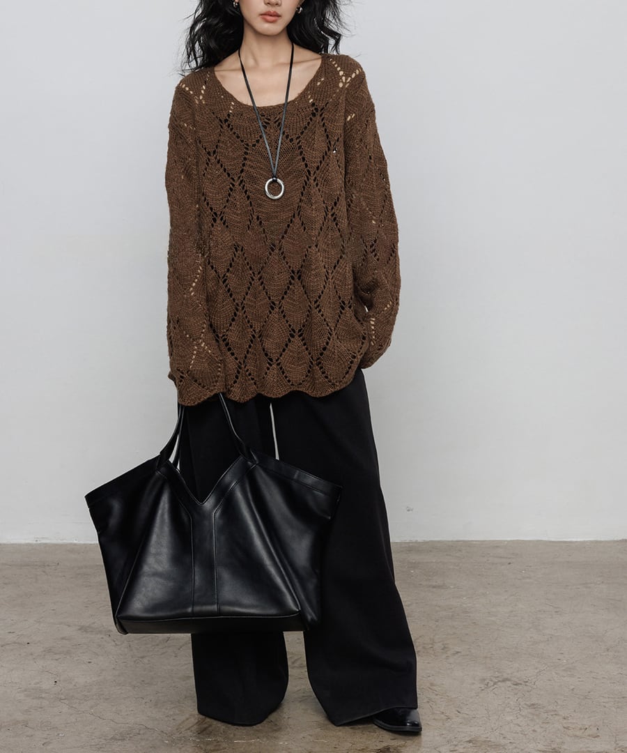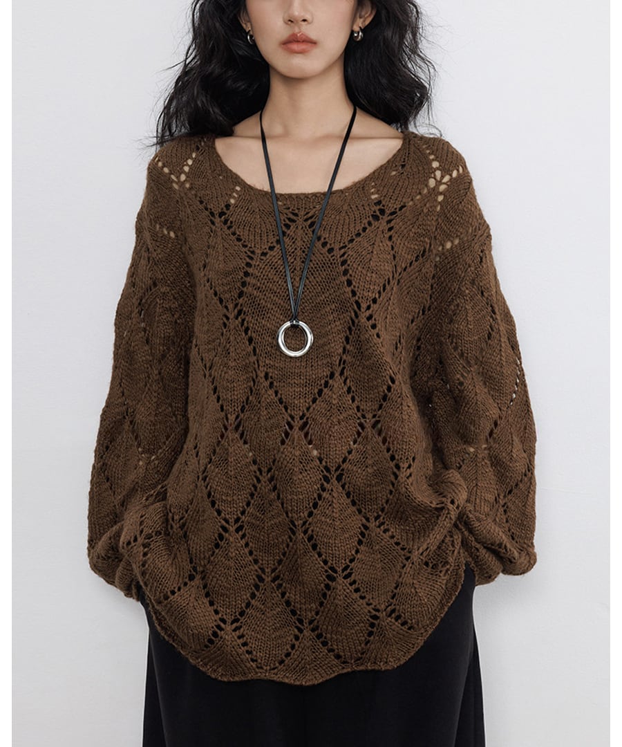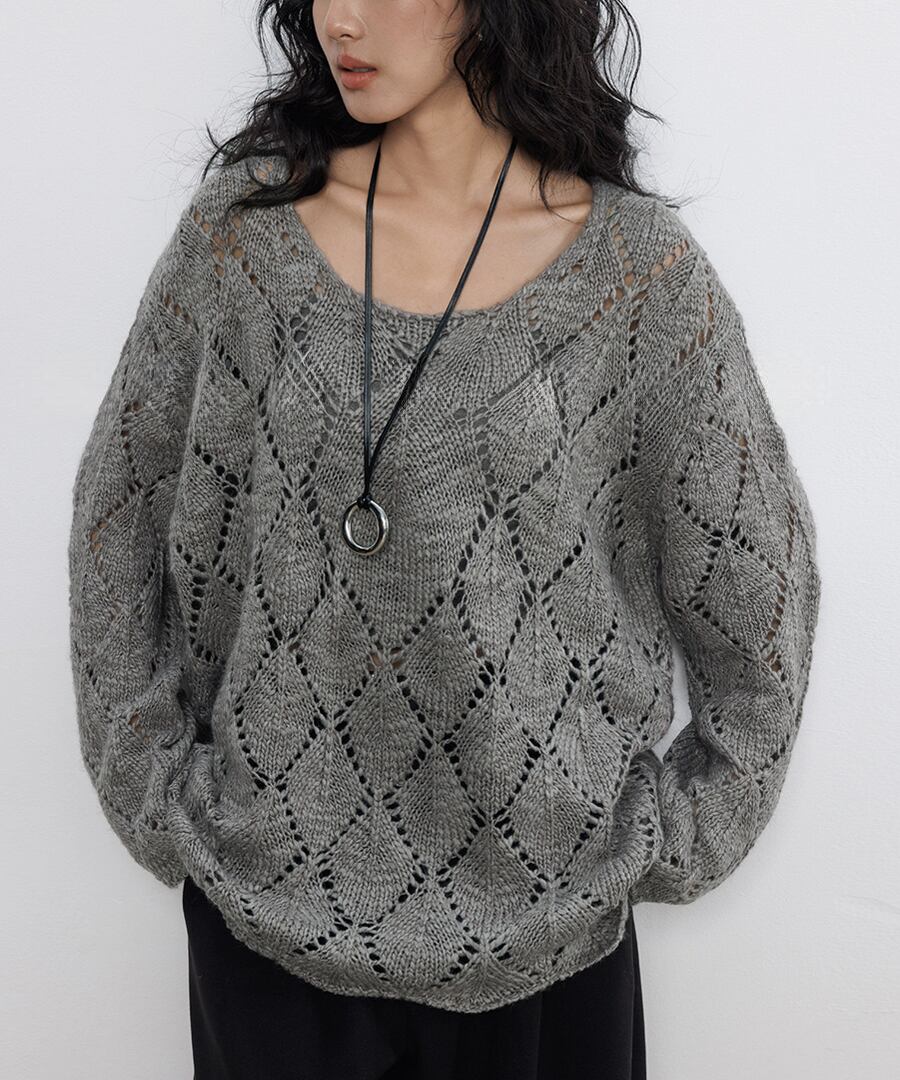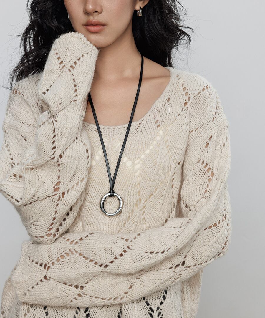 オフショルダーデザインが特徴的な、ゆったりとしたシルエットのニットセーター。柔らかなウール素材を使用しており、肌触りも抜群です。ホローアウトのディテールが魅力的で、シンプルながらも洗練された印象を演出します。デイリースタイルに取り入れやすく、春先の羽織りものとしても大活躍間違いなしです。
