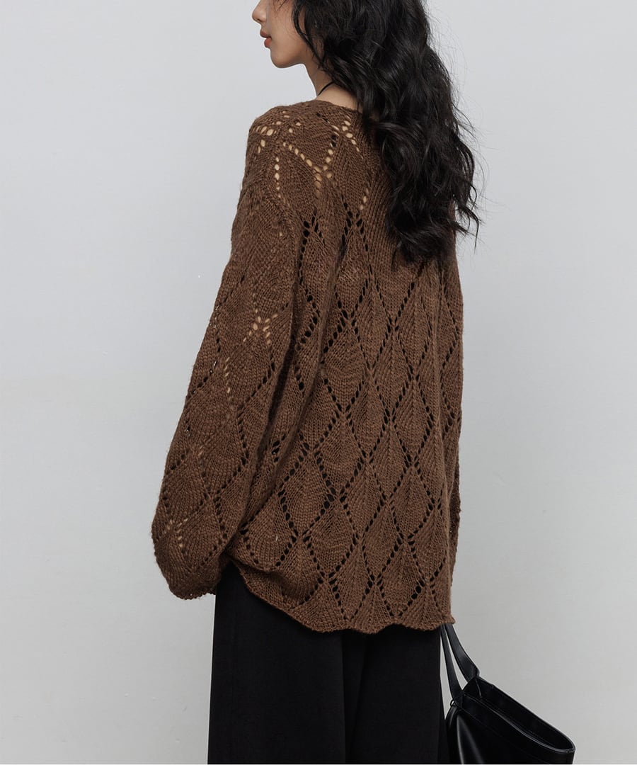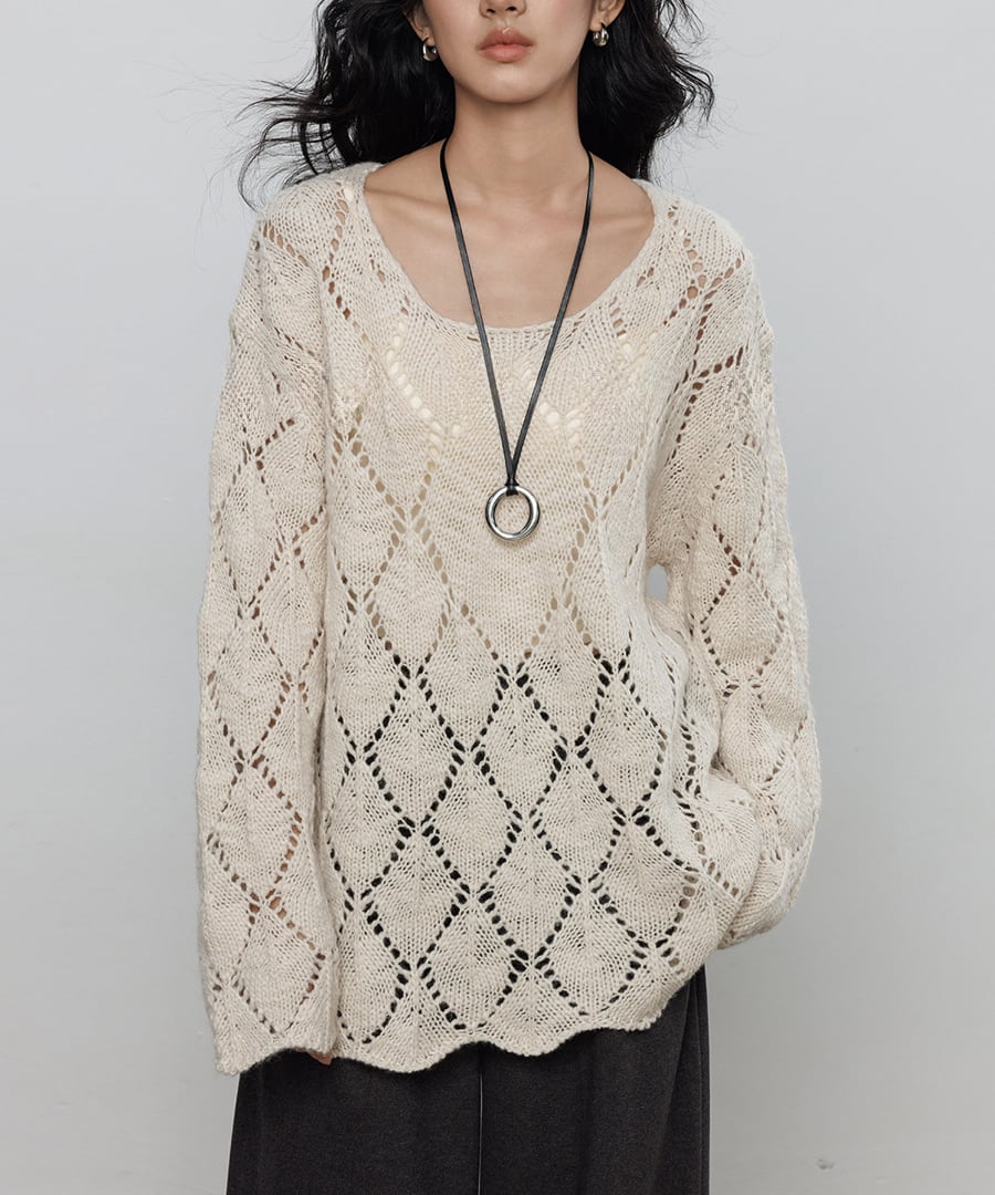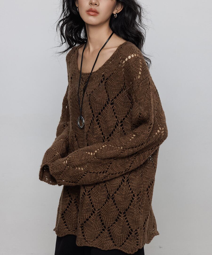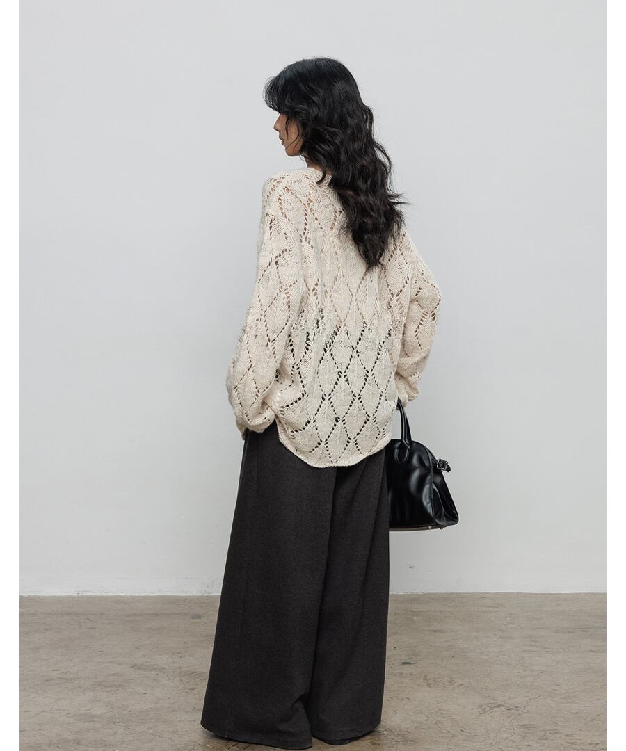 オフショルダーデザインが特徴的な、ゆったりとしたシルエットのニットセーター。柔らかなウール素材を使用しており、肌触りも抜群です。ホローアウトのディテールが魅力的で、シンプルながらも洗練された印象を演出します。デイリースタイルに取り入れやすく、春先の羽織りものとしても大活躍間違いなしです。