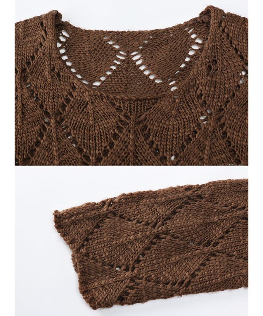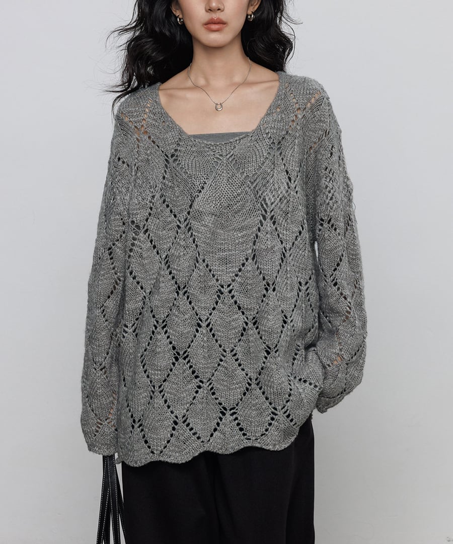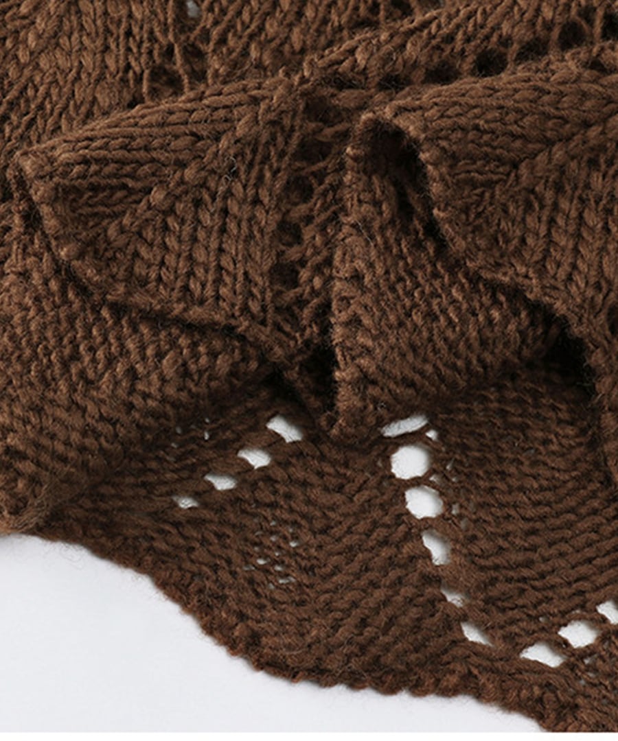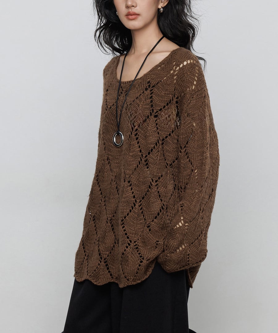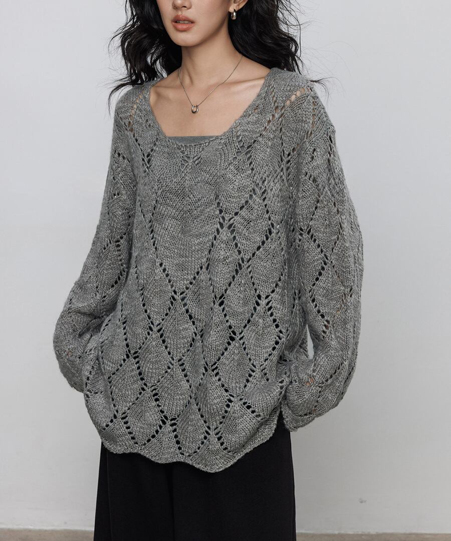 オフショルダーデザインが特徴的な、ゆったりとしたシルエットのニットセーター。柔らかなウール素材を使用しており、肌触りも抜群です。ホローアウトのディテールが魅力的で、シンプルながらも洗練された印象を演出します。デイリースタイルに取り入れやすく、春先の羽織りものとしても大活躍間違いなしです。