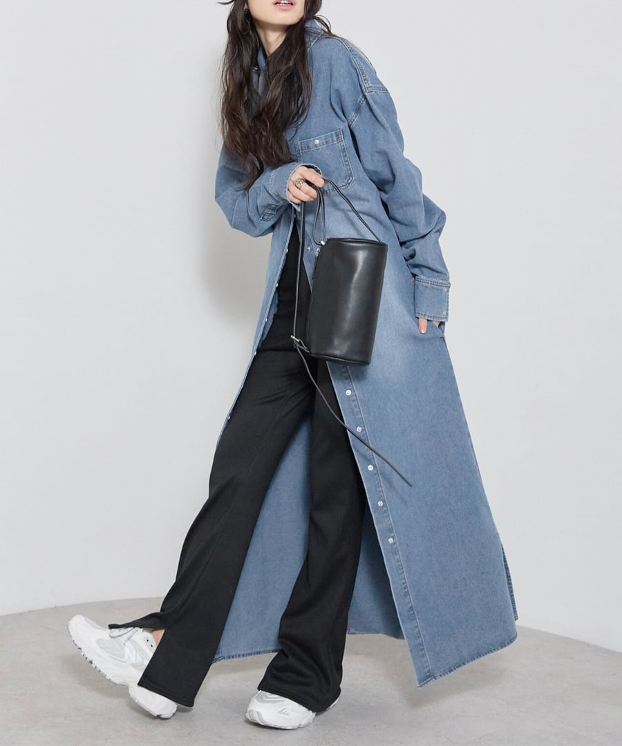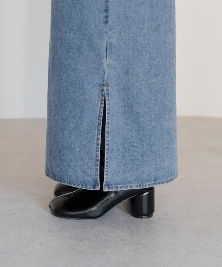 程よく落ち感のあるデニムで、縦のラインをすっきりと引き立てる一枚。