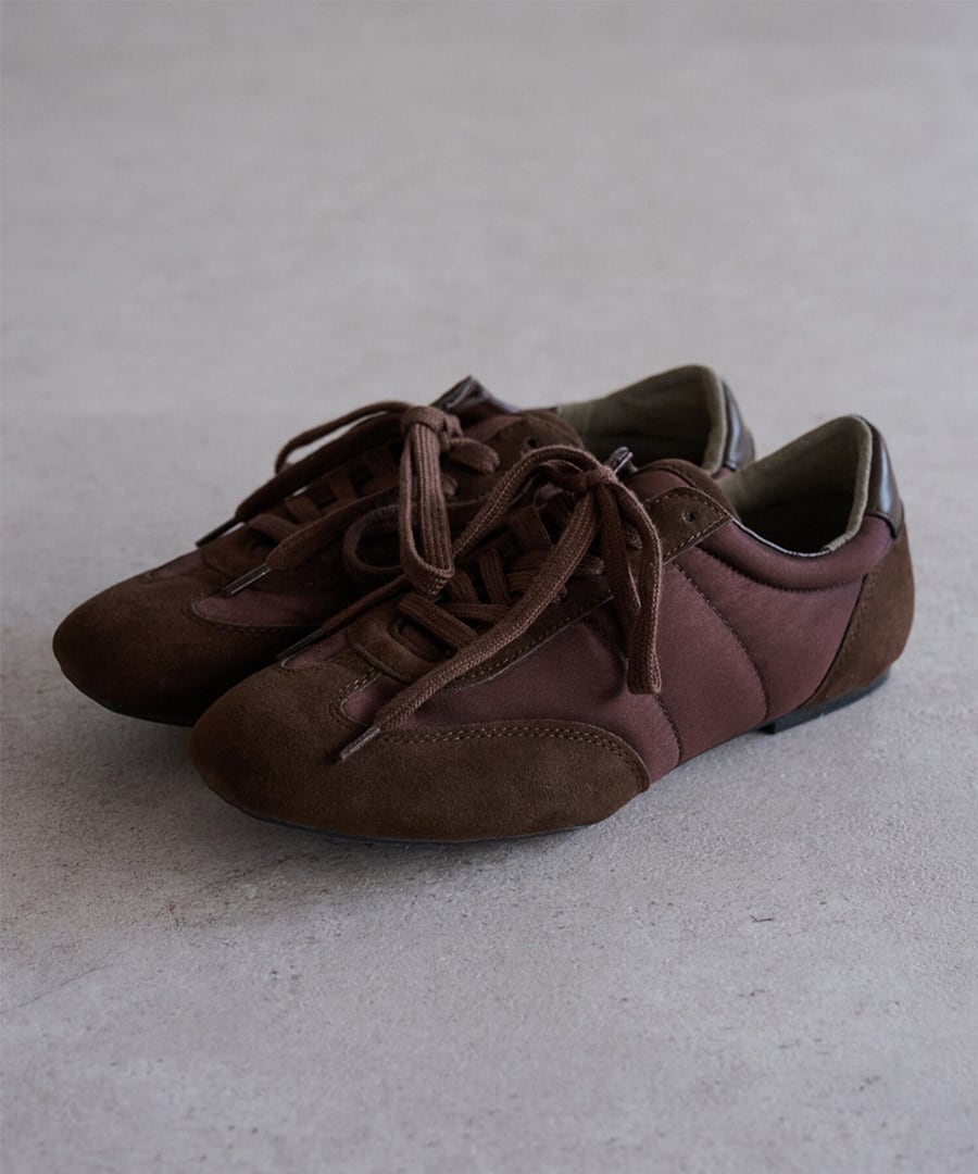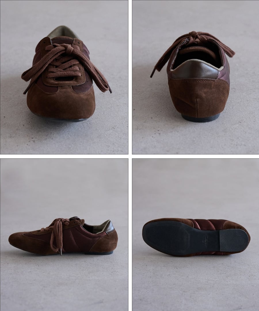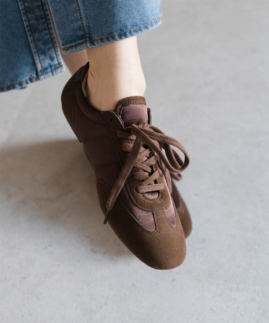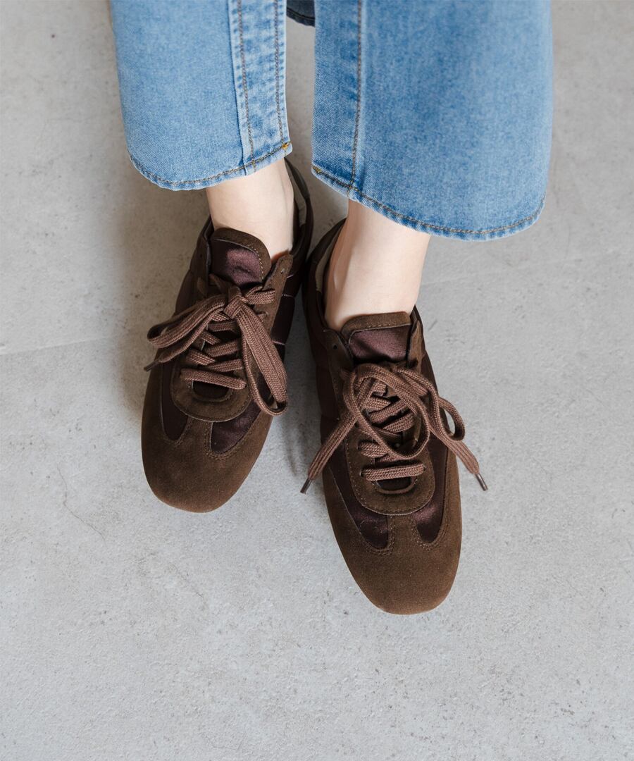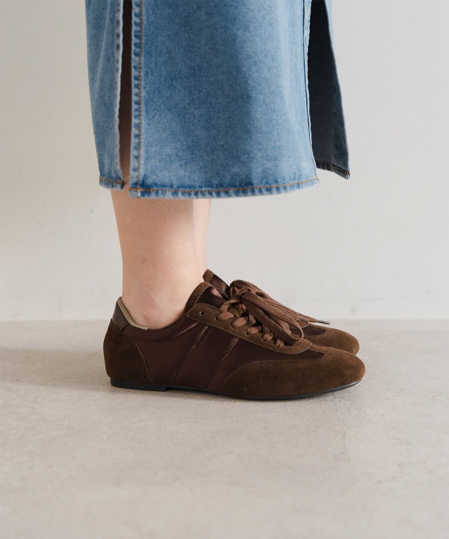 スエード調素材とファブリックの切り替えが、奥行きのある表情を添えます。