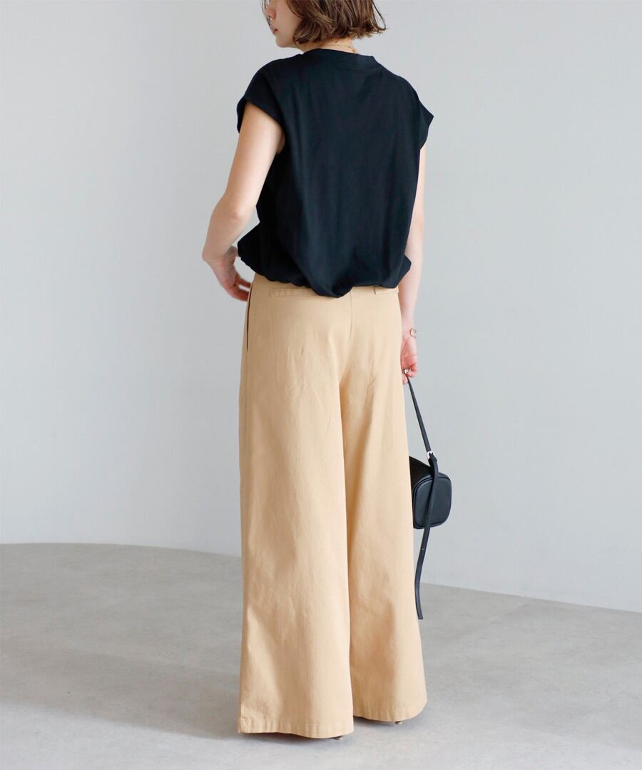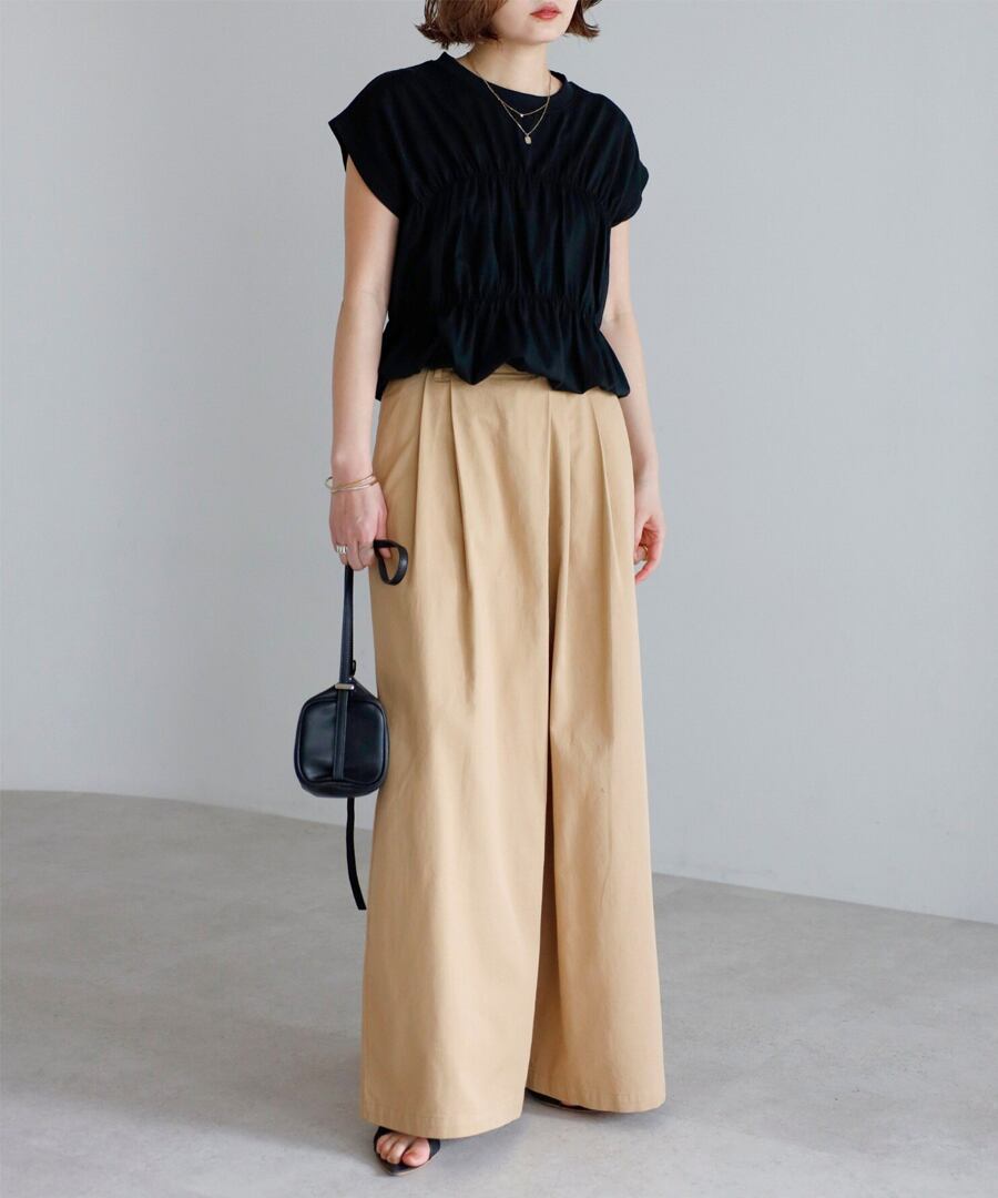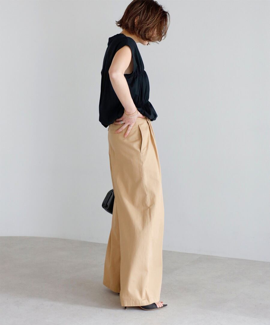 ワイドシルエットながら縦ラインを強調し、すっきりとしたバランスに仕上げました。