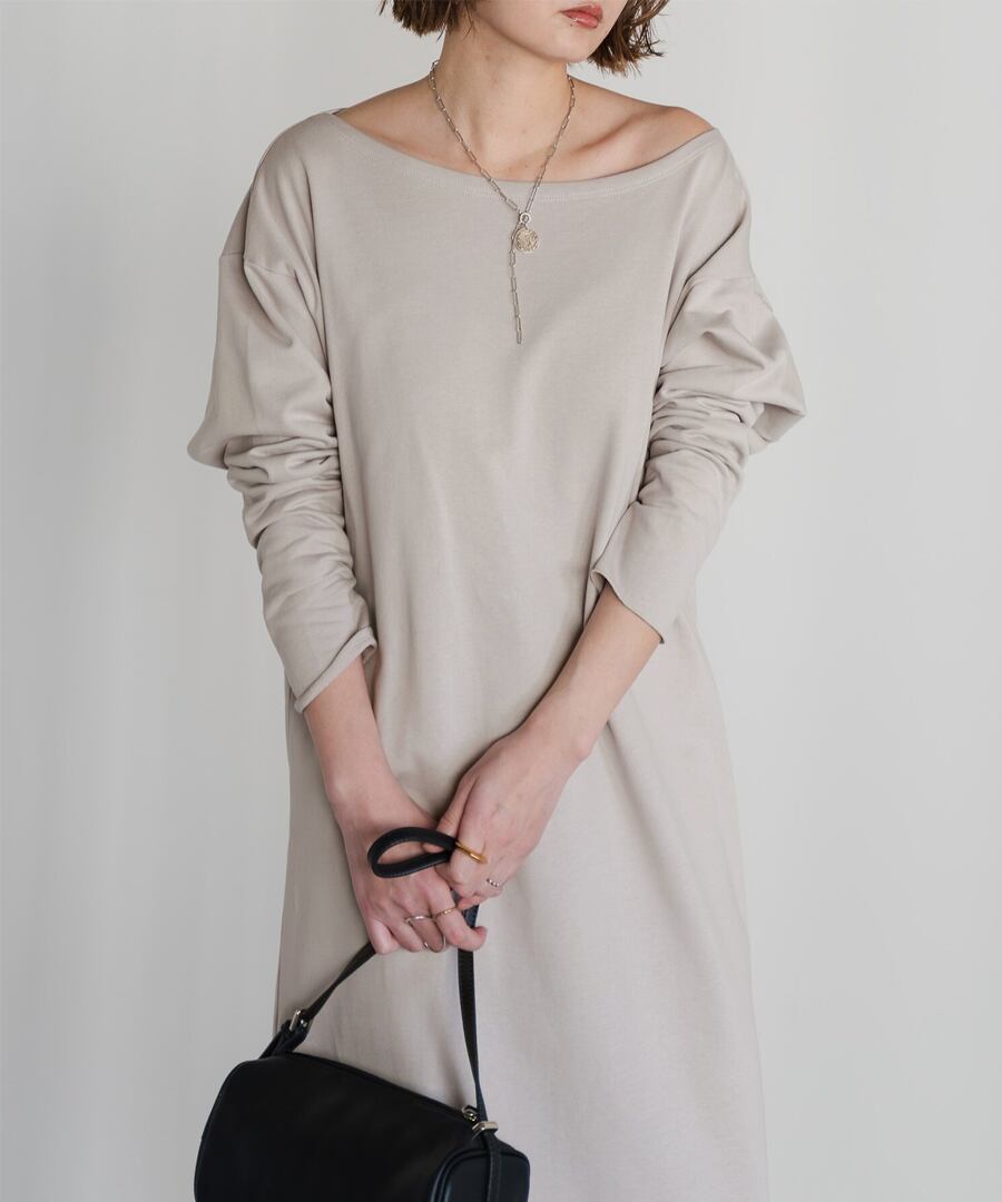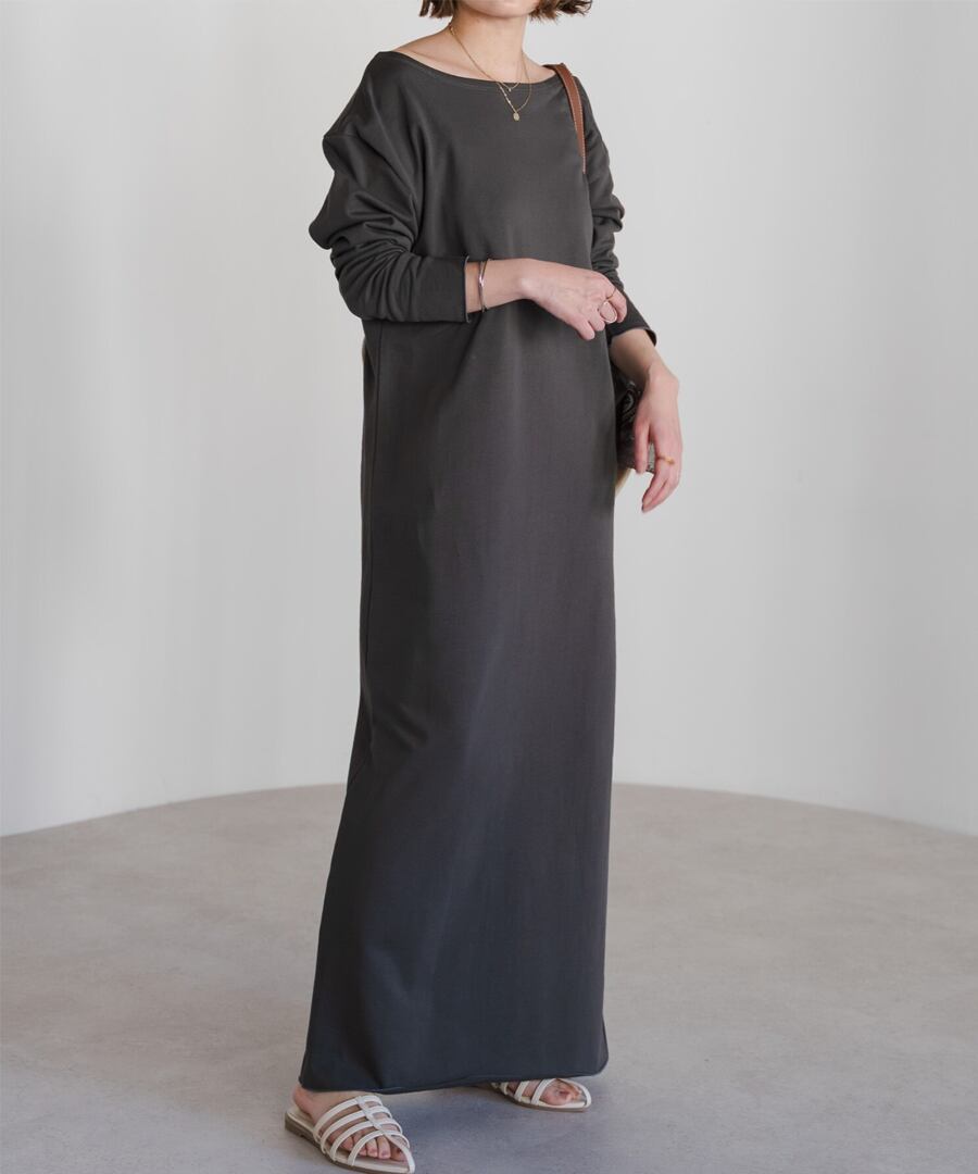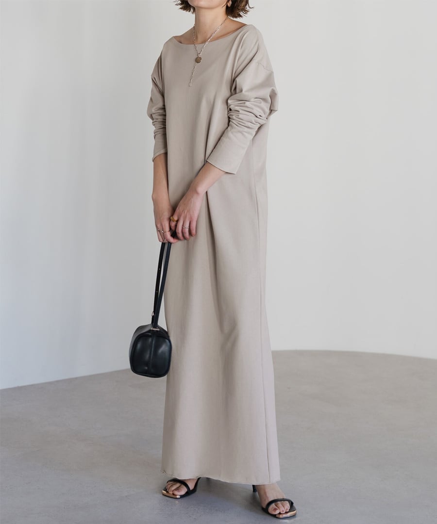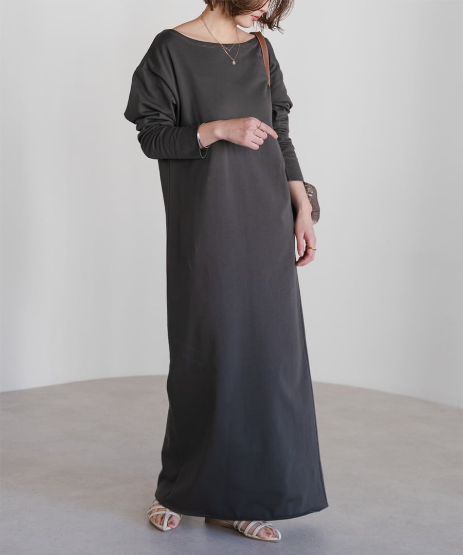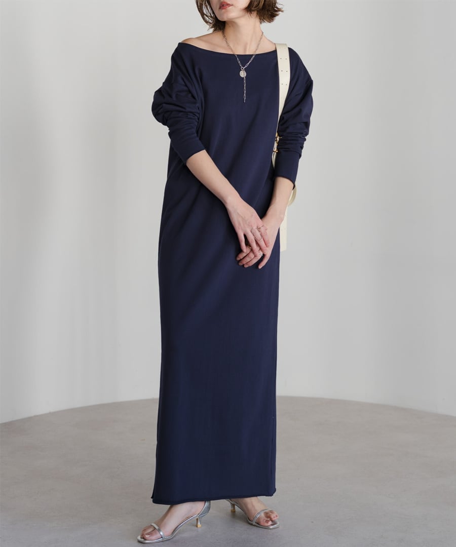 肩まわりをすっきり見せるオフショルダーが、程よい抜け感を演出するロングワンピース。