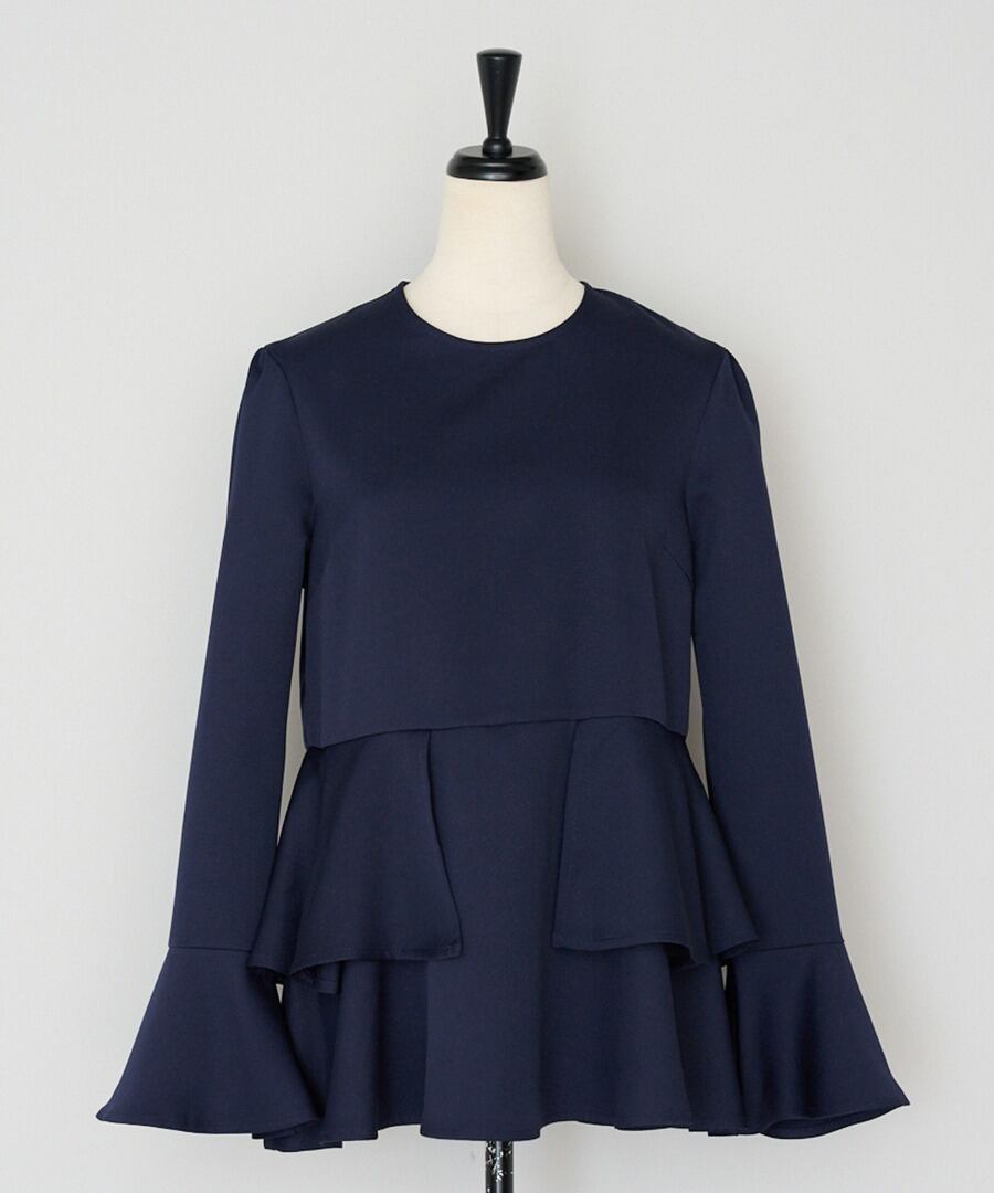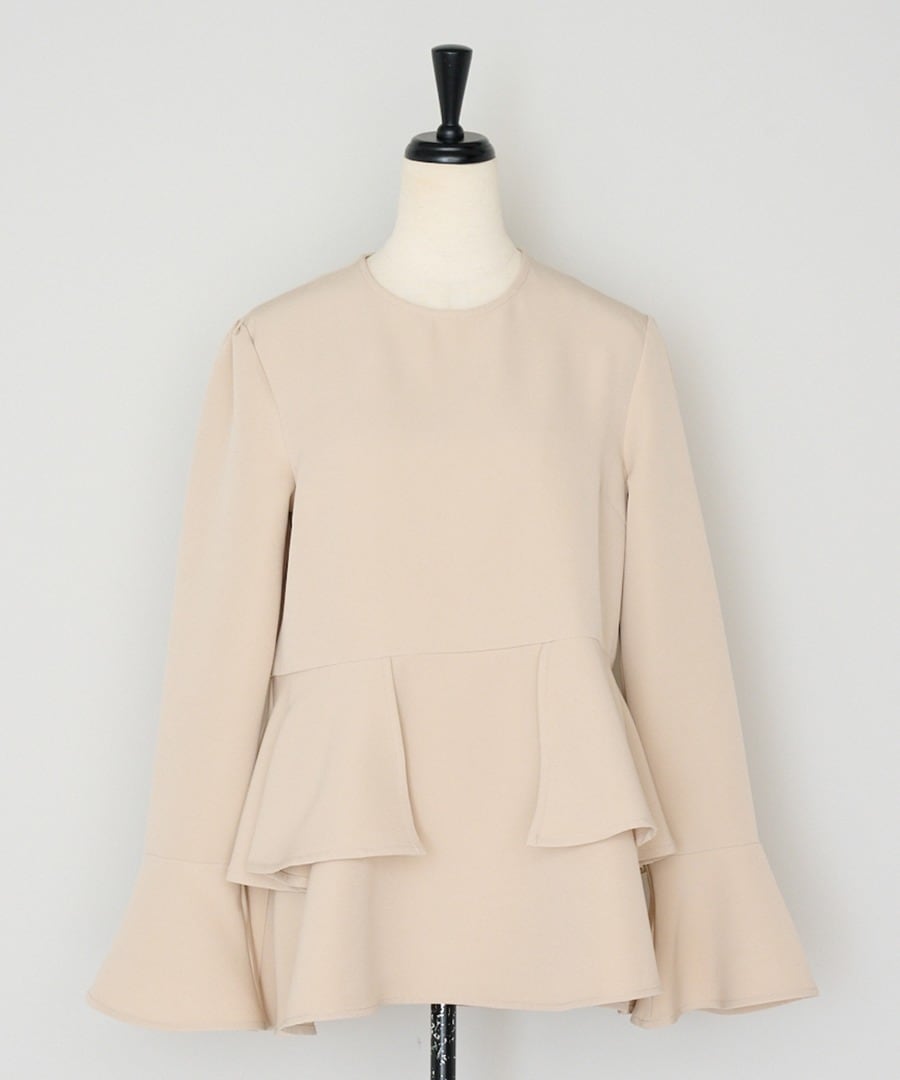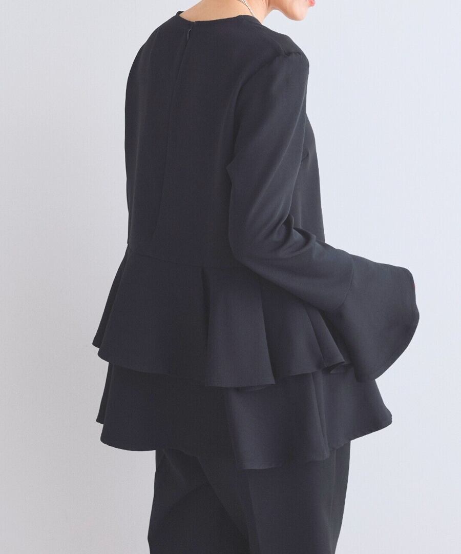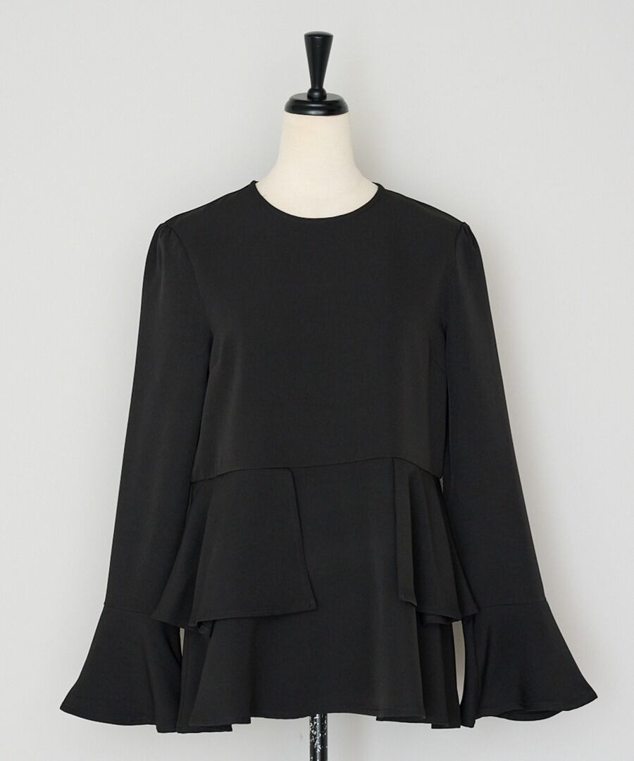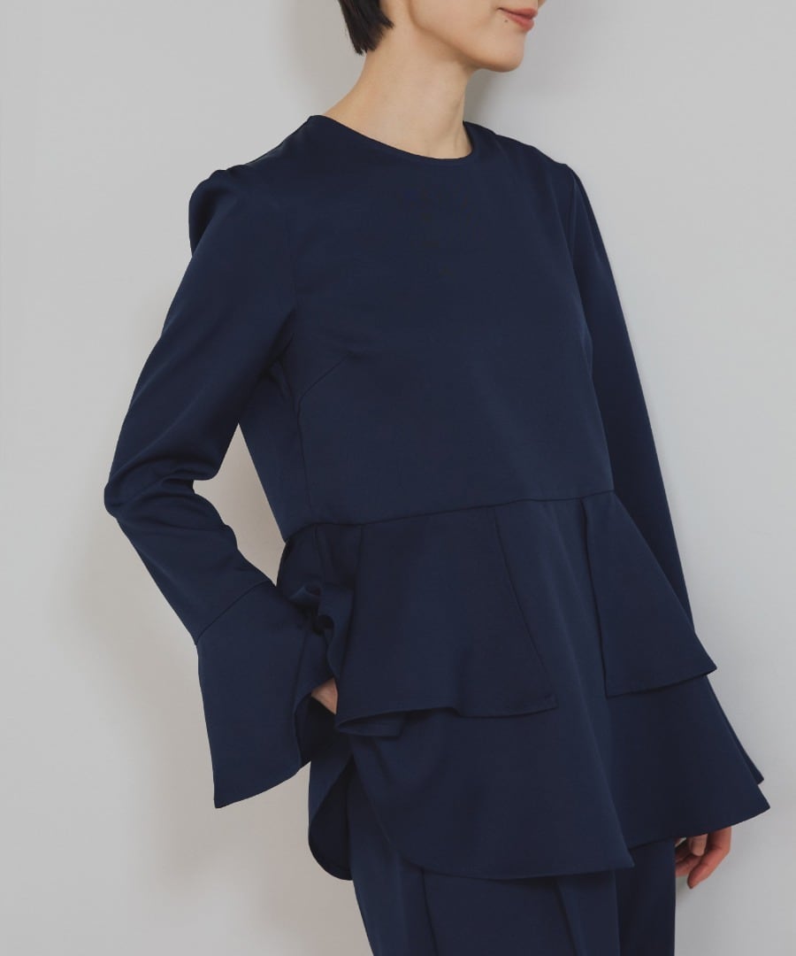 ウエスト位置から広がるペプラムフリルが、女性らしい立体フォルムを描くブラウス。