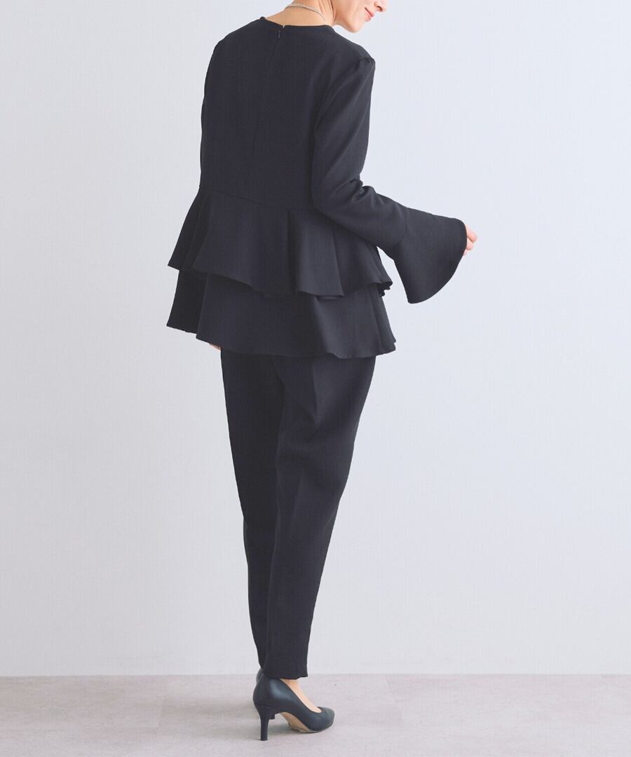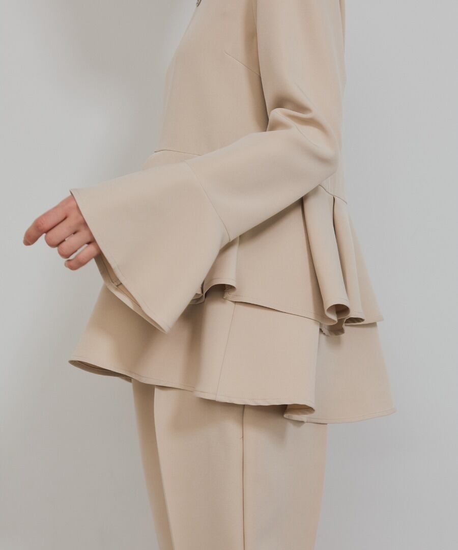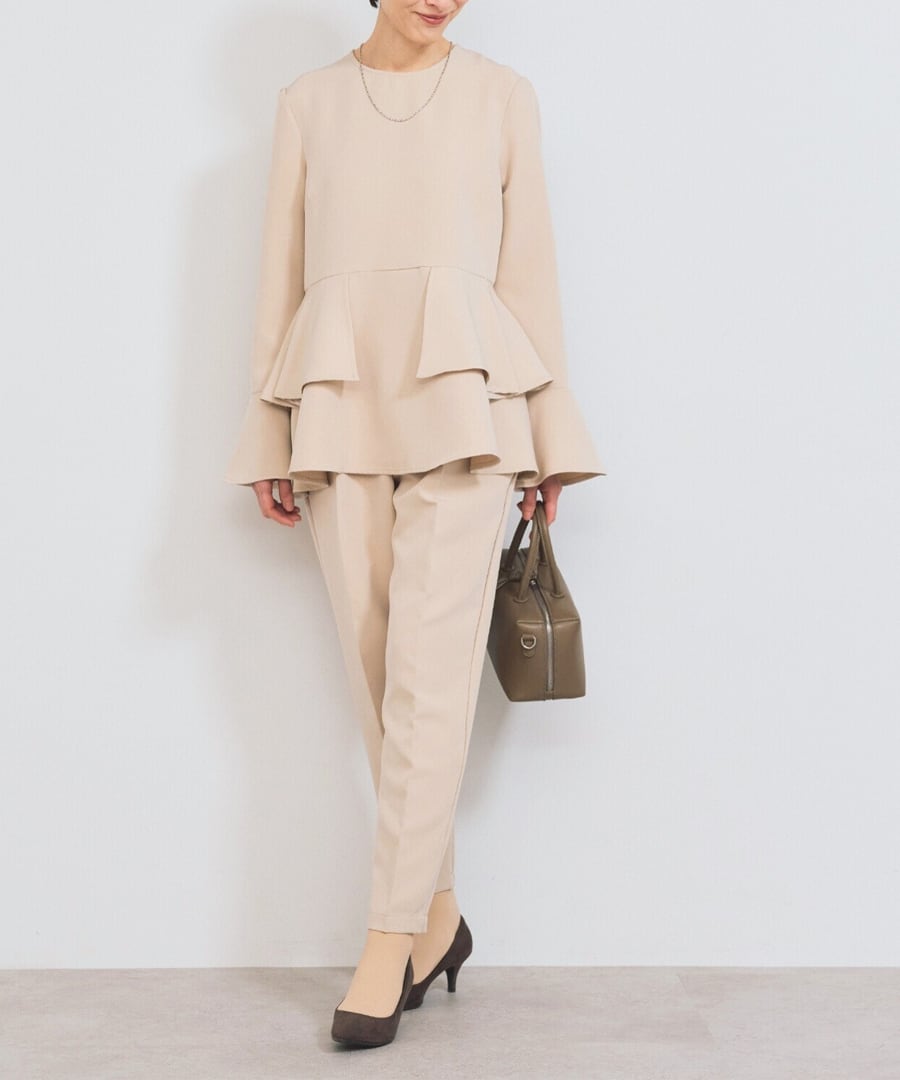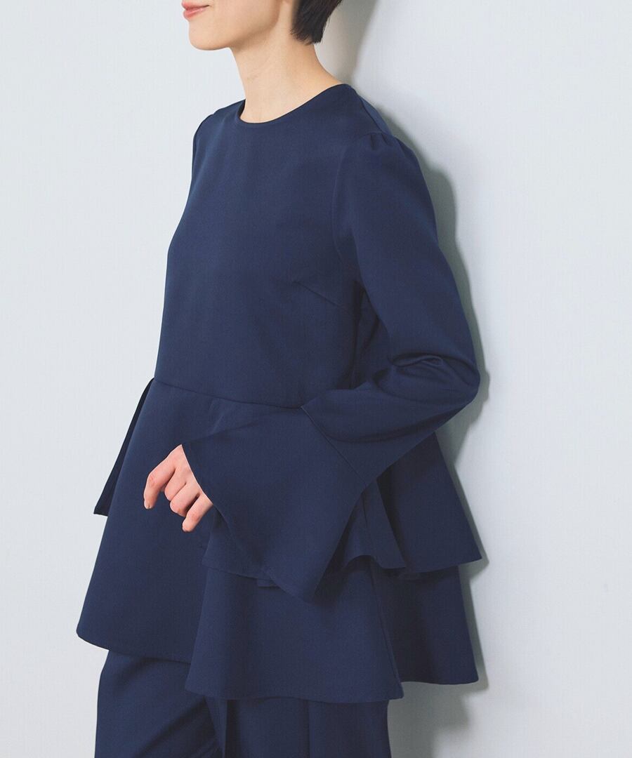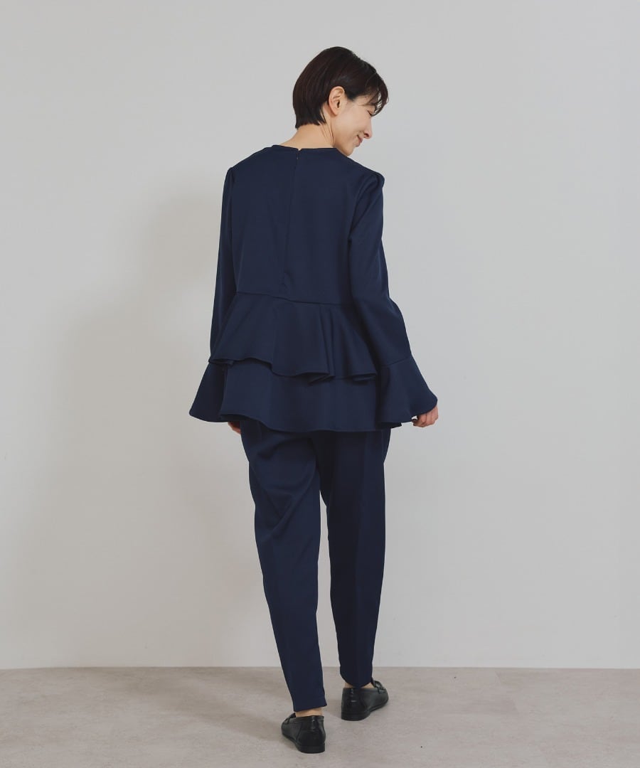 ウエスト位置から広がるペプラムフリルが、女性らしい立体フォルムを描くブラウス。