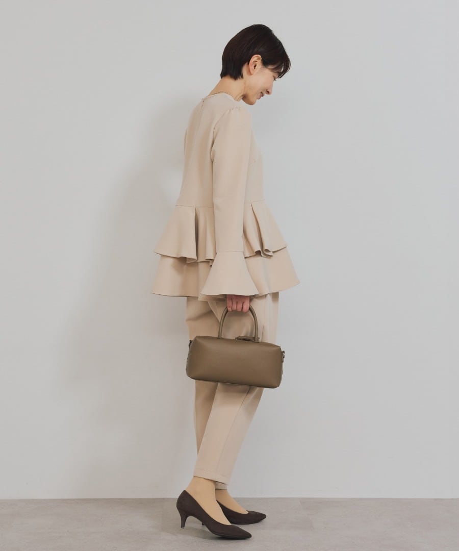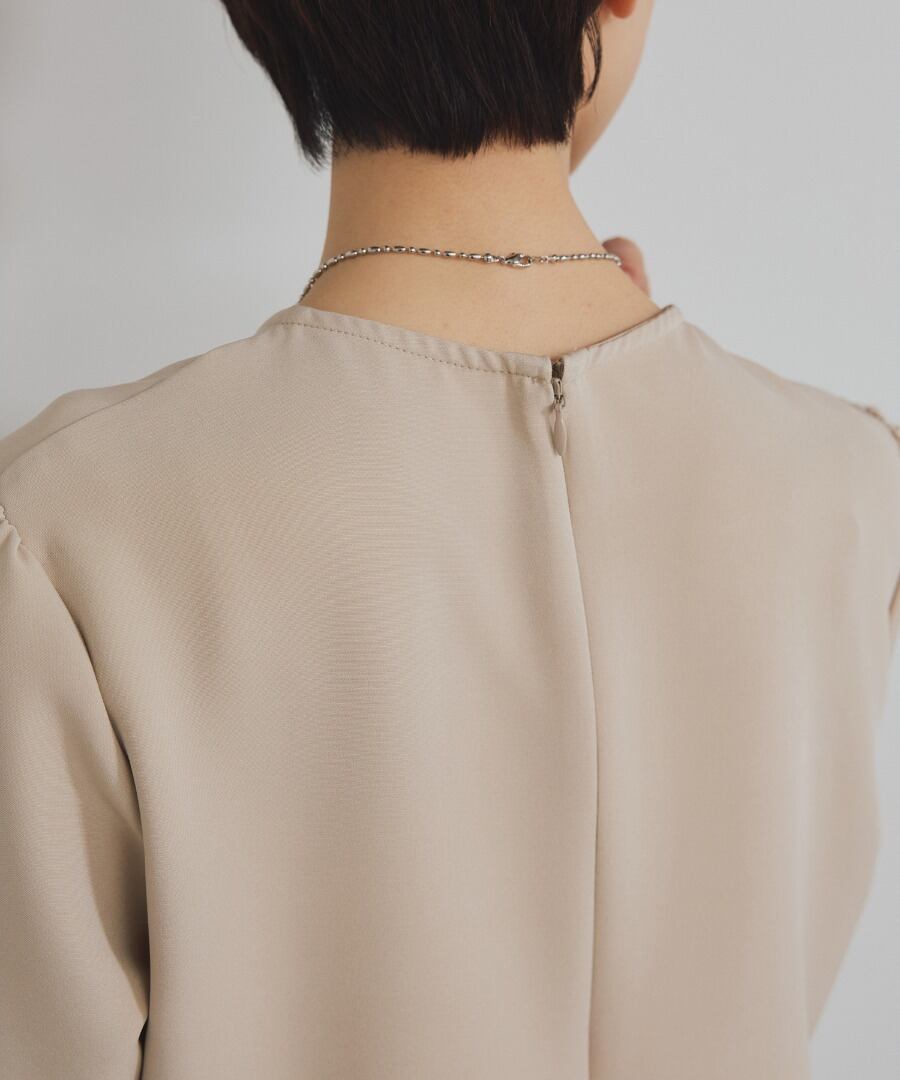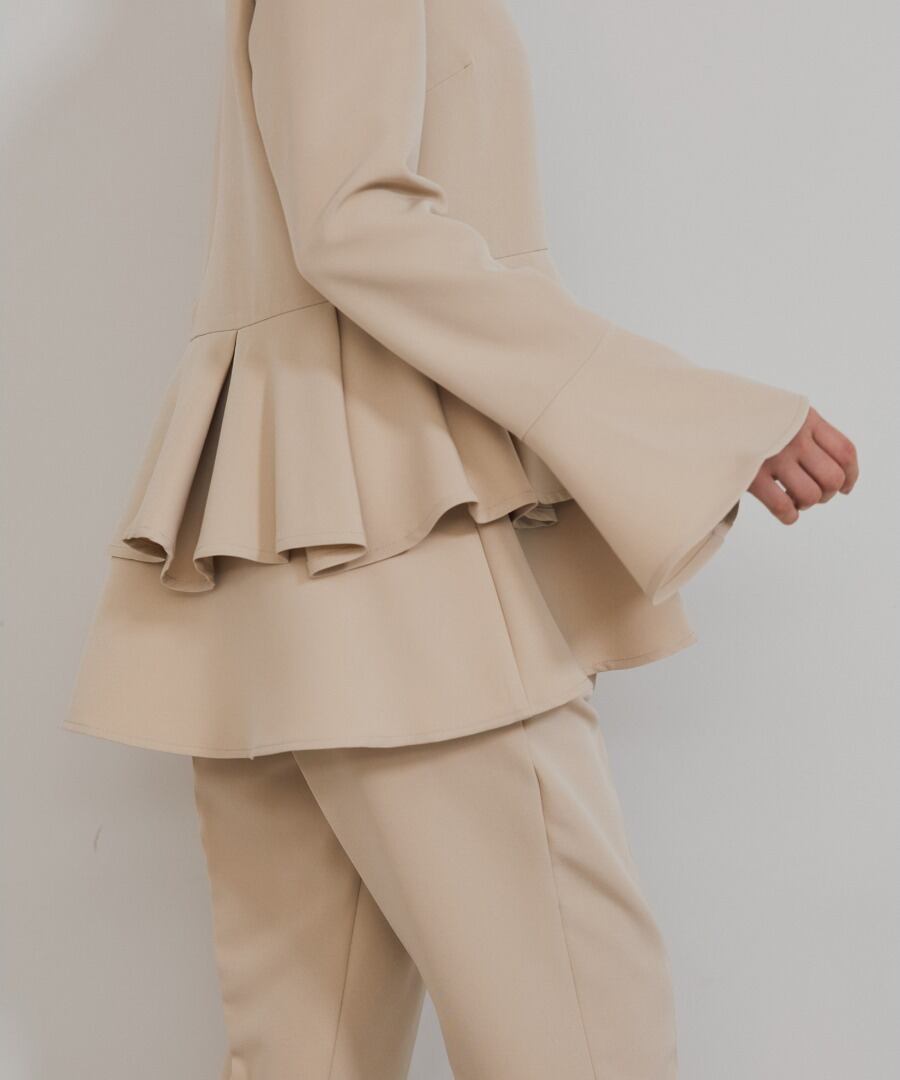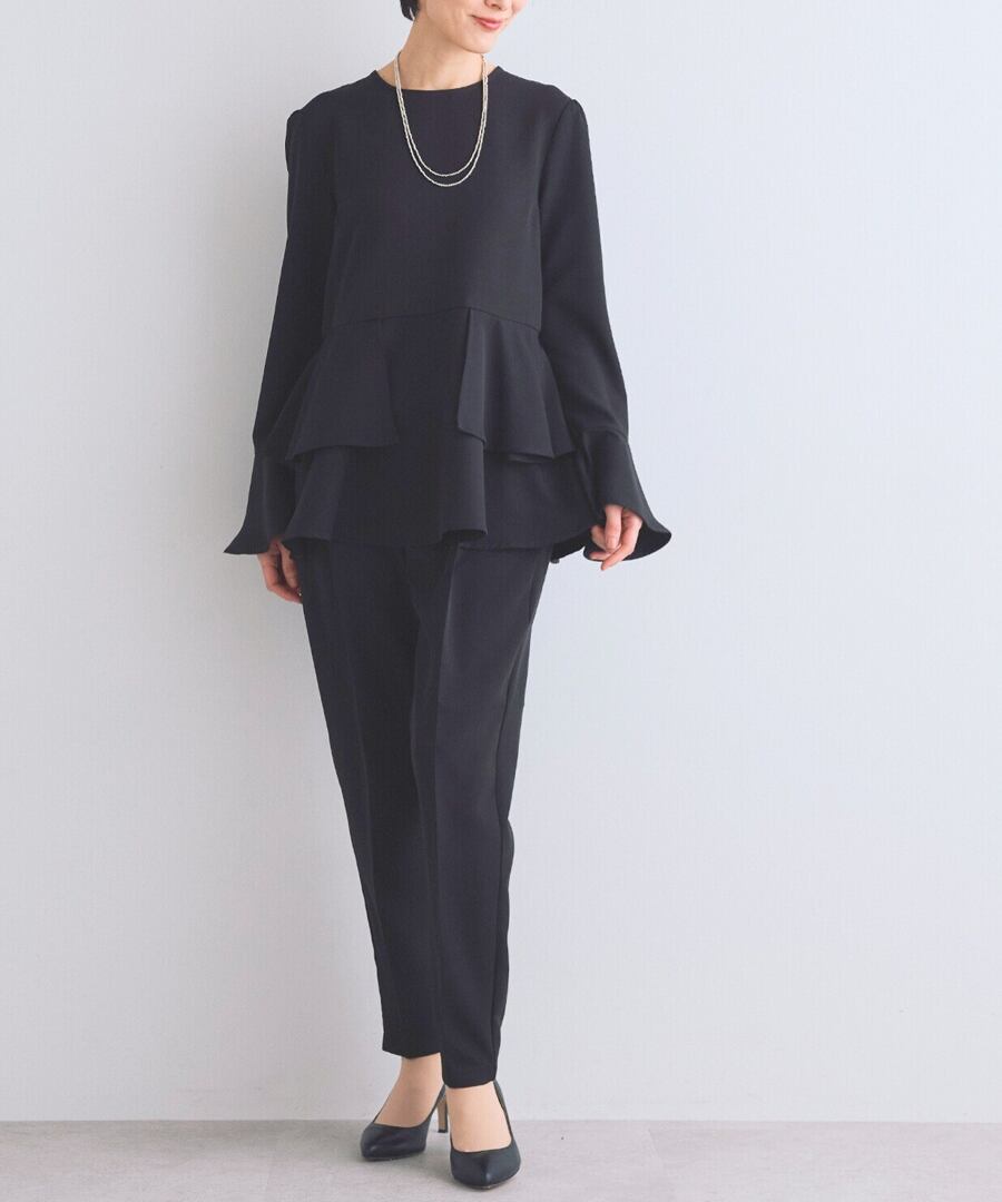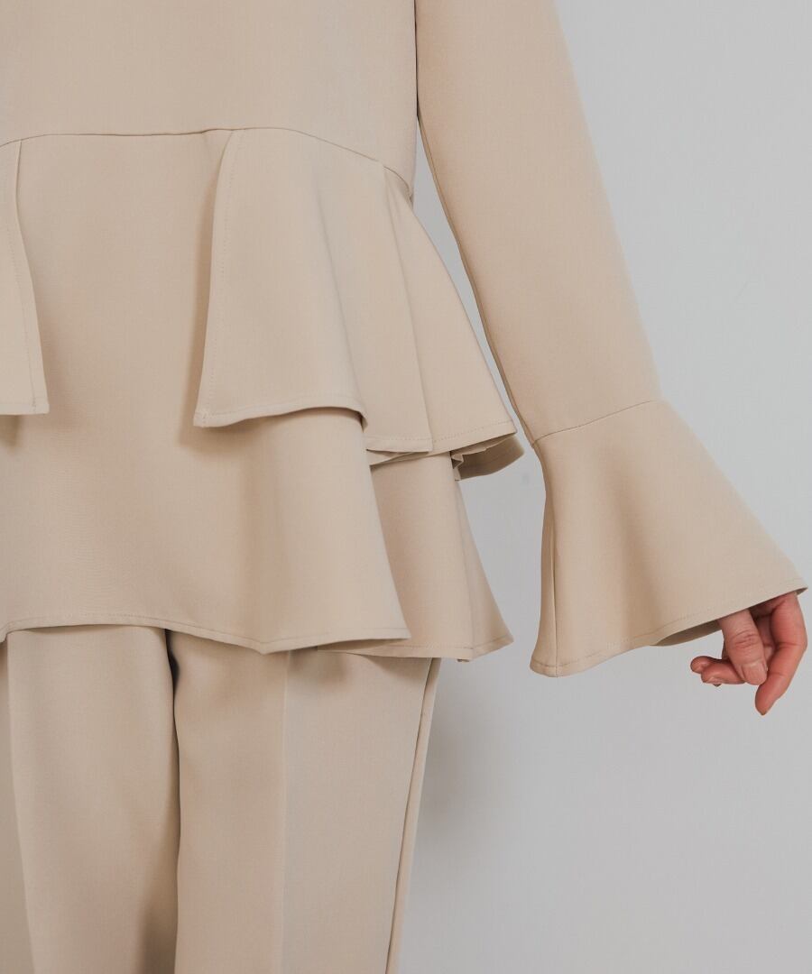 ウエスト位置から広がるペプラムフリルが、女性らしい立体フォルムを描くブラウス。