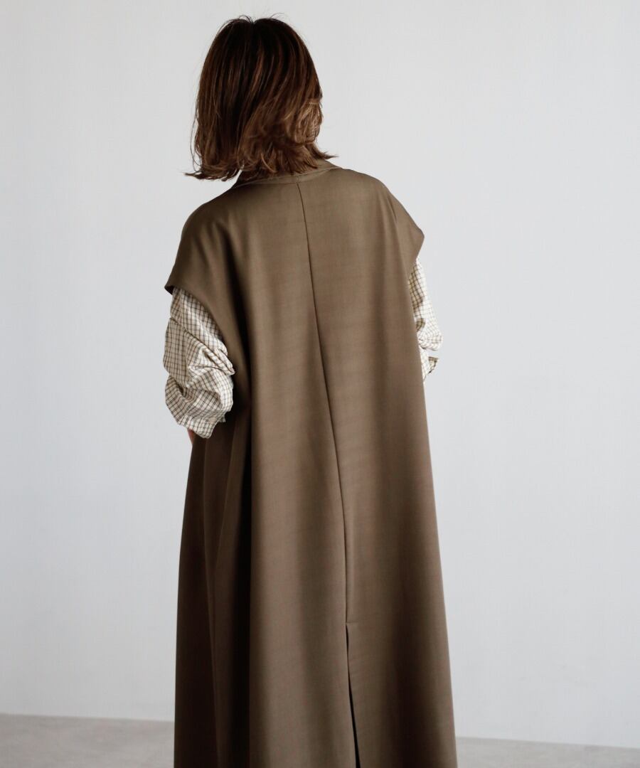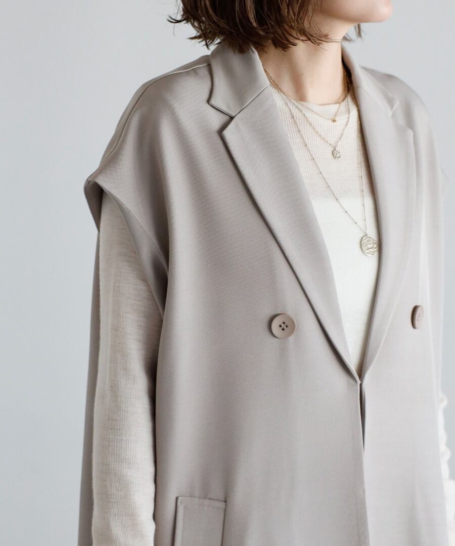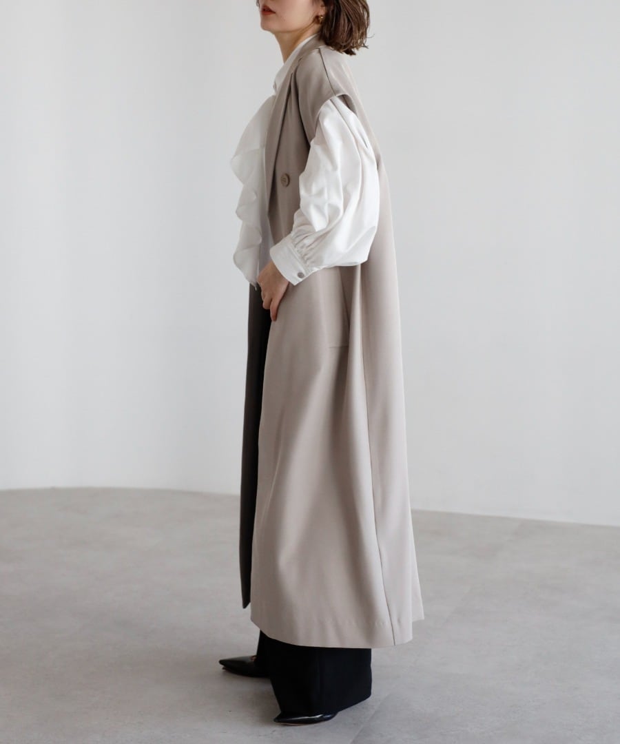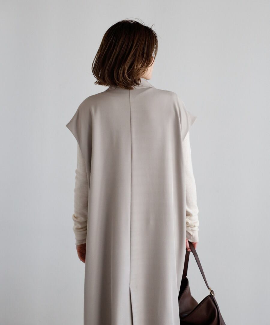 テーラードカラーを採用した、ジャケットライクなロングジレ。