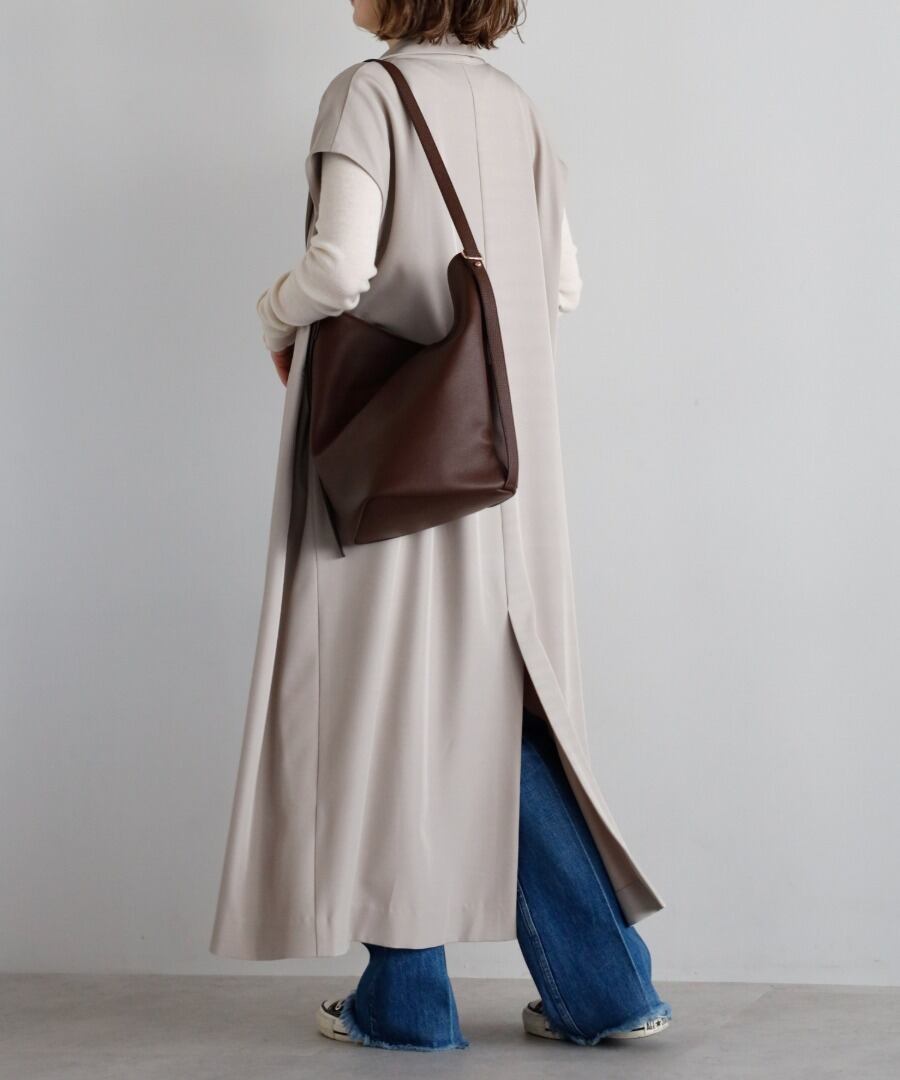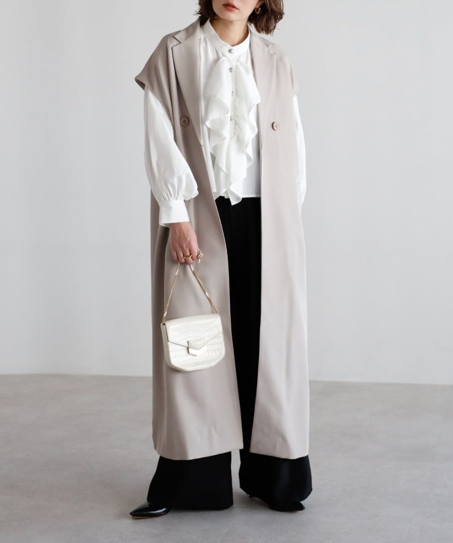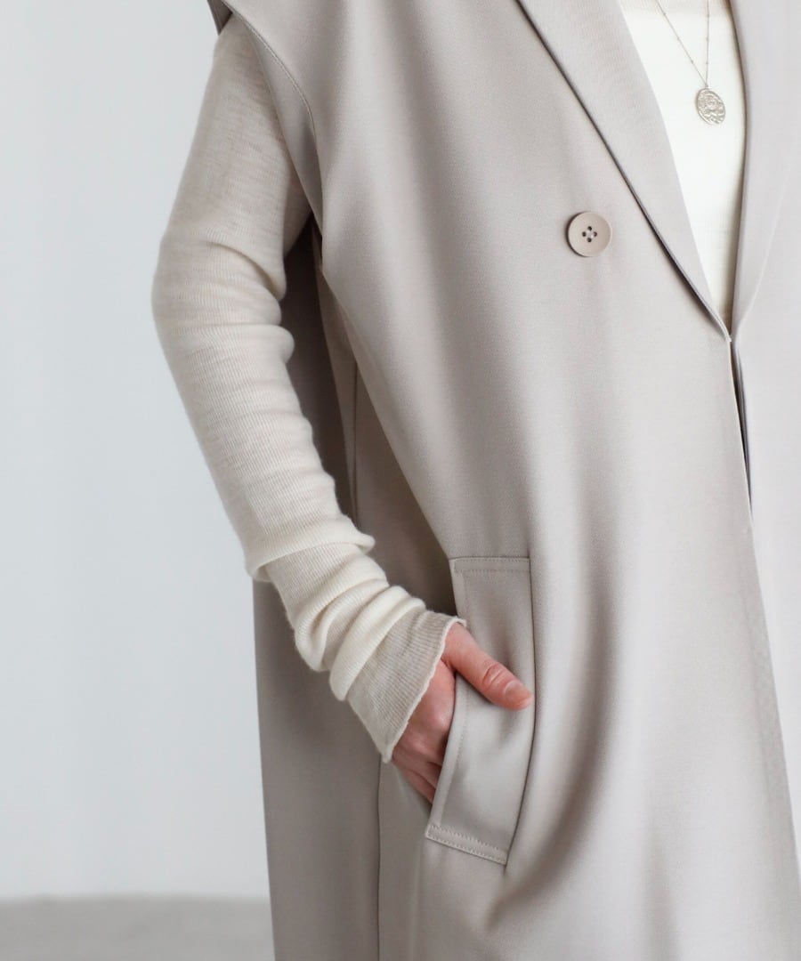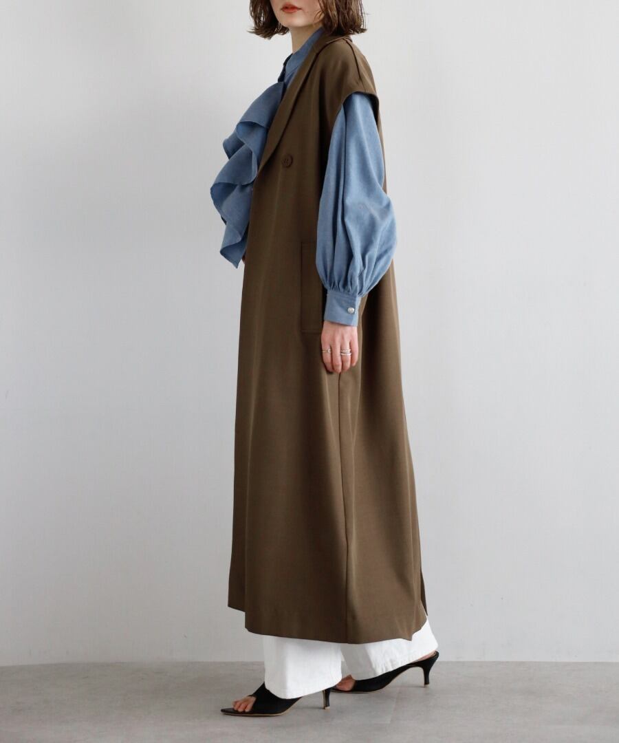 テーラードカラーを採用した、ジャケットライクなロングジレ。