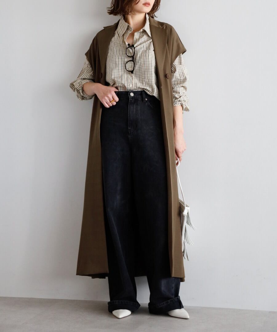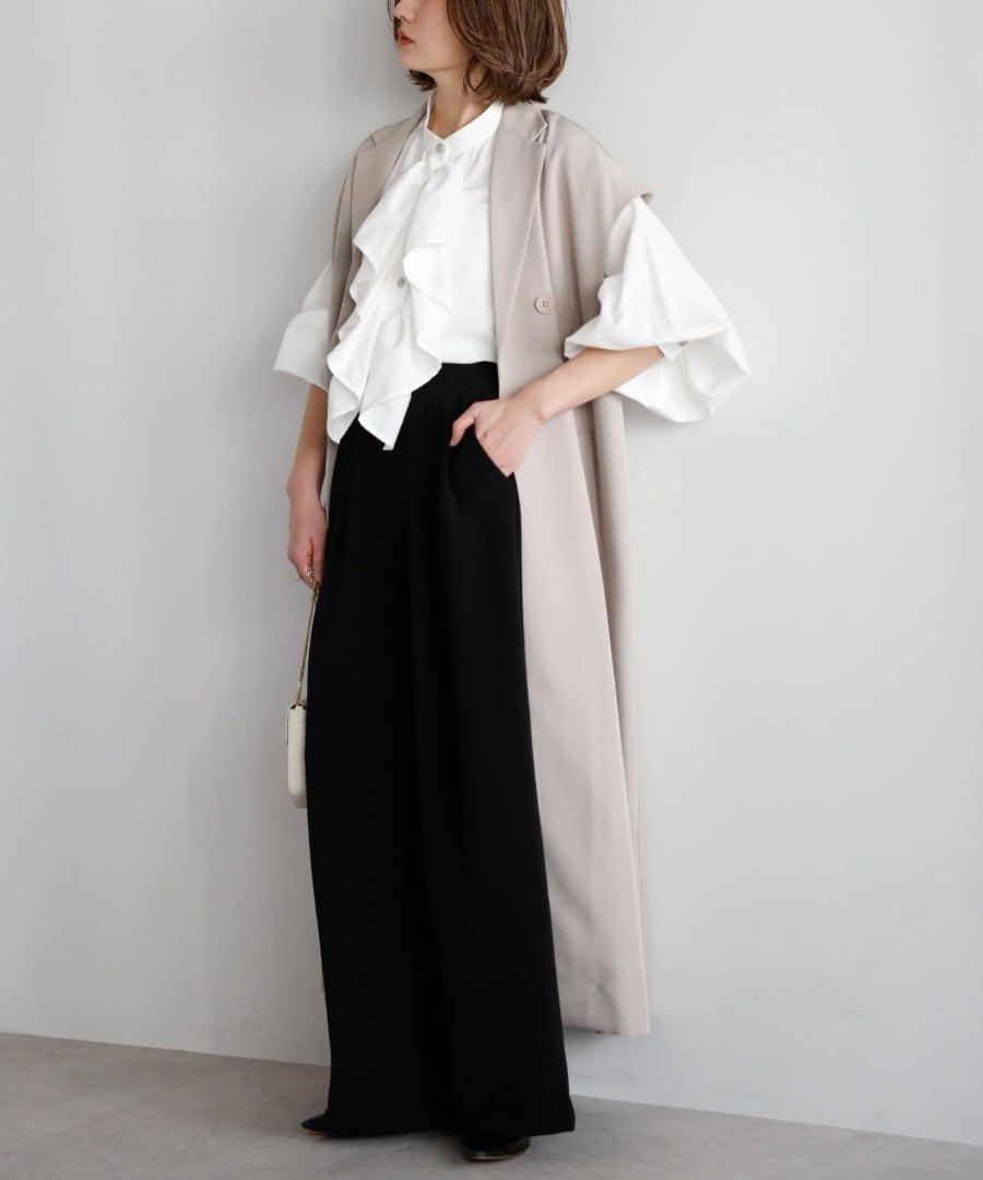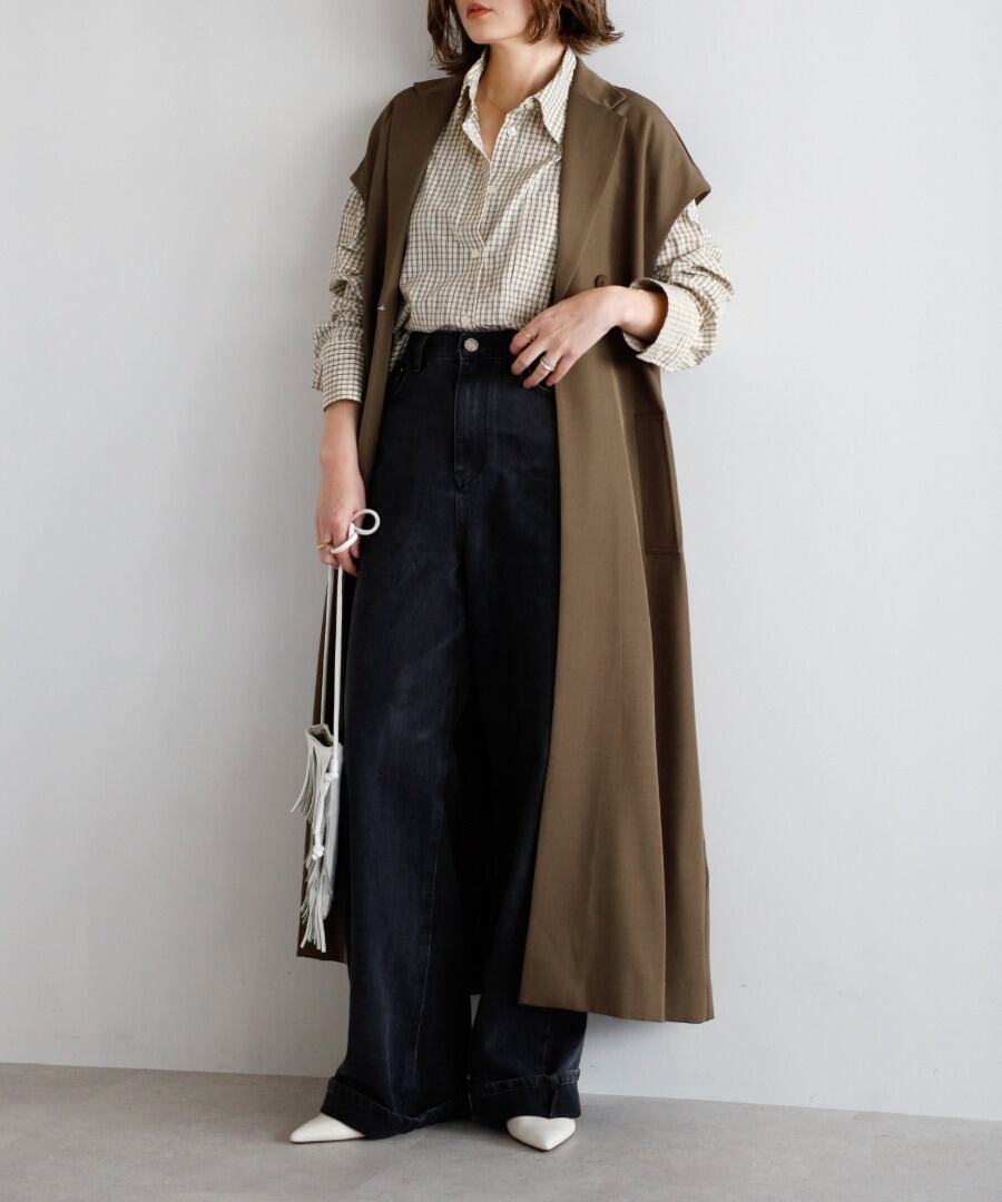 ロング丈シルエットが全体のラインをシャープにまとめる一着です。