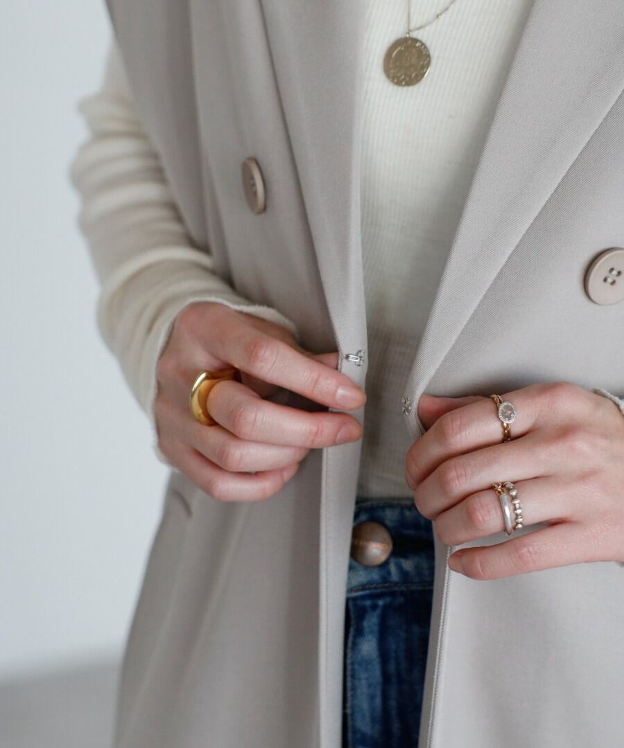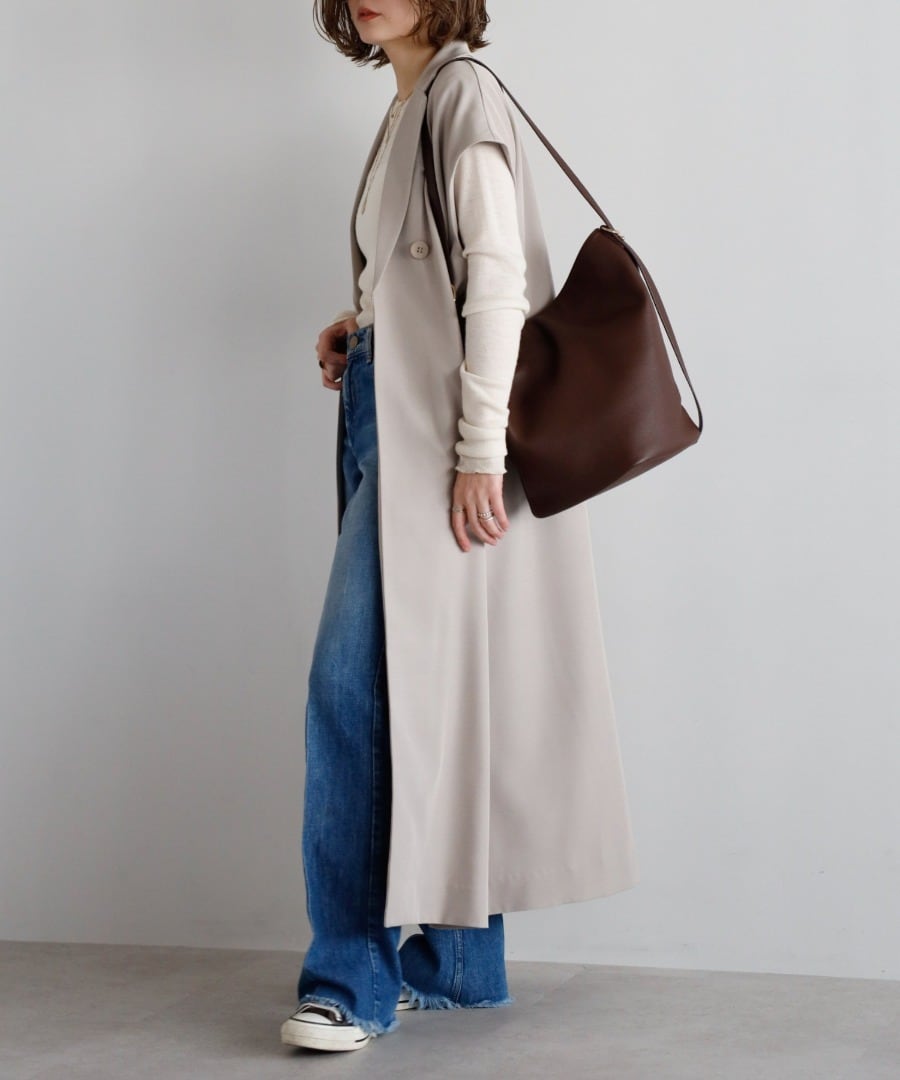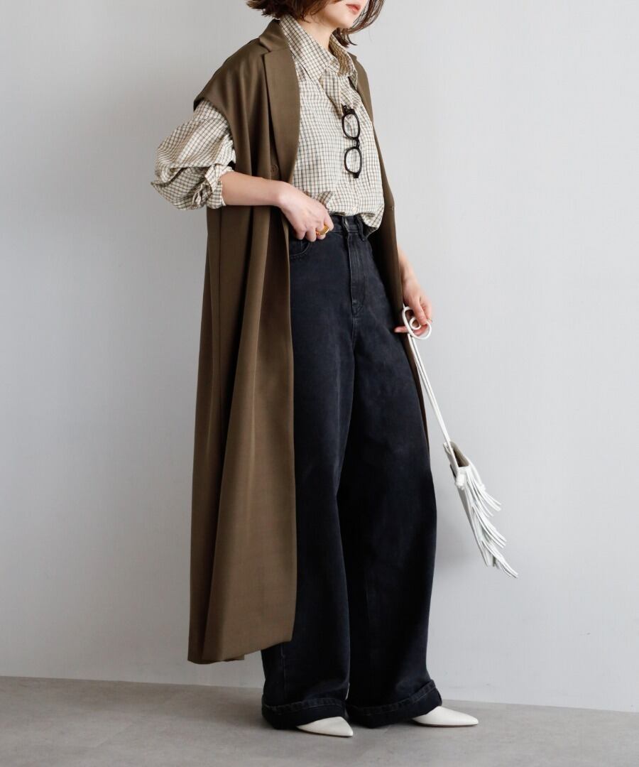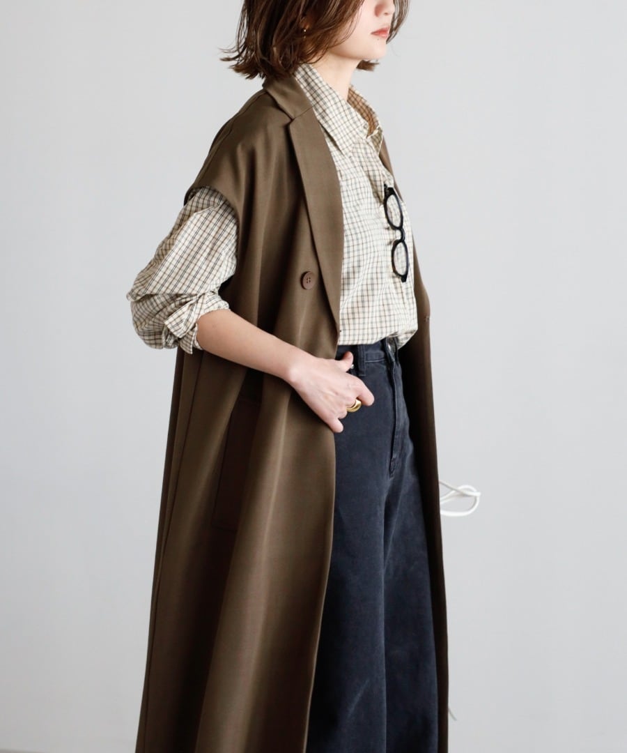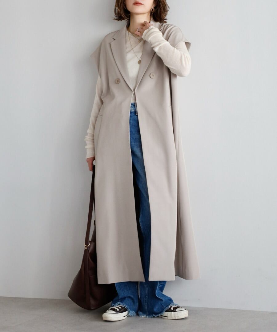端正な佇まいが際立つ、ロング丈テーラードジレ