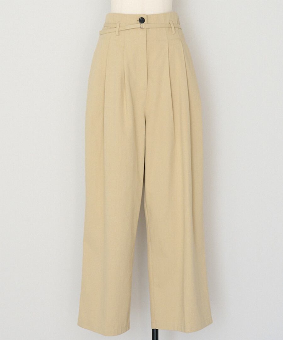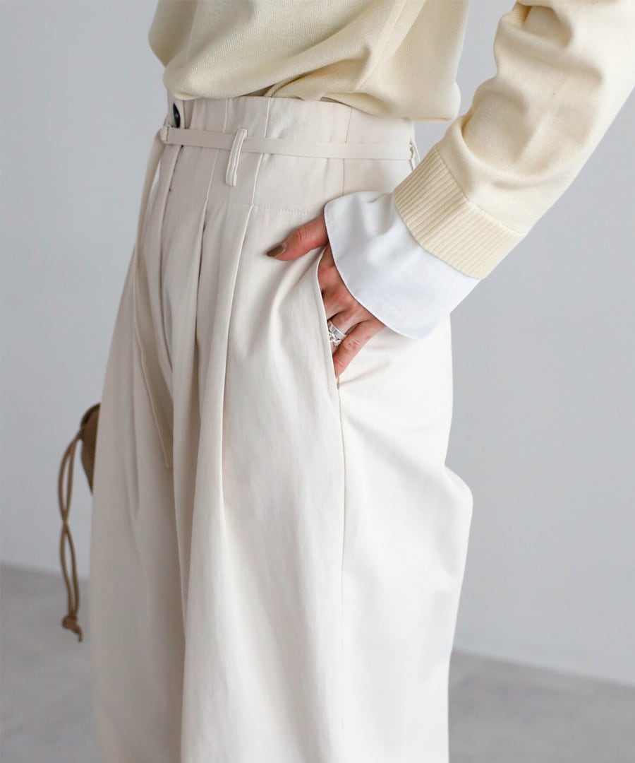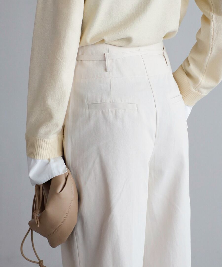 細ベルトが引き立てる、洗練ハイウエストタックパンツ