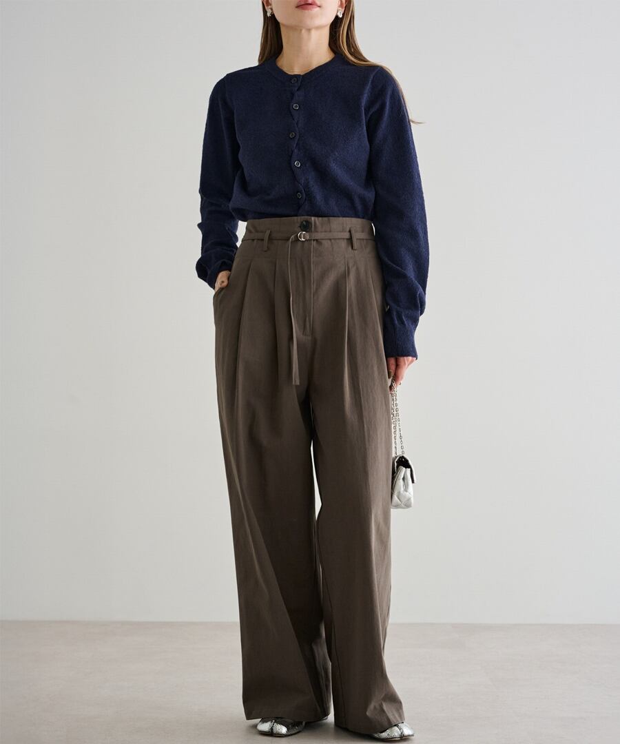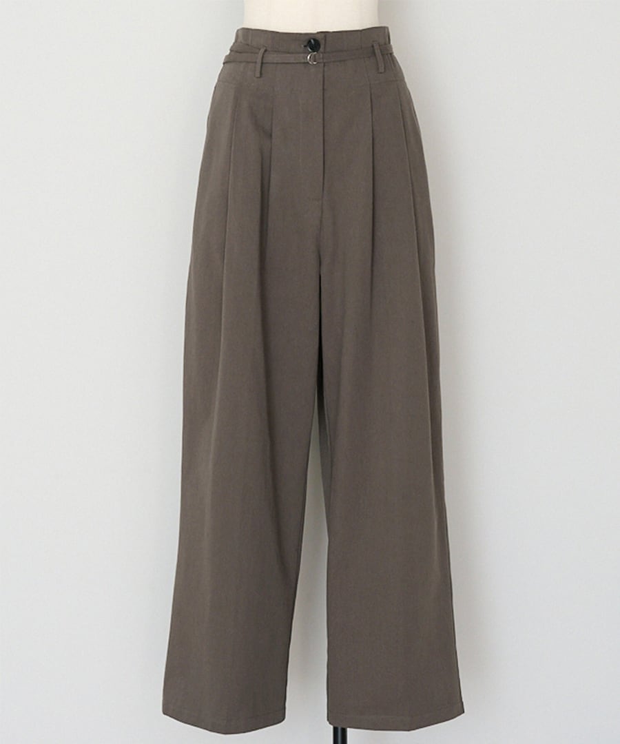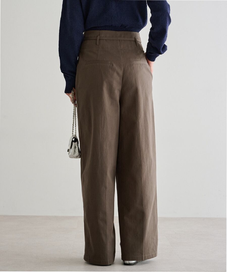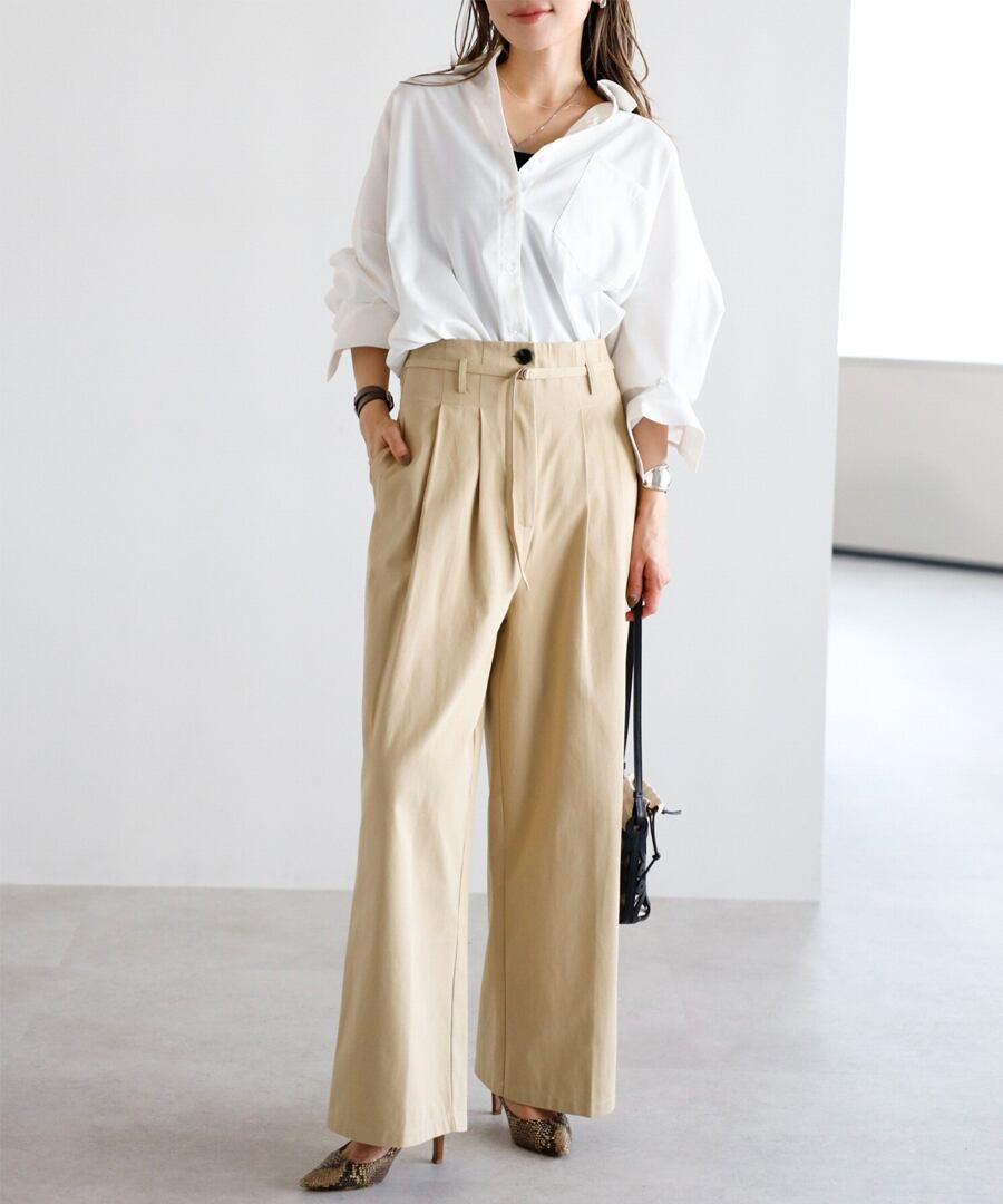 細ベルトが引き立てる、洗練ハイウエストタックパンツ