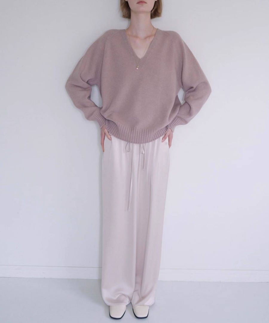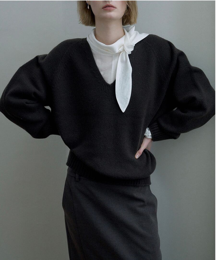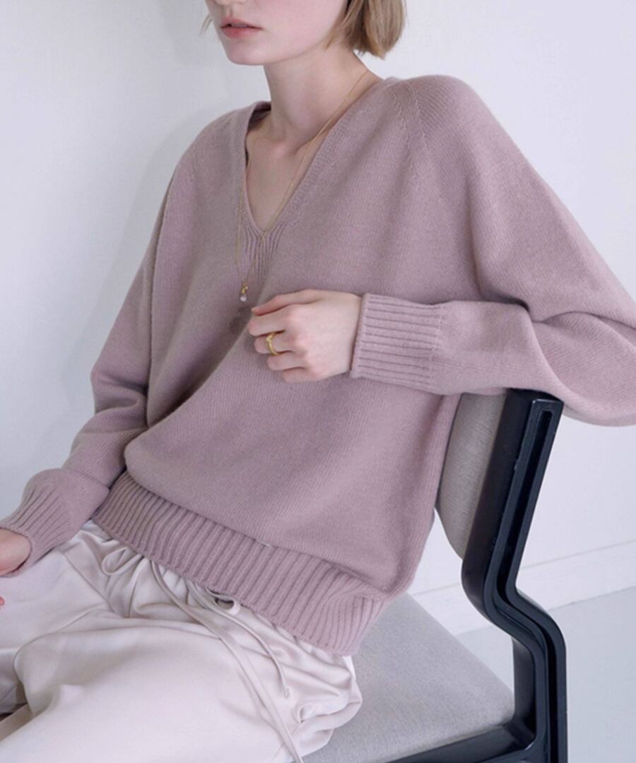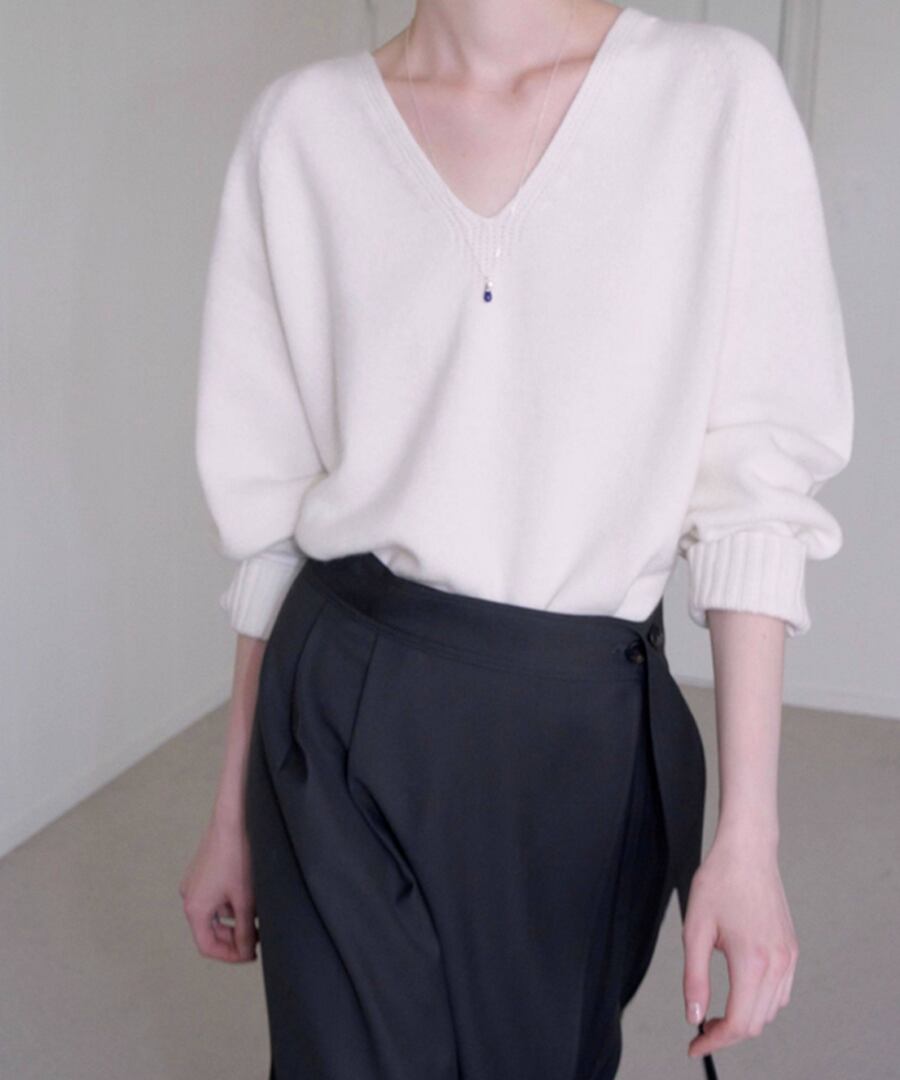 Vネックが顔周りをすっきり見せ、エレガントな印象を与える一着です。