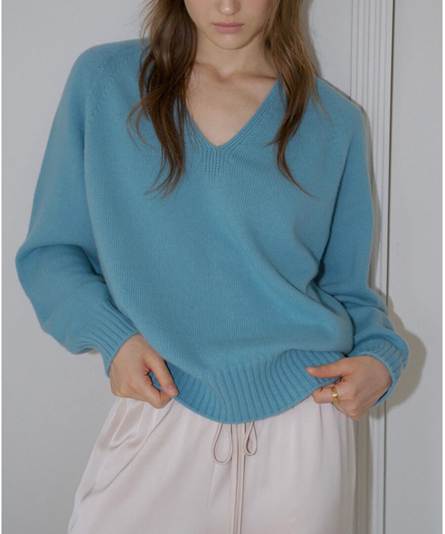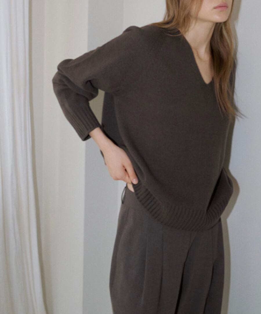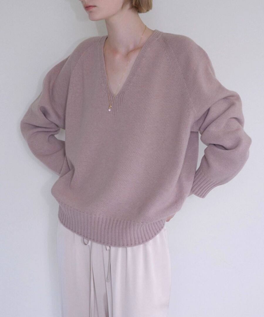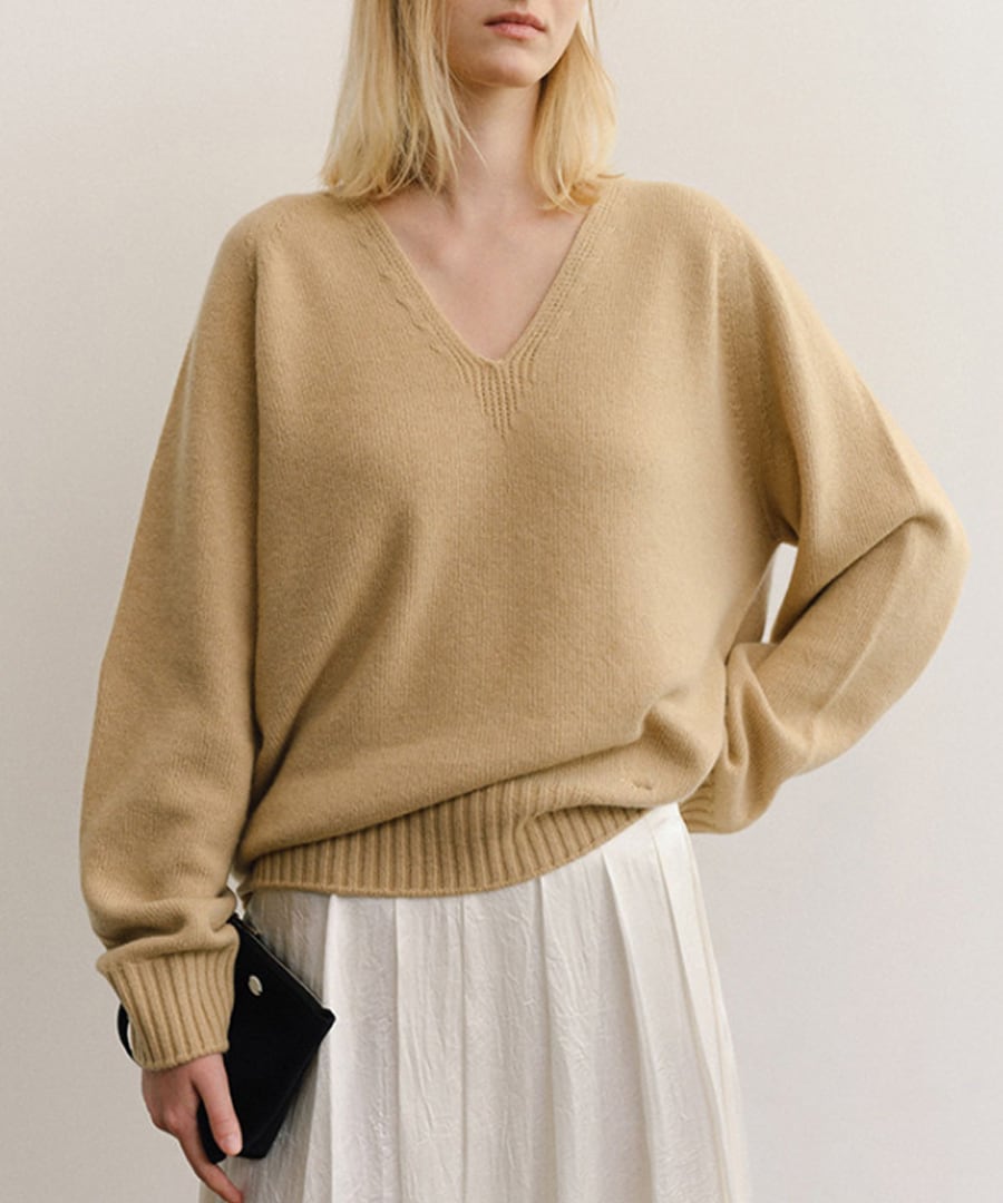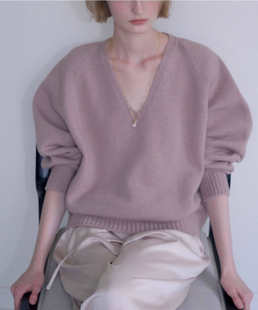 Vネックが顔周りをすっきり見せ、エレガントな印象を与える一着です。