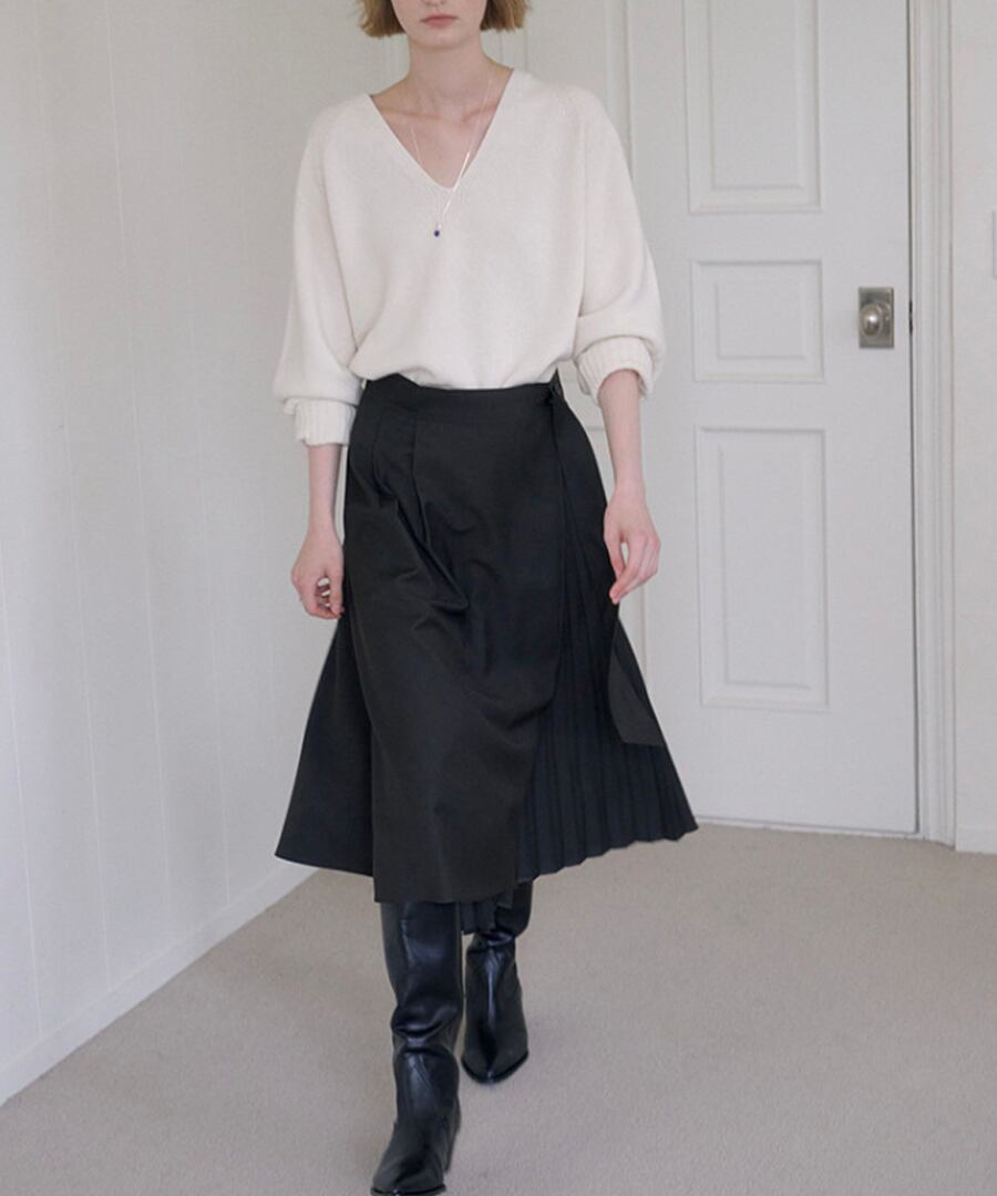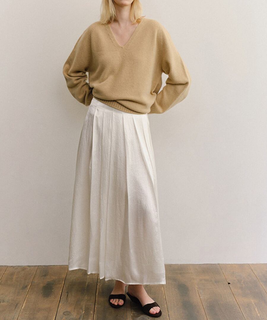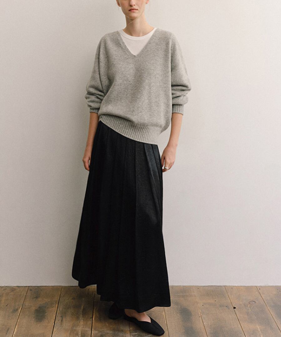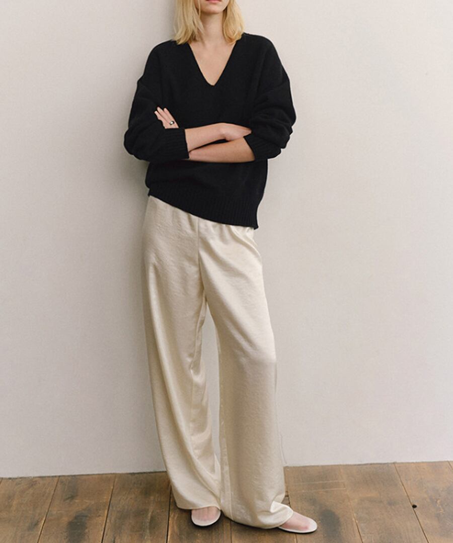 Vネックが顔周りをすっきり見せ、エレガントな印象を与える一着です。