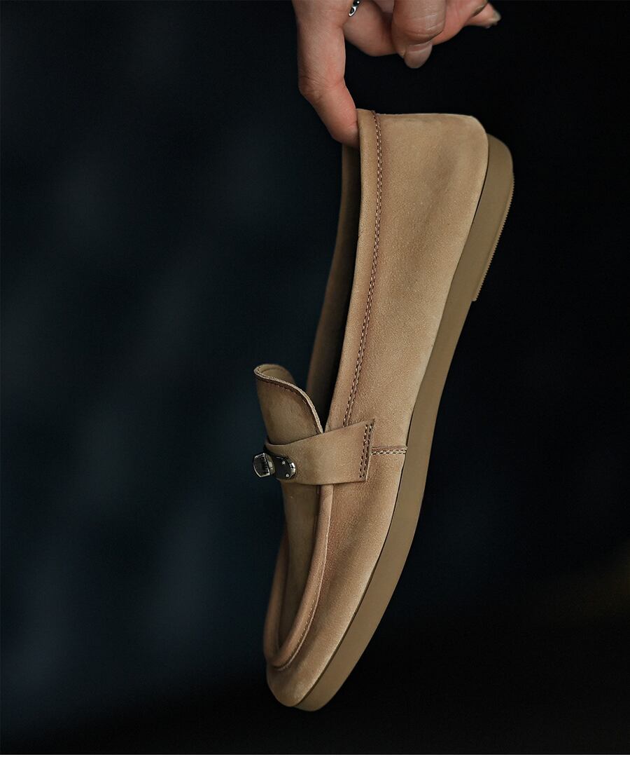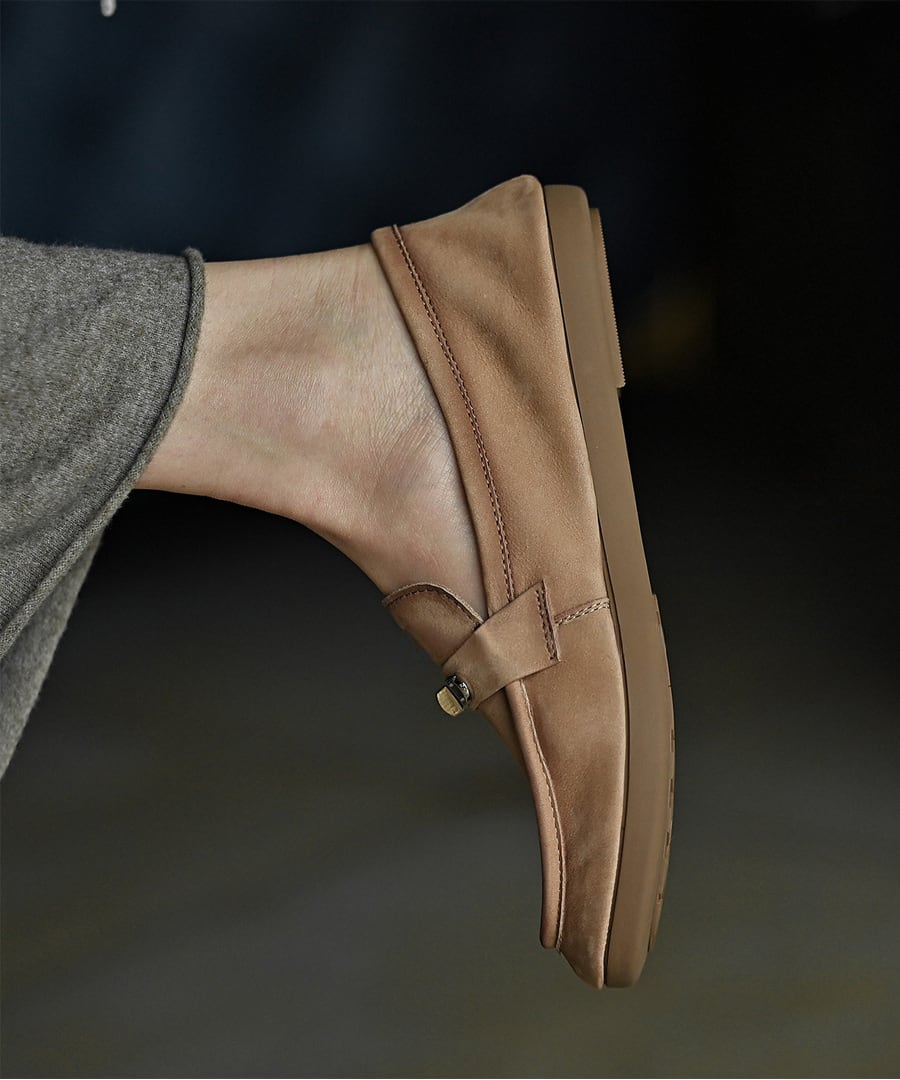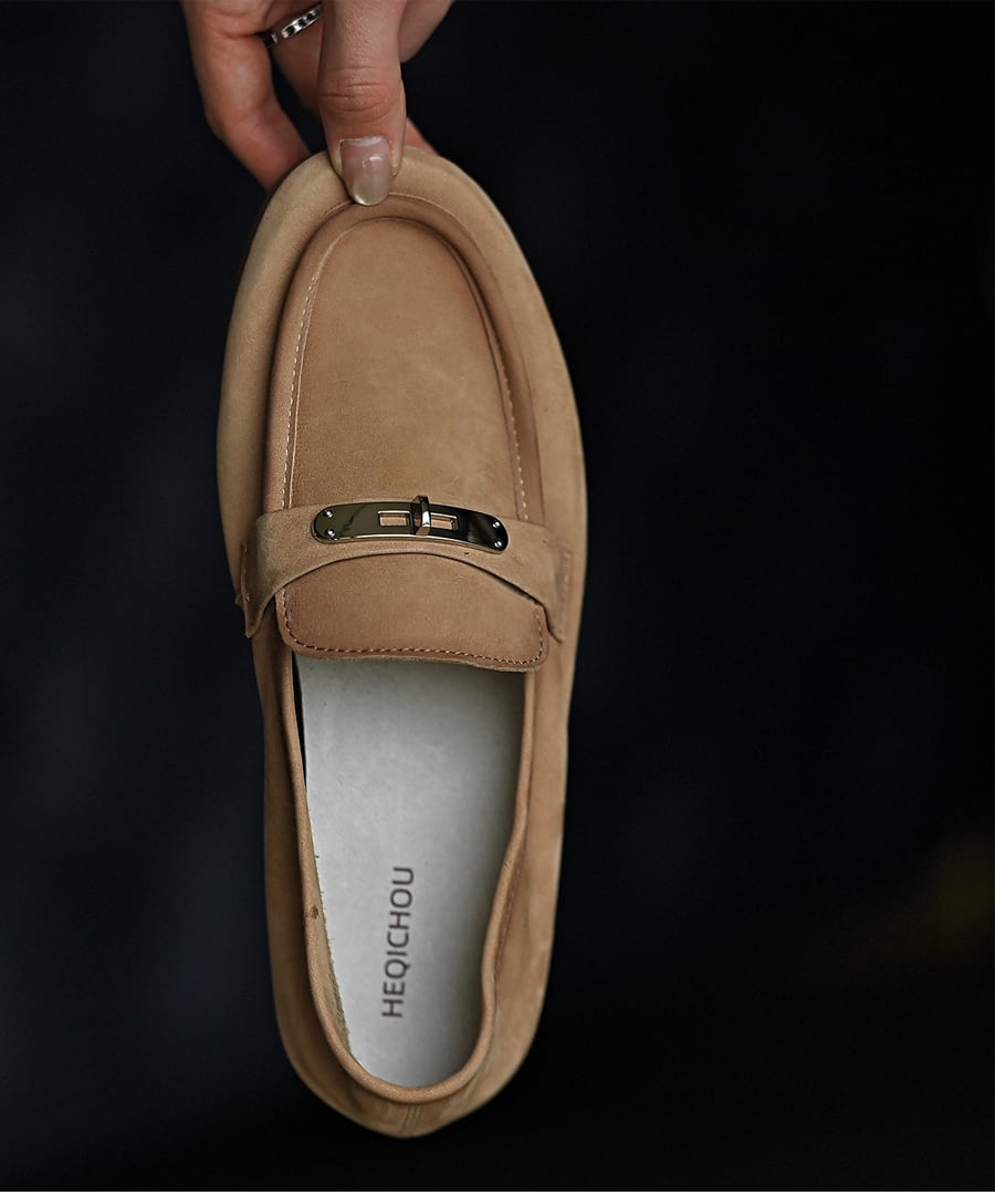 メタルバックル付きのラウンドトゥフラットローファーは、新しいスタイルを演出し、どんなコーディネートにも溶け込みます。