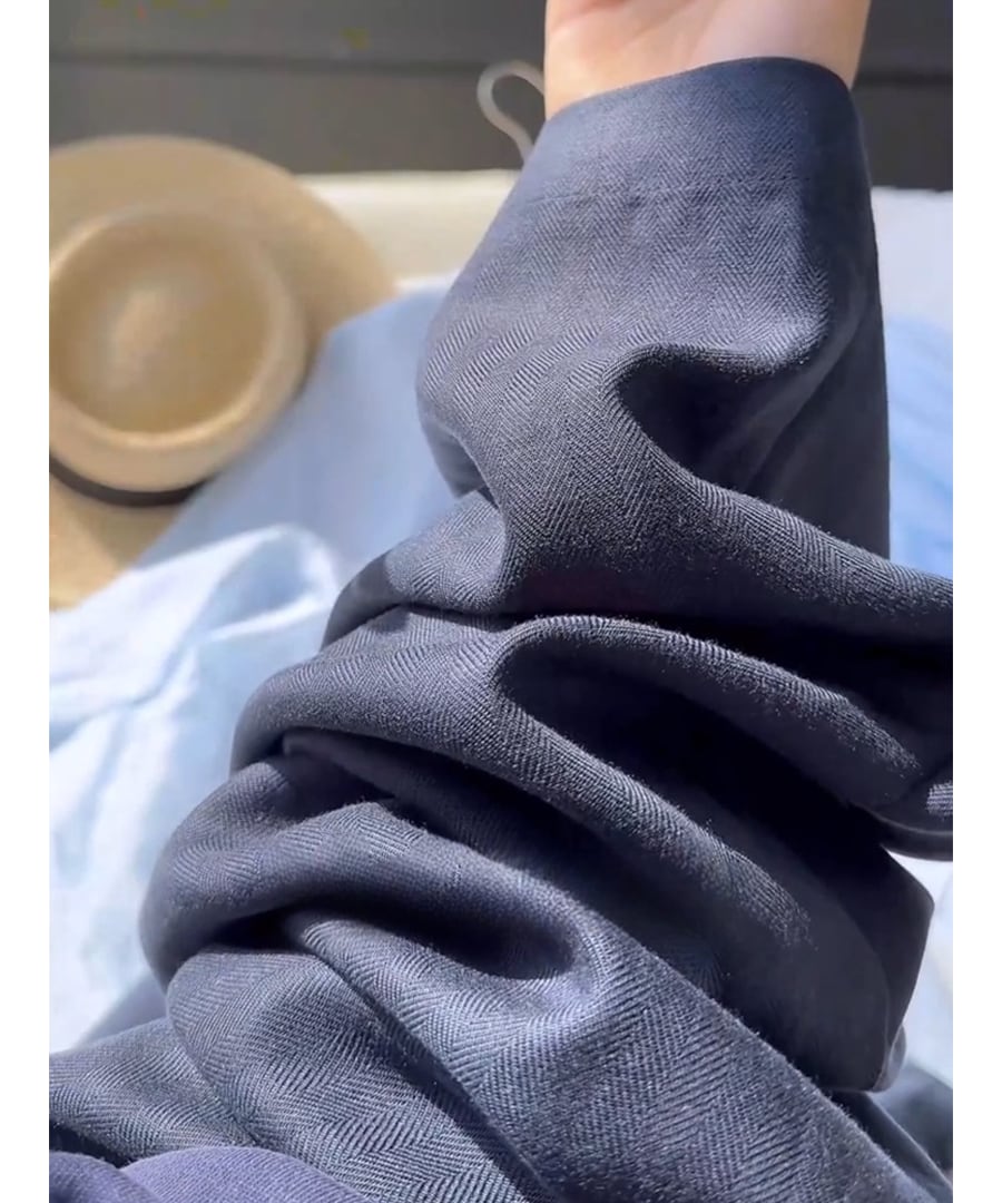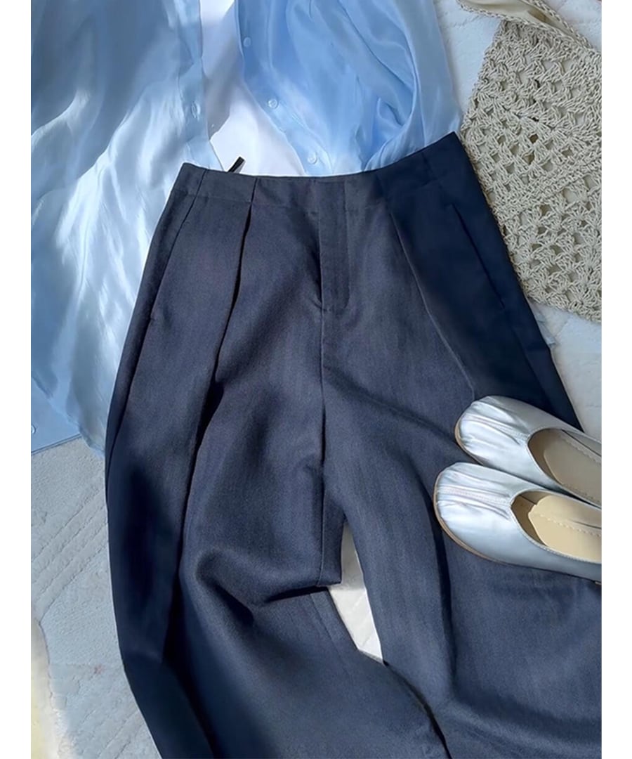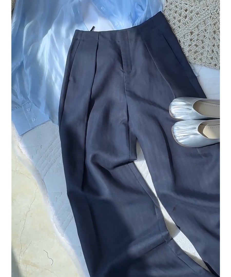 ハイウエストデザインとプリーツ入りで、体にフィットしないリラックスしたシルエットが印象的。
