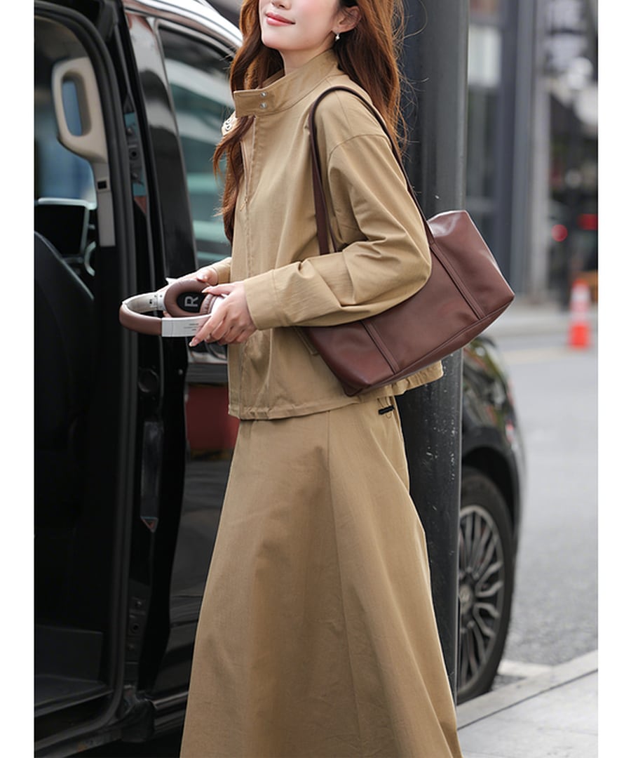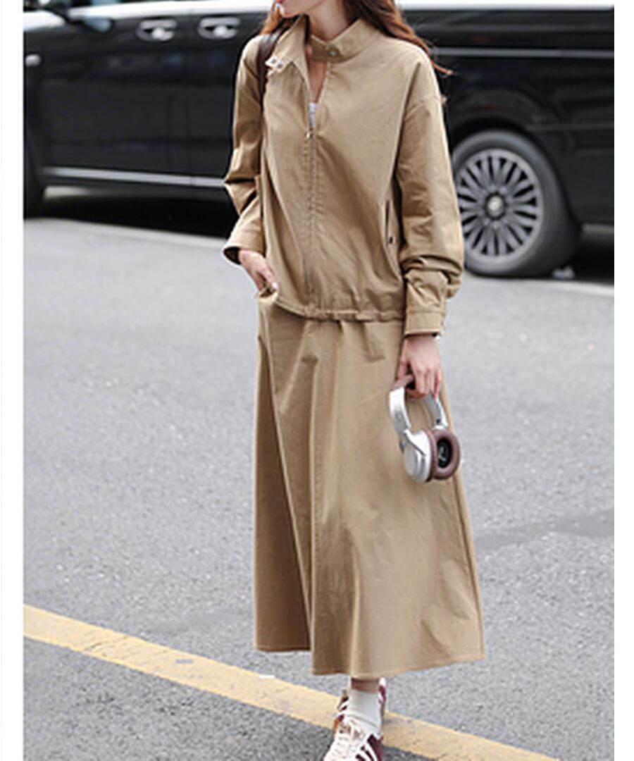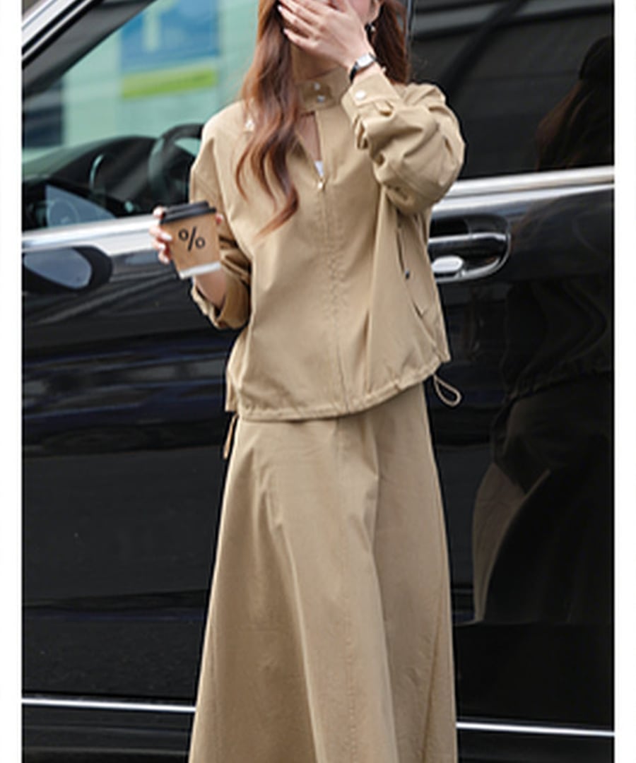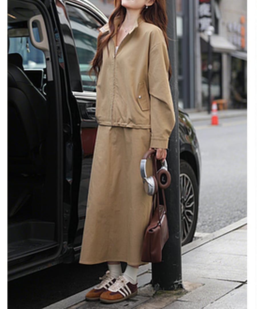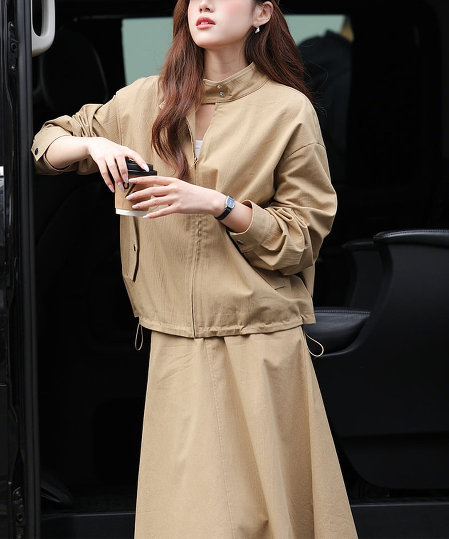 スタンドカラージャケットとAラインスカートがセットになった、カジュアルでありながら上品さも兼ね備えたツーピース。