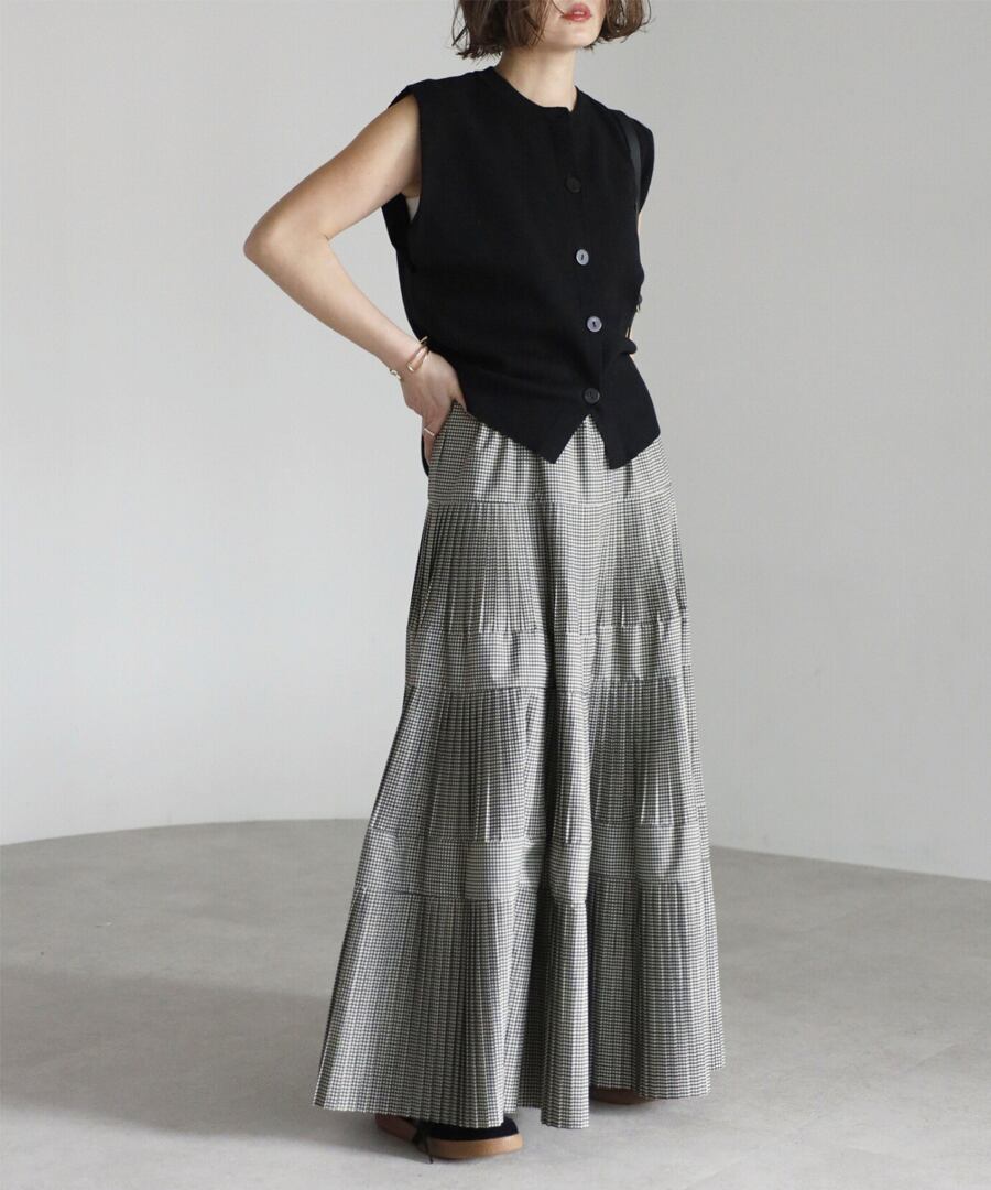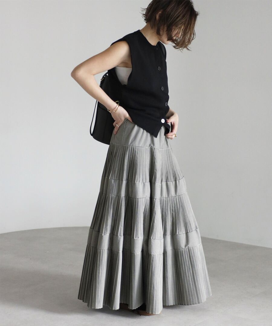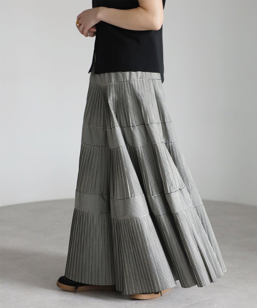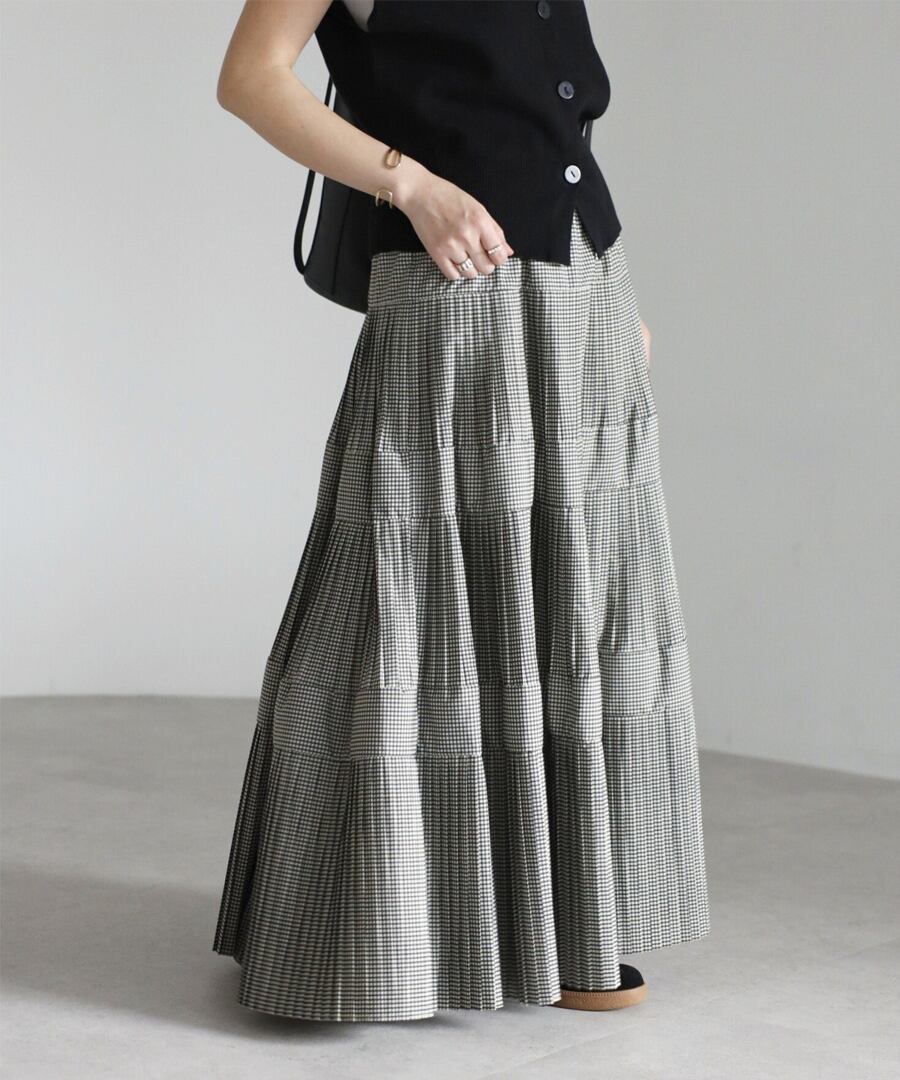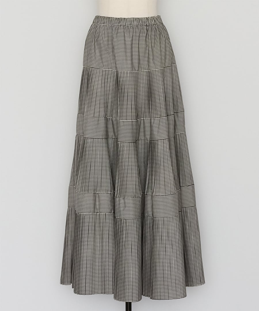 細かなプリーツを施したチェック柄のティアードフレアスカート。