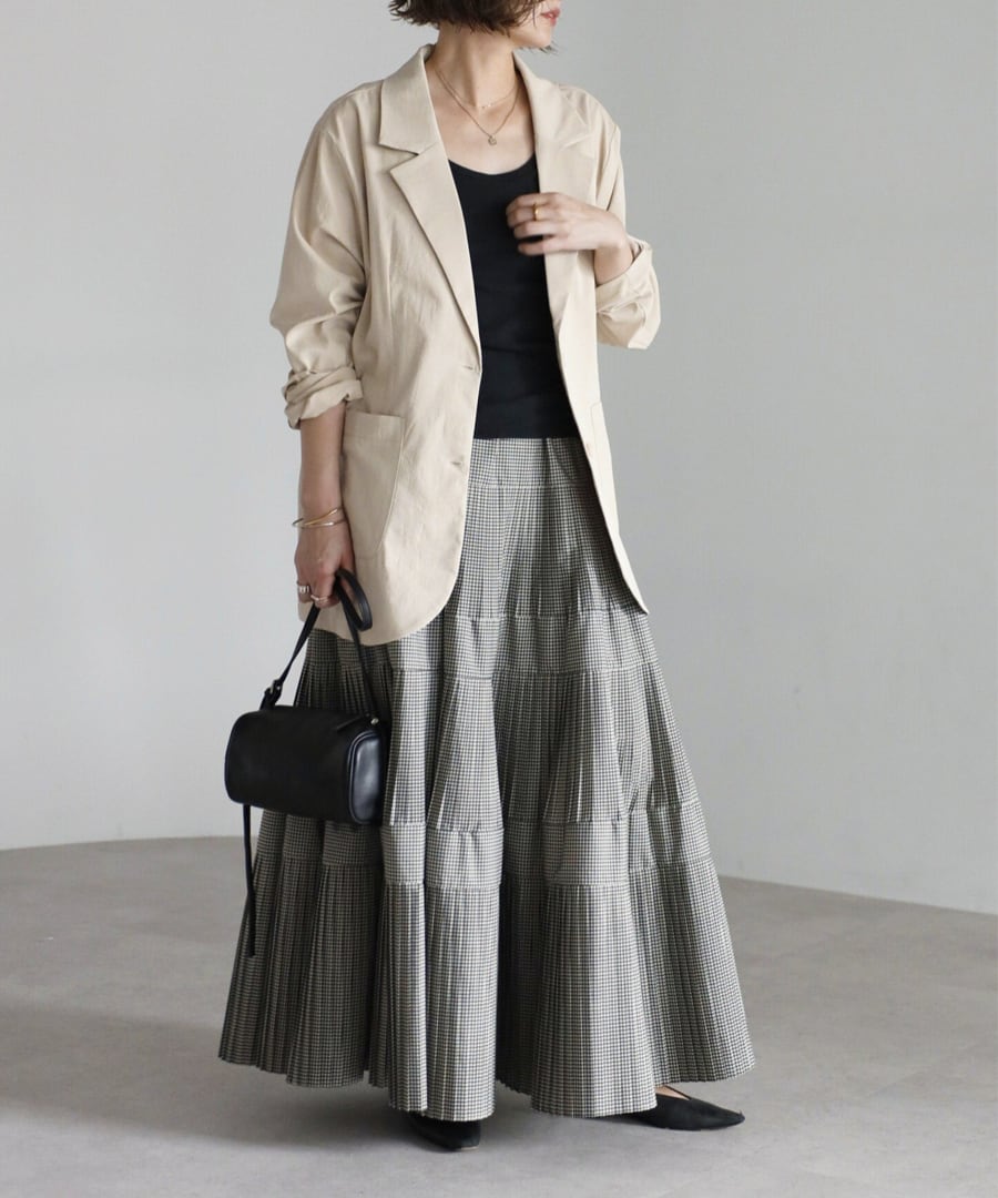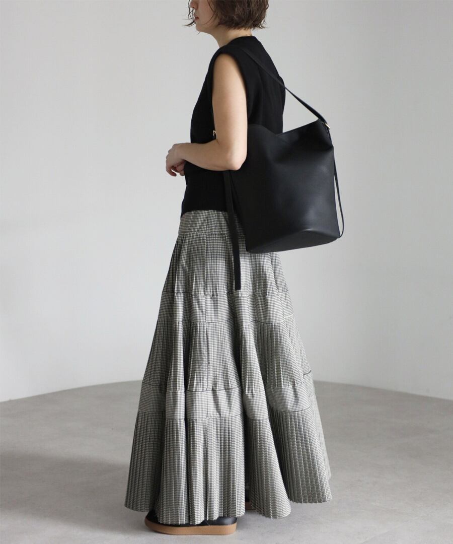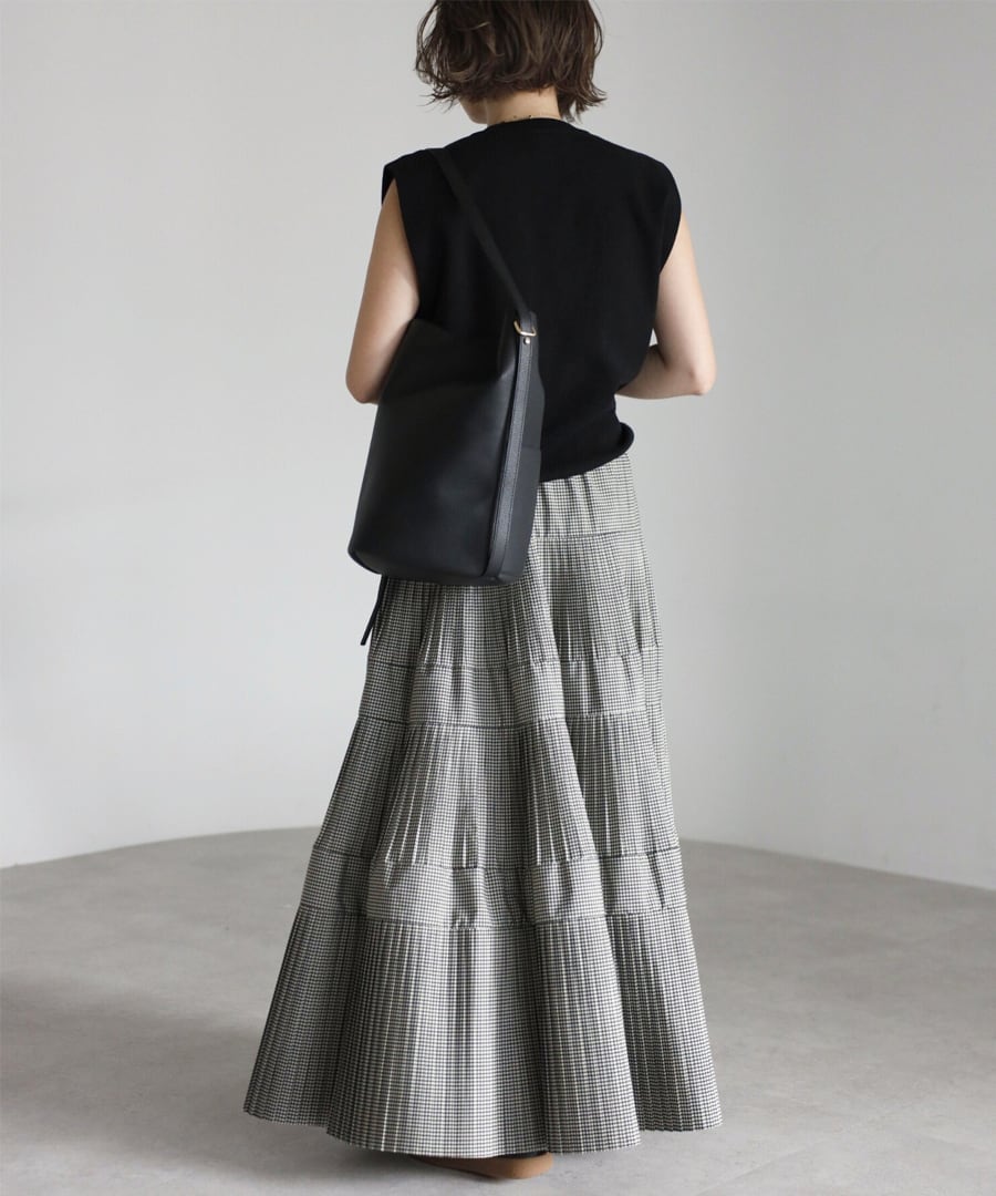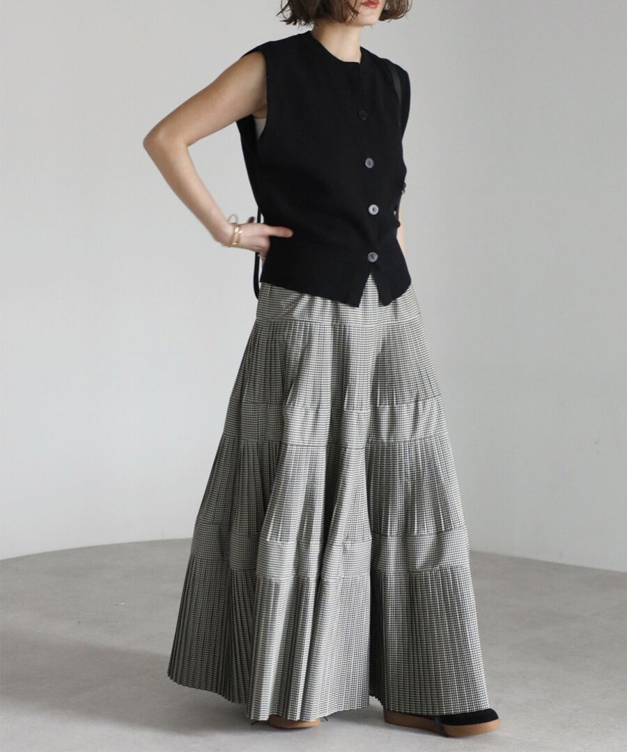 細かなプリーツを施したチェック柄のティアードフレアスカート。