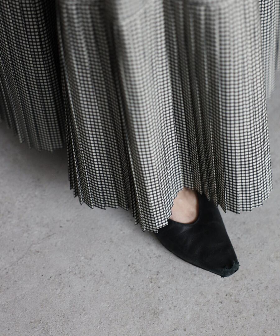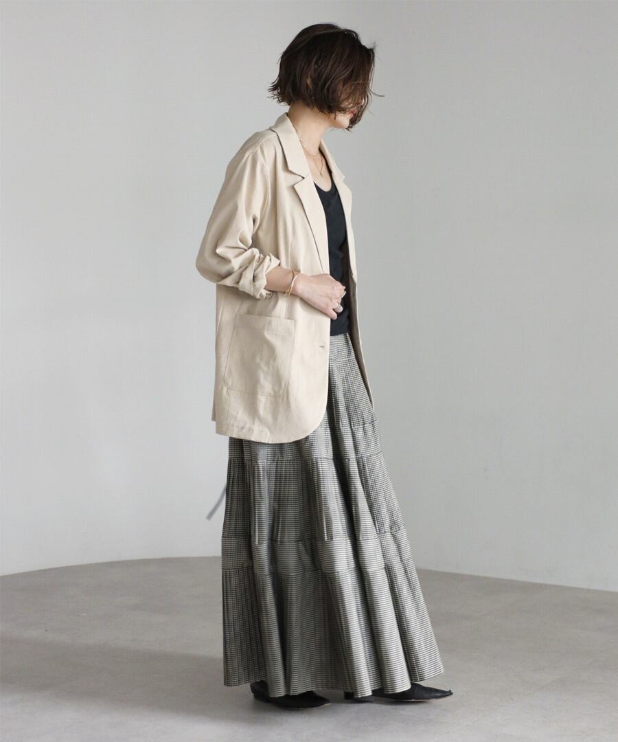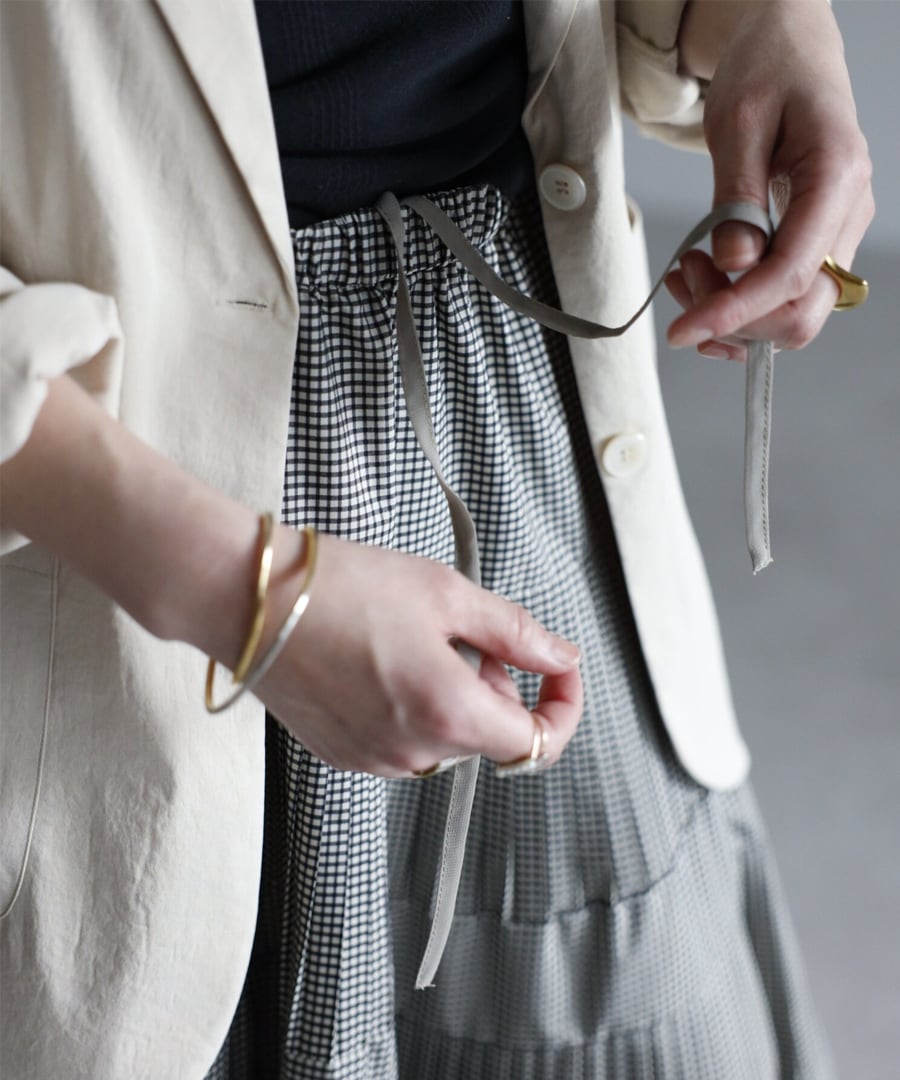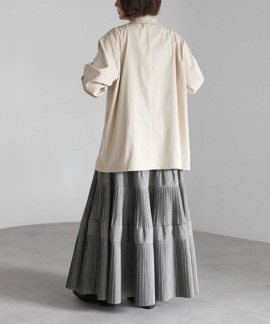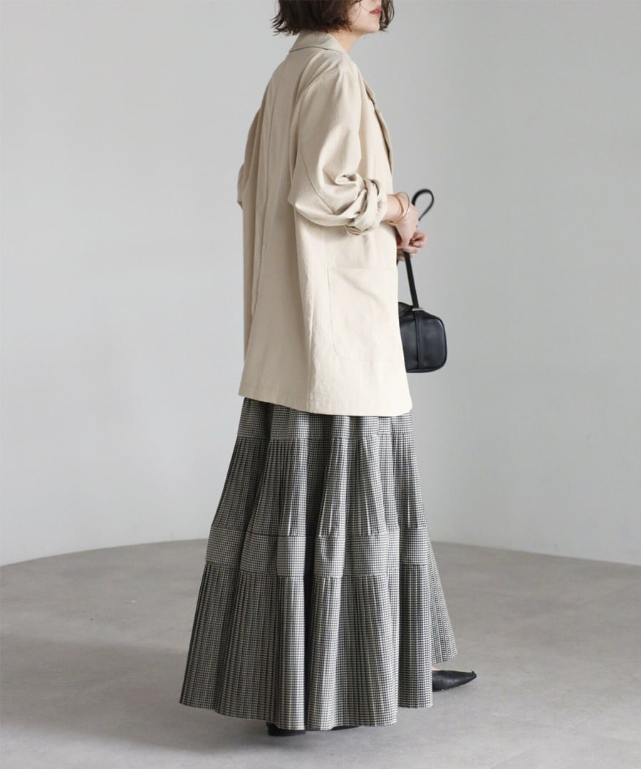 細かなプリーツを施したチェック柄のティアードフレアスカート。