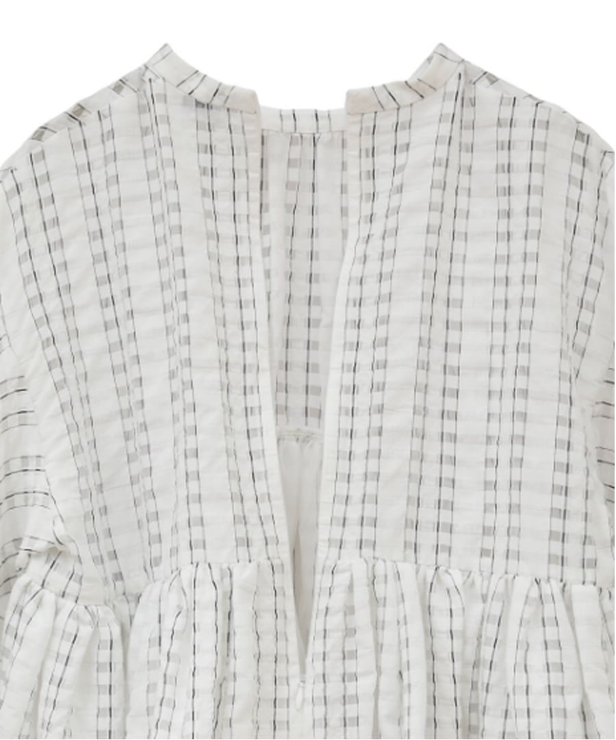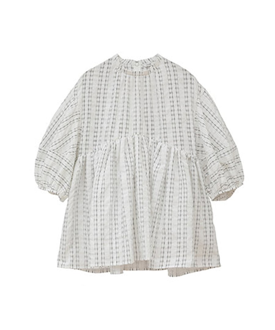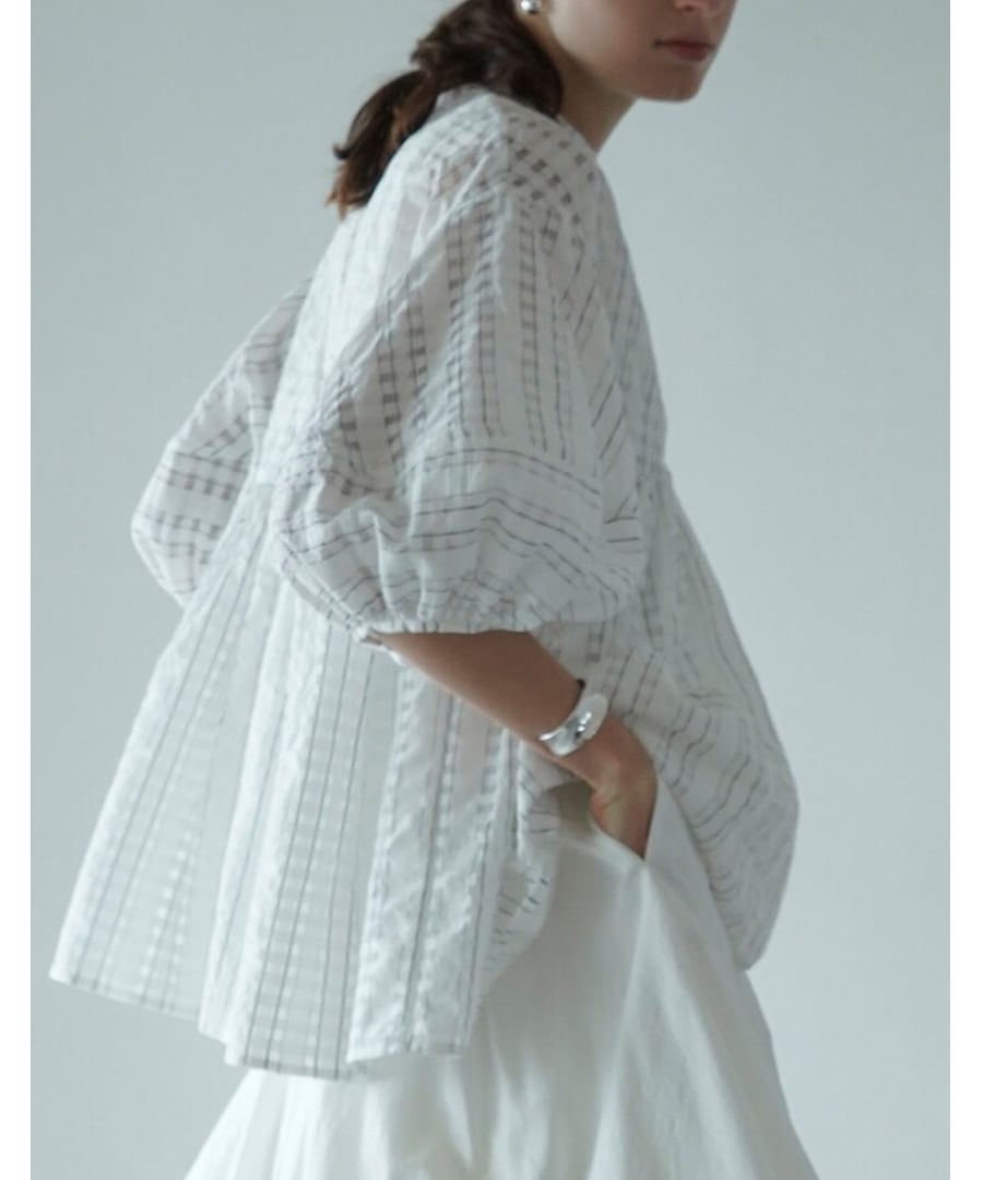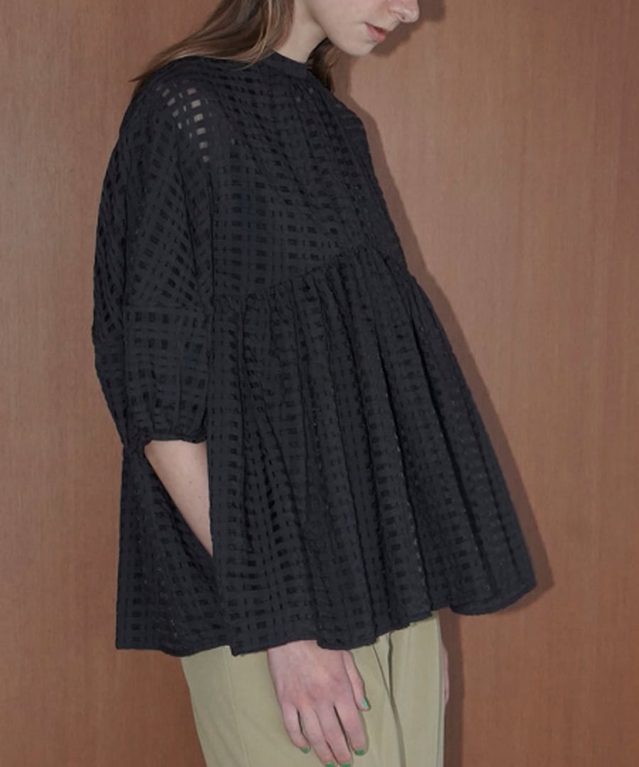 軽やかな透け感を楽しむ、スタンドカラーのチェックシャツ
