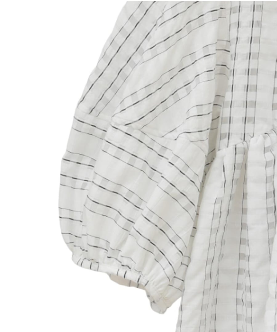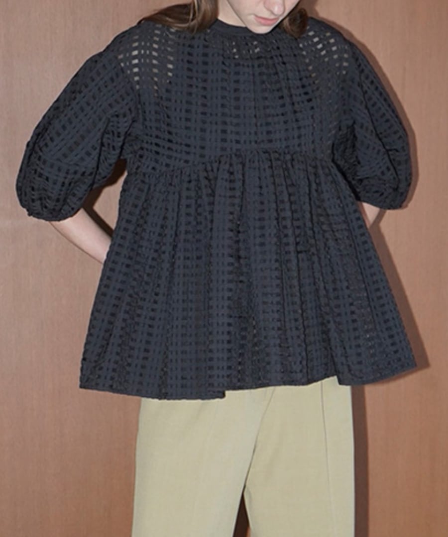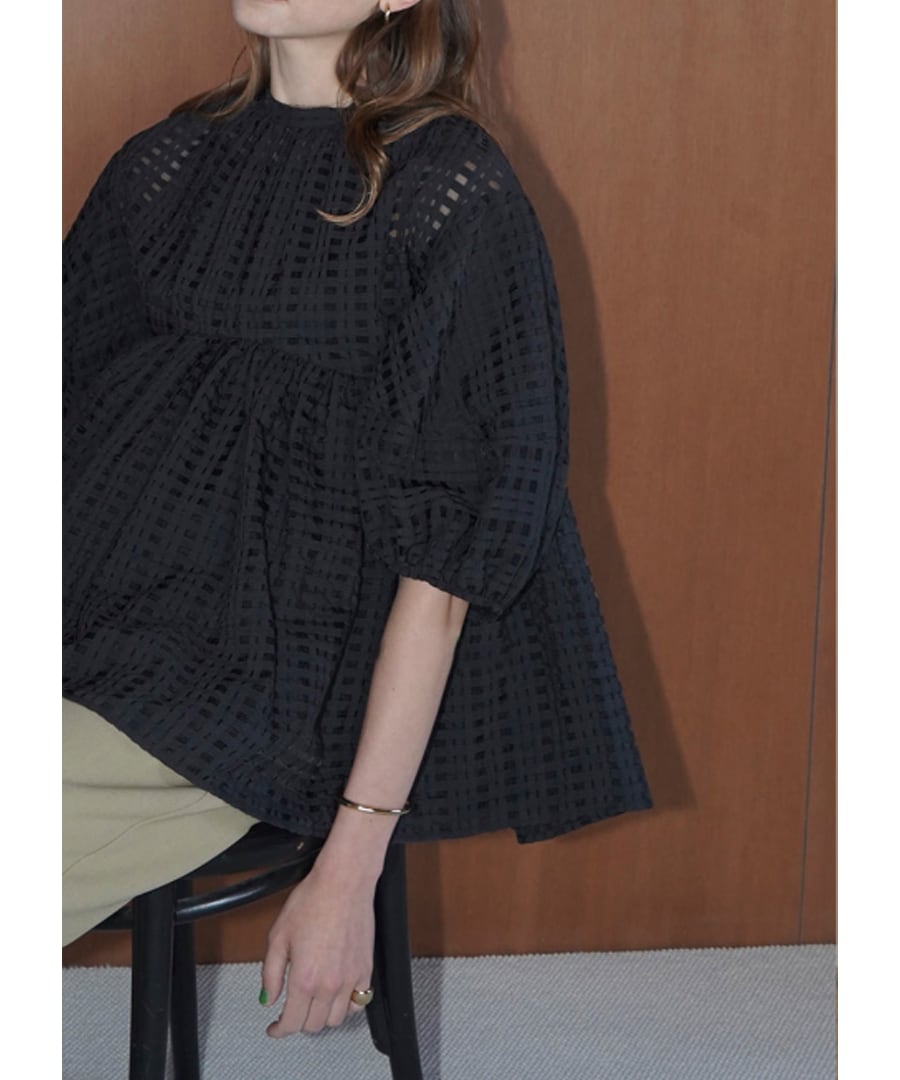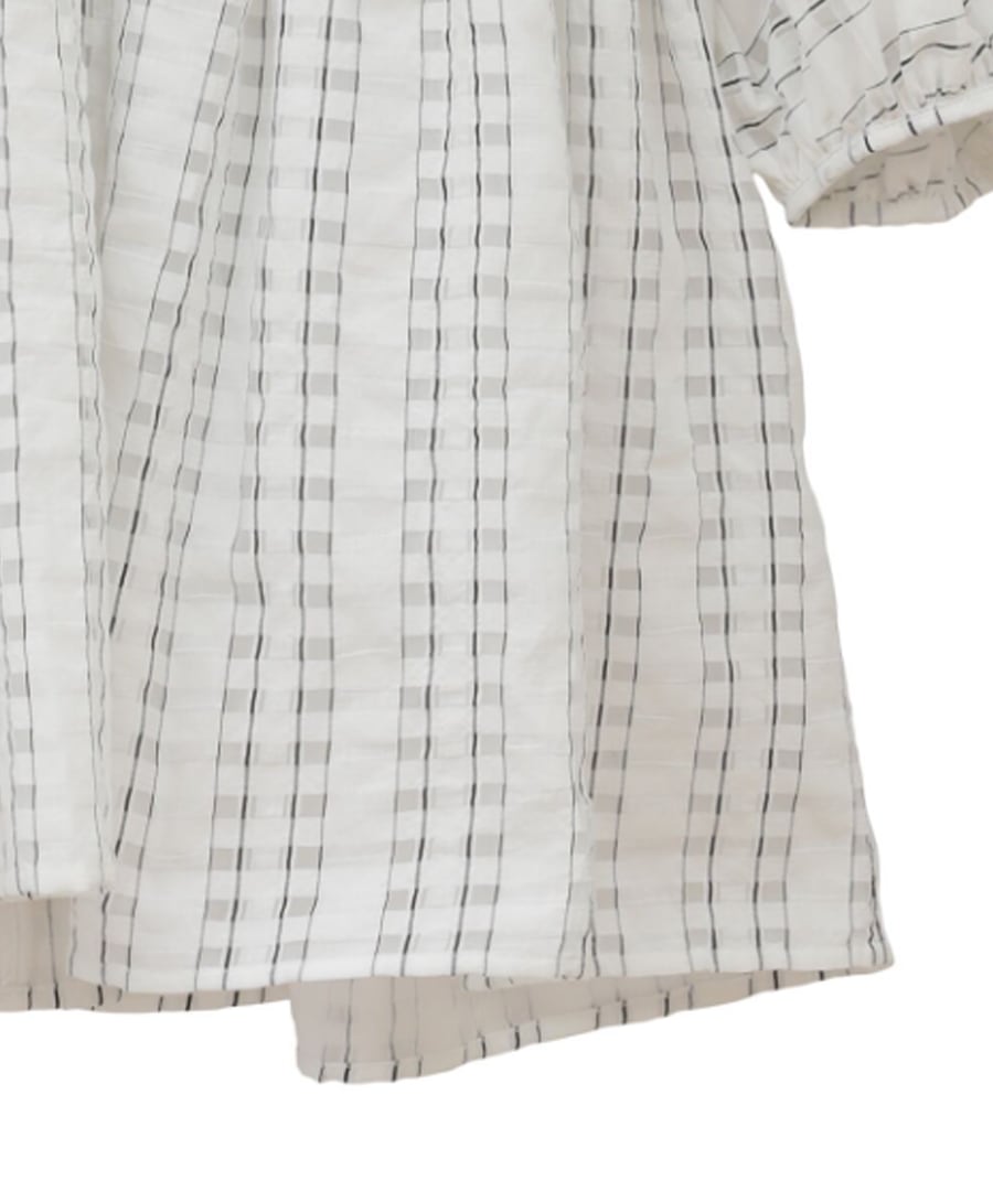 軽やかな透け感を楽しむ、スタンドカラーのチェックシャツ