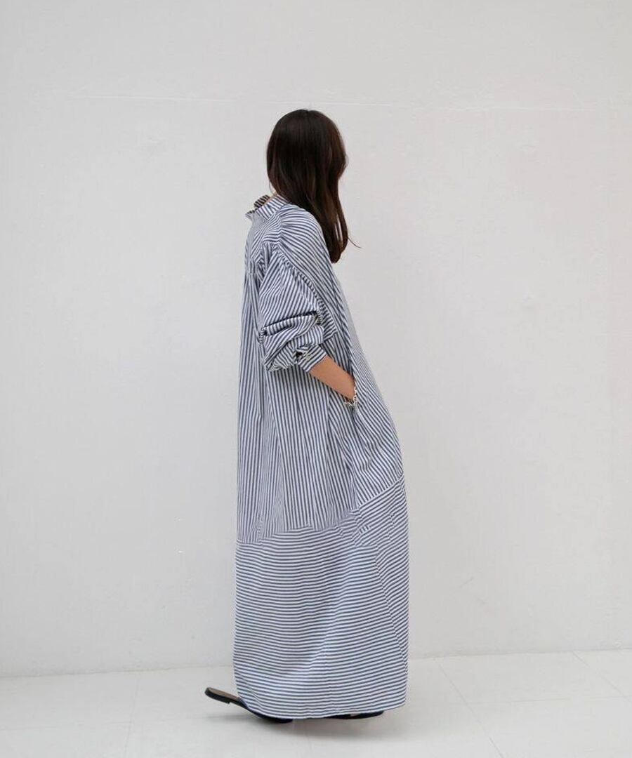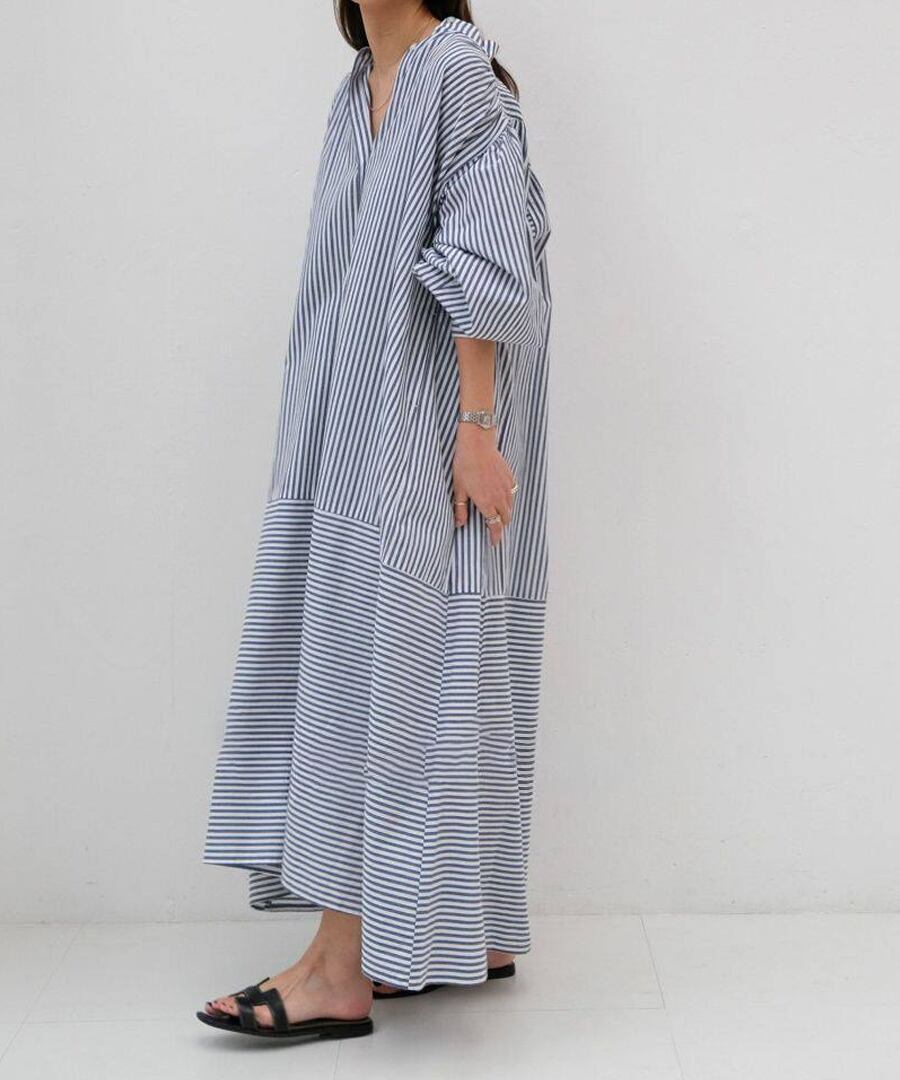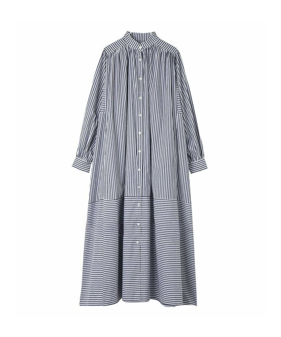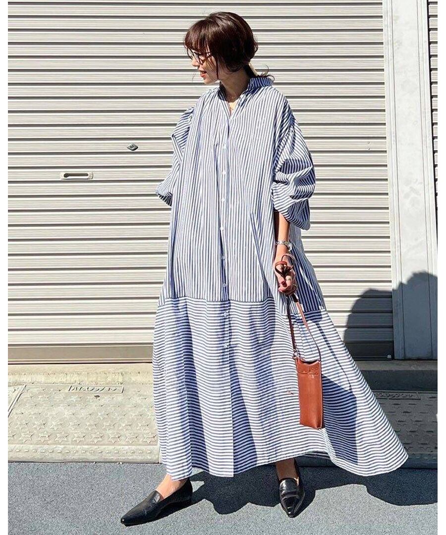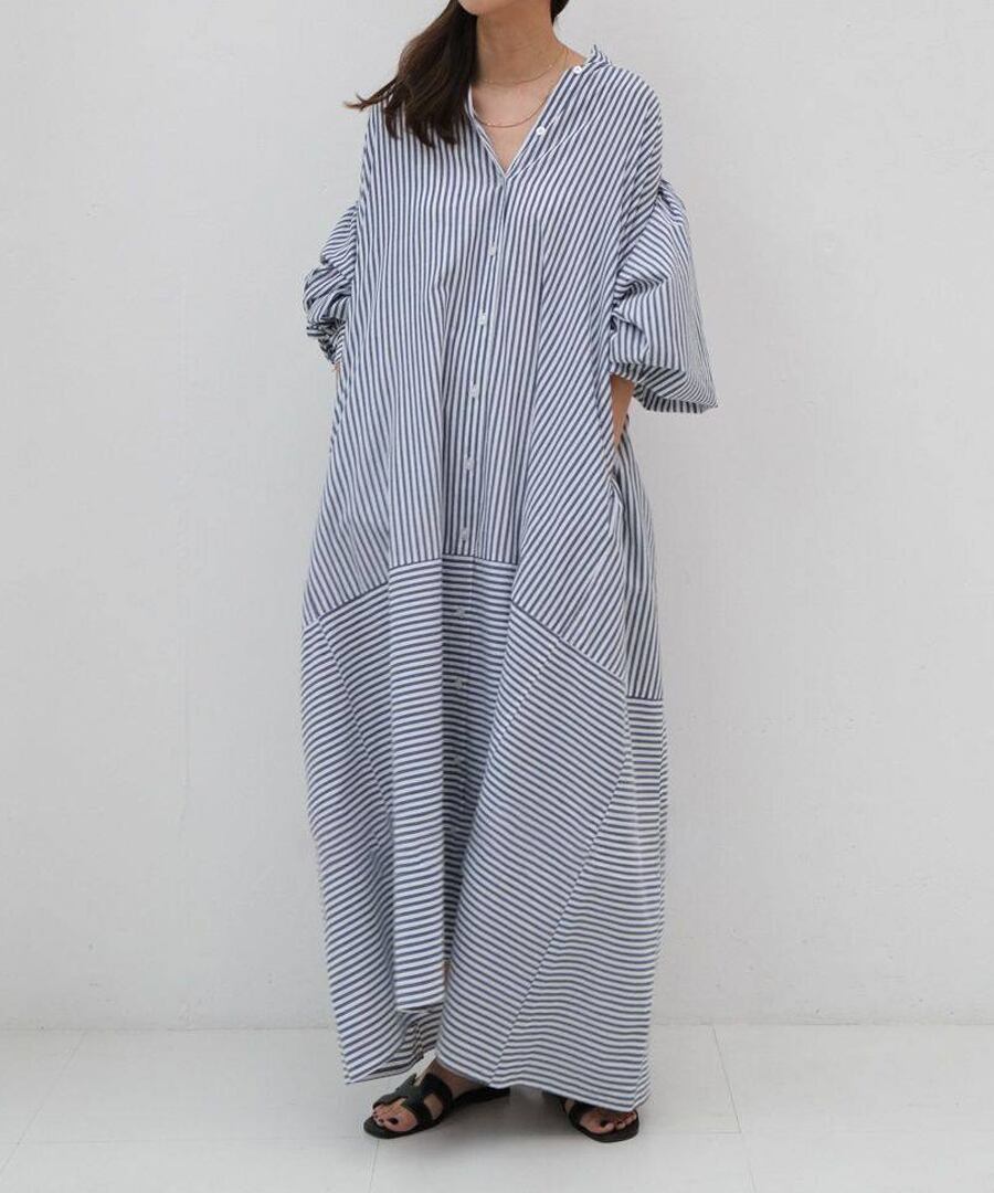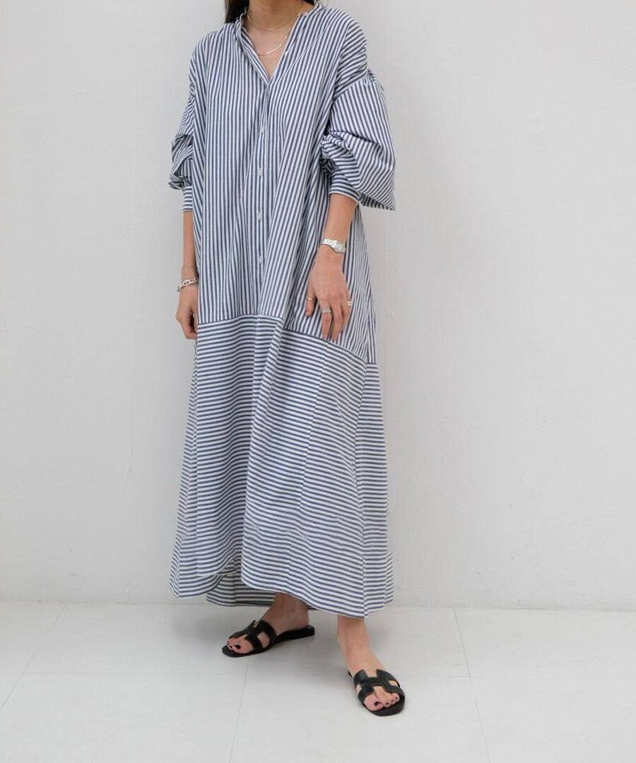フレンチレトロ風ランタンスリーブデザインのストライプシャツワンピース。